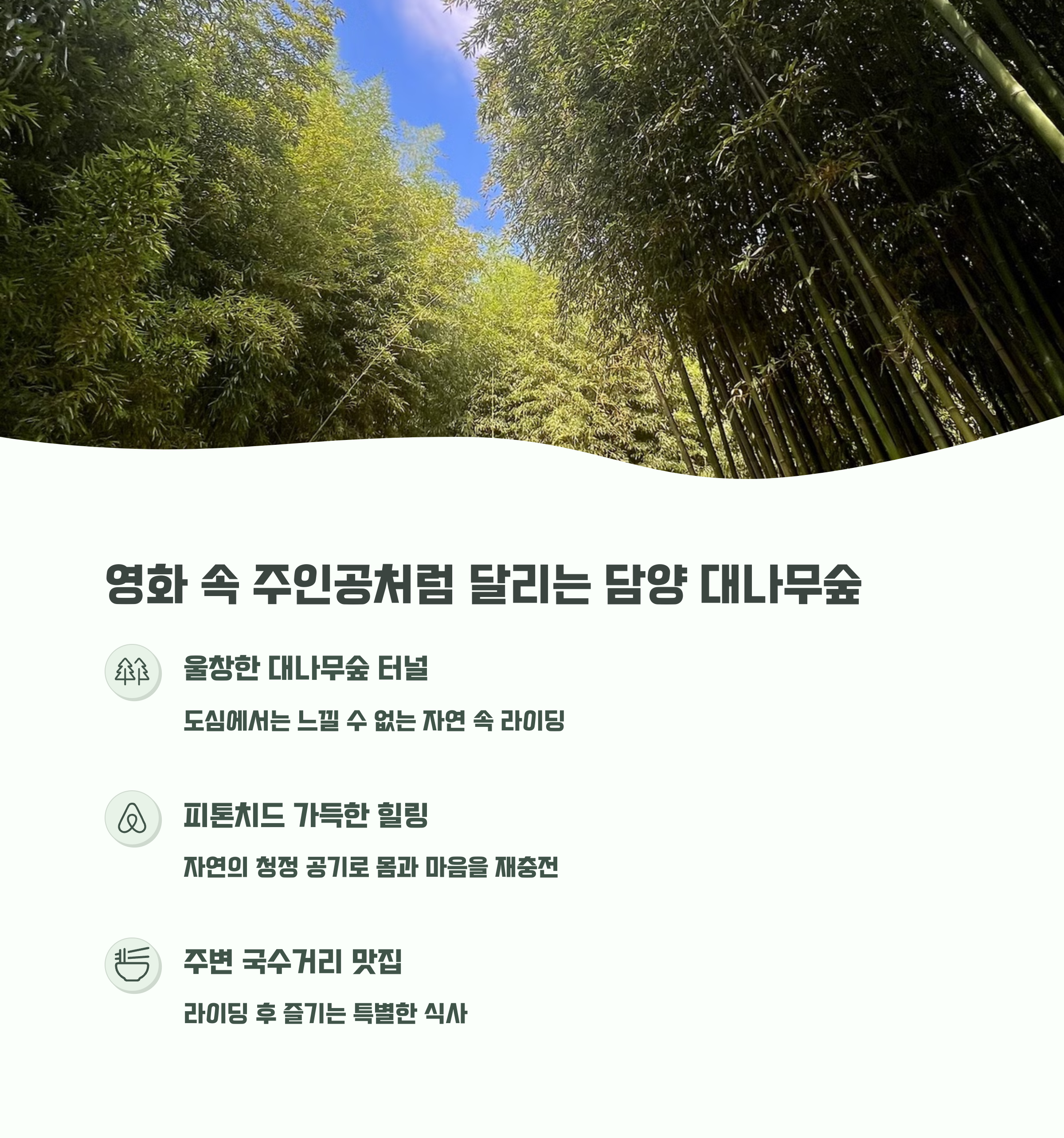 전남의 대나무 자전거길은 단순한 운동을 넘어 풍경과 감성, 자연의 힐링까지 함께 누릴 수 있는 특별한 경험입니다. 담양과 구례, 각각의 매력을 느끼며 계절에 따라 달라지는 풍경 속에서 자연과 함께하는 여유로운 라이딩 여행을 떠나보세요.