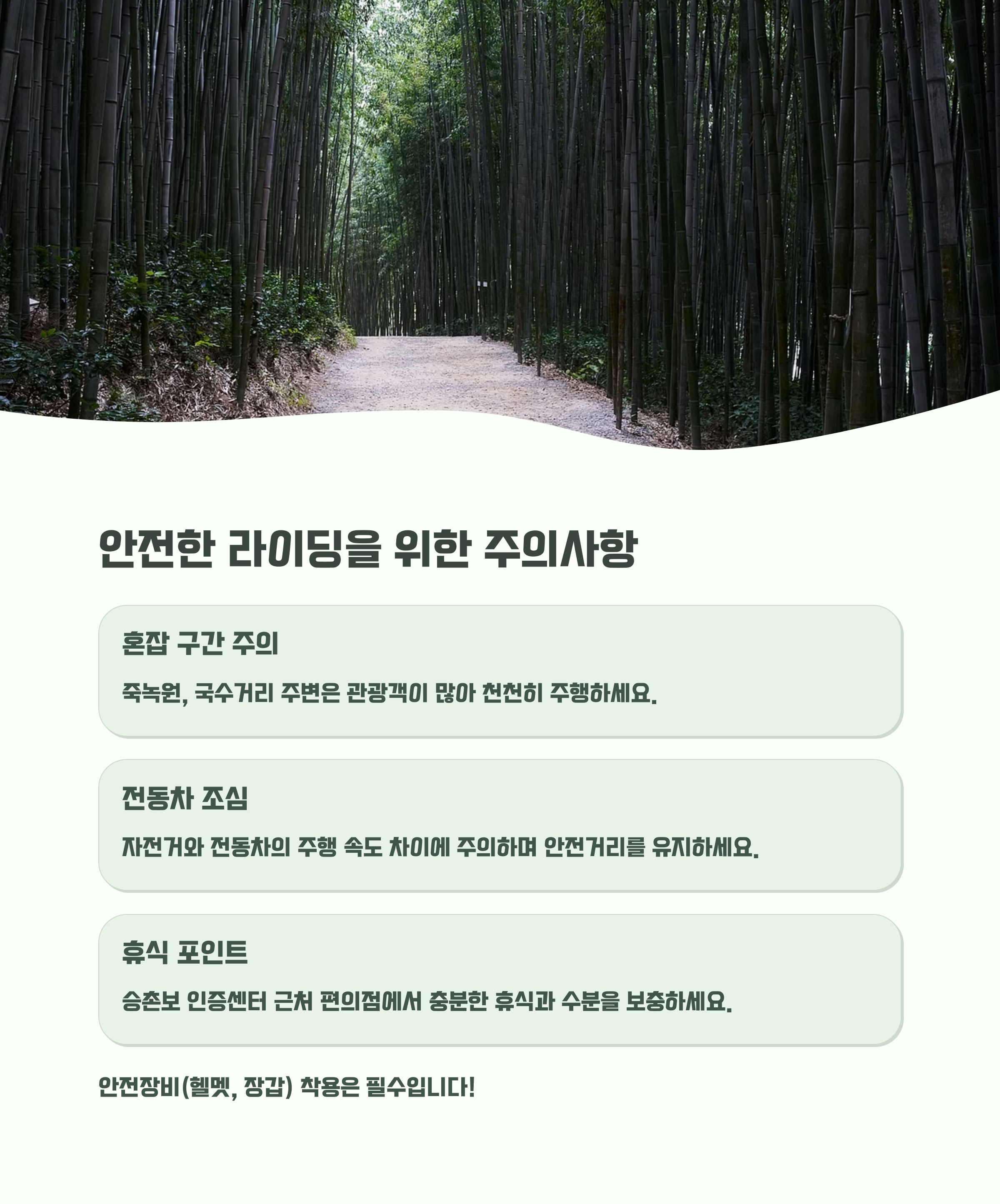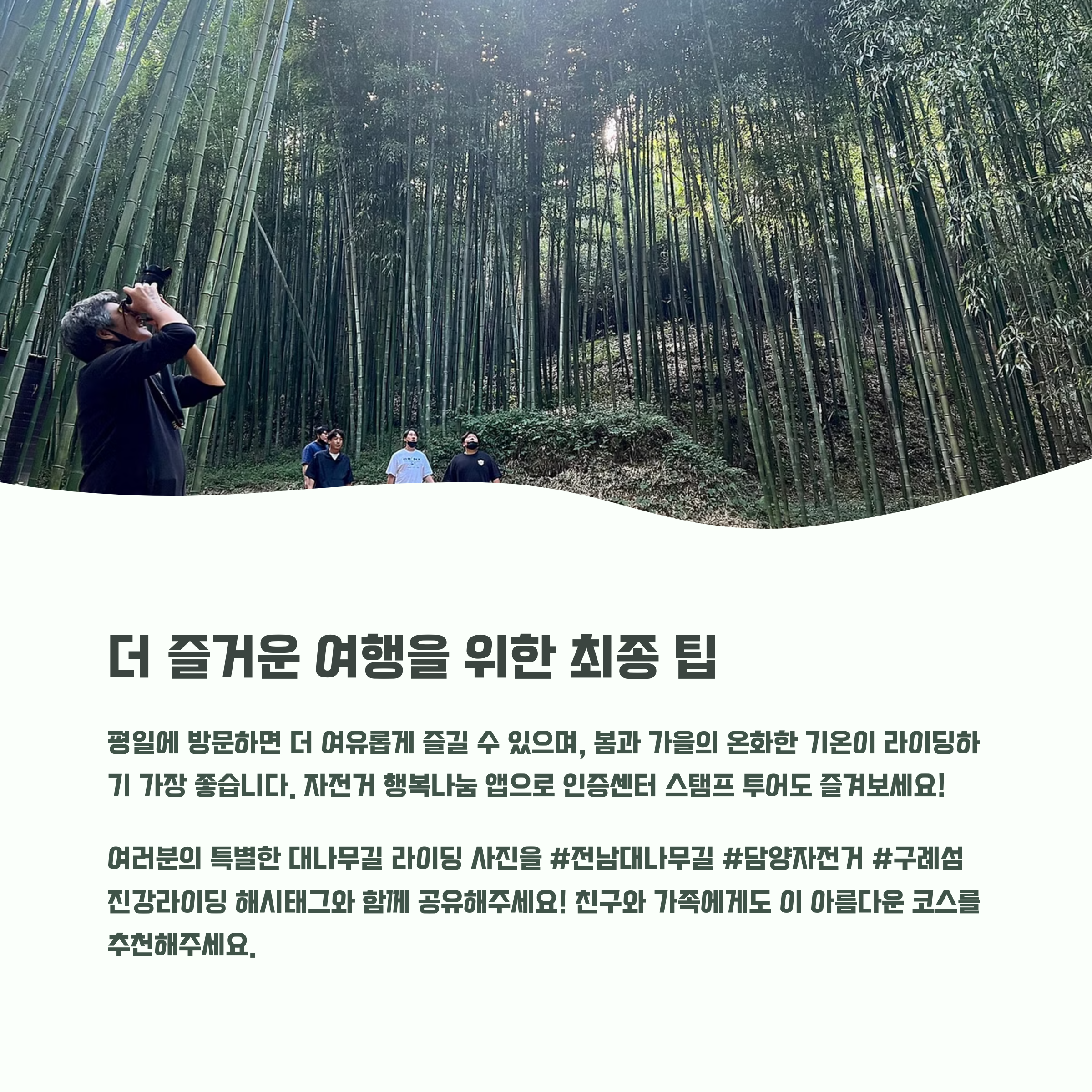 담양 죽녹원의 숲길, 구례 섬진강변의 봄 벚꽃길 등 기억에 남는 코스와 꿀팁을 댓글로 나눠주세요. 라이딩 계획 중인 분들에게 유용한 정보가 될 거예요!