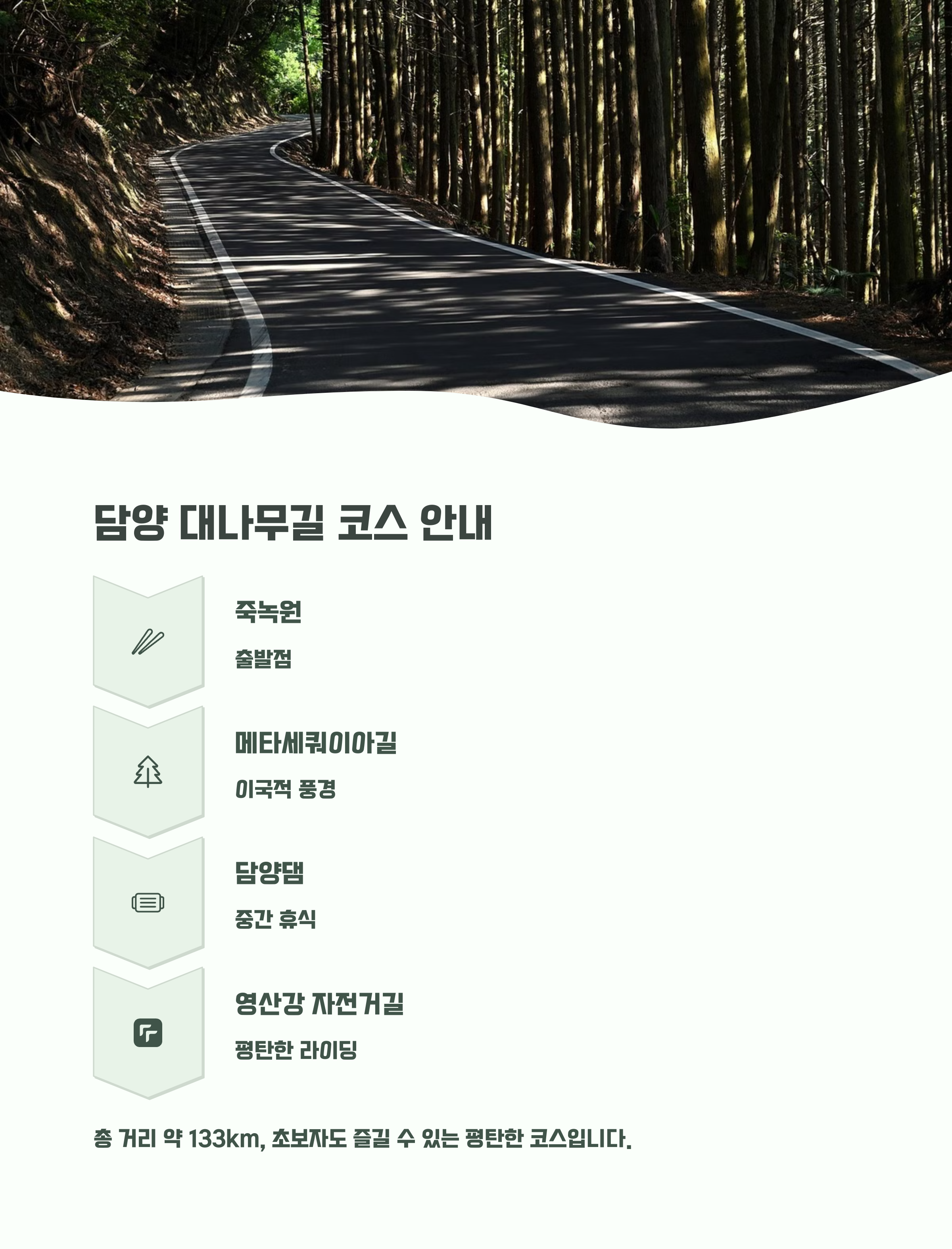 담양 자전거길은 죽녹원에서 메타세쿼이아길을 지나 담양댐과 영산강 자전거길까지 이어지는 코스로, 대나무숲과 가로수길을 달리는 감성적인 풍경이 인상적입니다. 코스는 전반적으로 평탄하고 초보자도 무리 없이 주행 가능하지만, 관광객과 전동차 통행이 많아 안전 주의가 필요합니다. 자전거 대여는 죽녹원 주변에서 쉽게 가능하며, 산책과 포토존 촬영도 함께 즐길 수 있습니다.