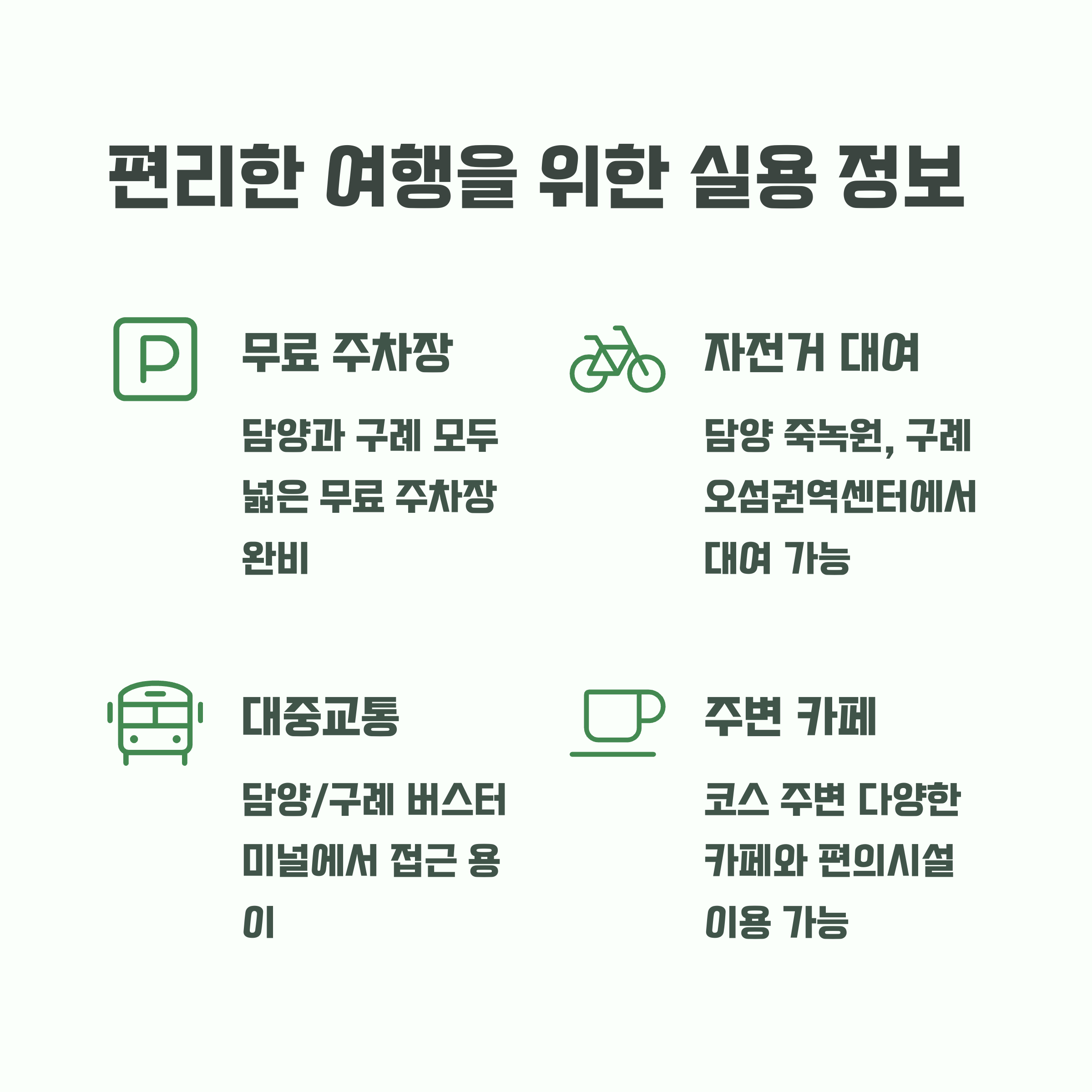 담양 코스는 감성 숲길+도심형 자전거길, 구례 코스는 강변형+조용한 산책길 느낌으로 분위기가 확연히 다릅니다. 두 곳 모두 주차장, 화장실, 카페 등 편의시설이 잘 갖춰져 있으며, 평일 방문 시 쾌적한 라이딩이 가능합니다. 하루 일정으로 두 곳을 나누어 즐겨보는 것도 추천드립니다.