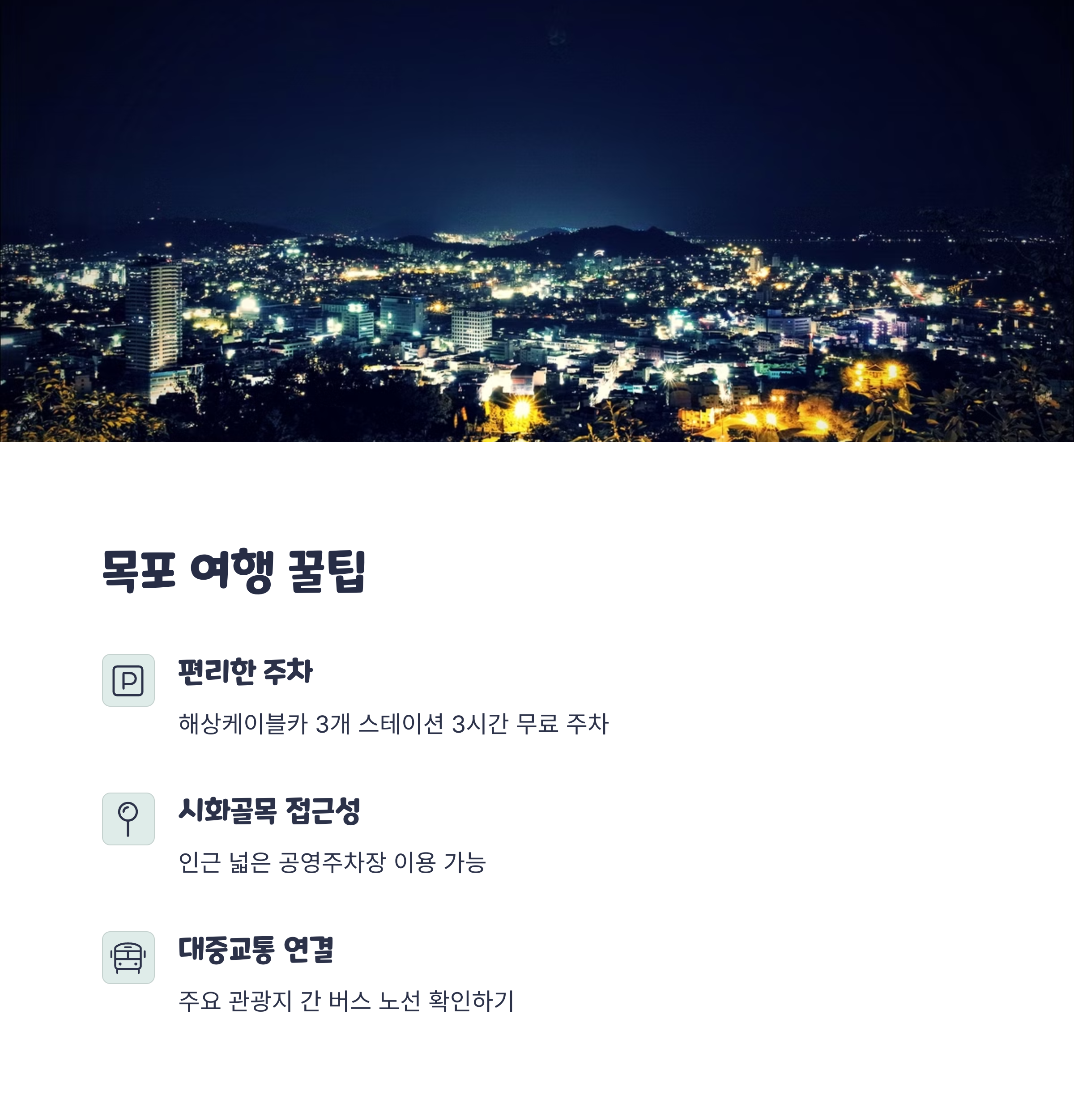 대부분의 관광지는 버스나 택시로 10분 거리 이내로 이동 가능하며, 유달산~시화골목~해안산책로는 도보 이동으로 연결돼 있어 도보 여행에도 적합합니다.
