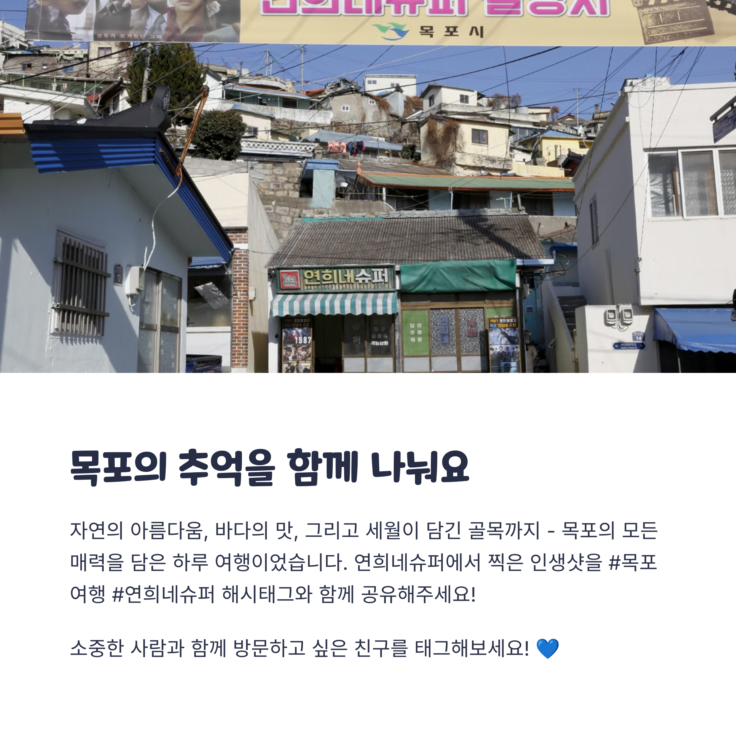 목포 여행 중 감명 깊었던 장소나, 나만 아는 맛집, 감성 카페 등이 있다면 댓글로 공유해 주세요! 함께 목포 여행을 더 풍성하게 만들어봐요.
