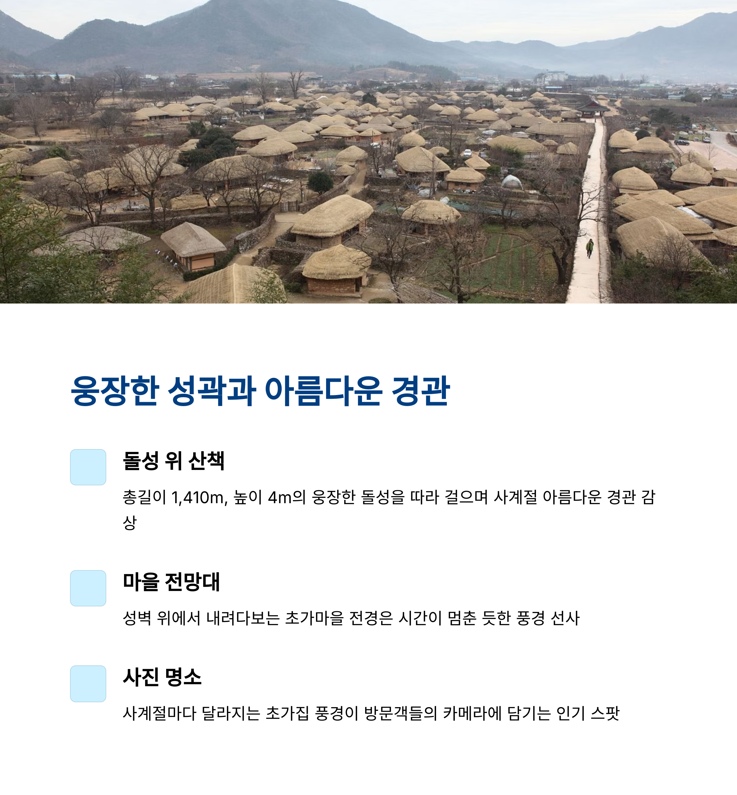 순천 낙안읍성은 조선 시대의 전통적인 읍성 마을이 잘 보존된 공간입니다. 마을 안을 걷다 보면 초가집, 성벽, 옛길이 자연스럽게 연결되어 있어 시간여행을 하는 듯한 기분을 느낄 수 있죠. 특히 성벽 위로 올라가면 마을 전체를 한눈에 조망할 수 있어 인생샷을 남기기 좋은 명소이기도 합니다. 관광객만을 위한 공간이 아닌, 실제 주민이 거주하며 전통 방식을 그대로 유지하고 있어 생생한 남도 문화를 체험할 수 있습니다.
