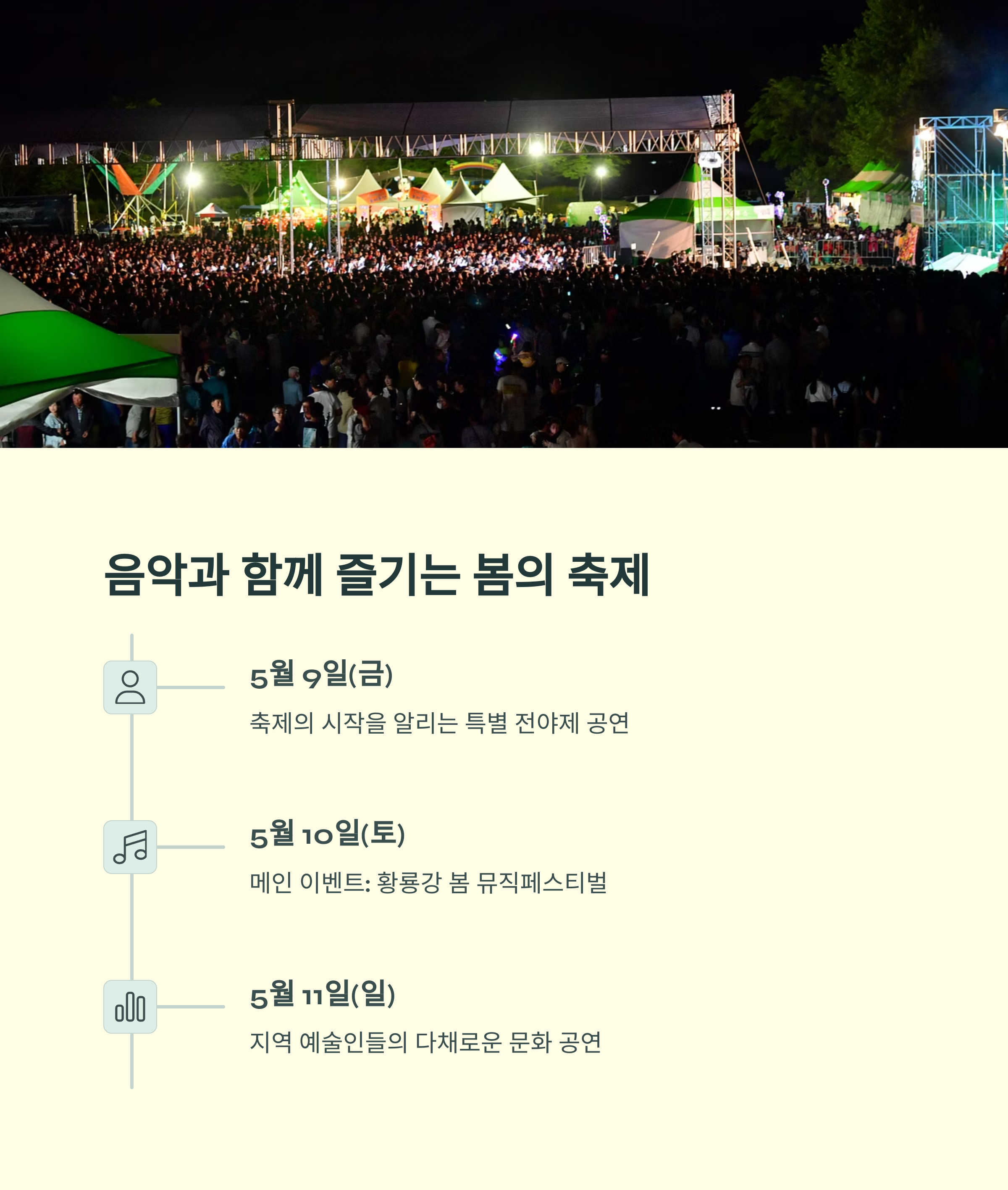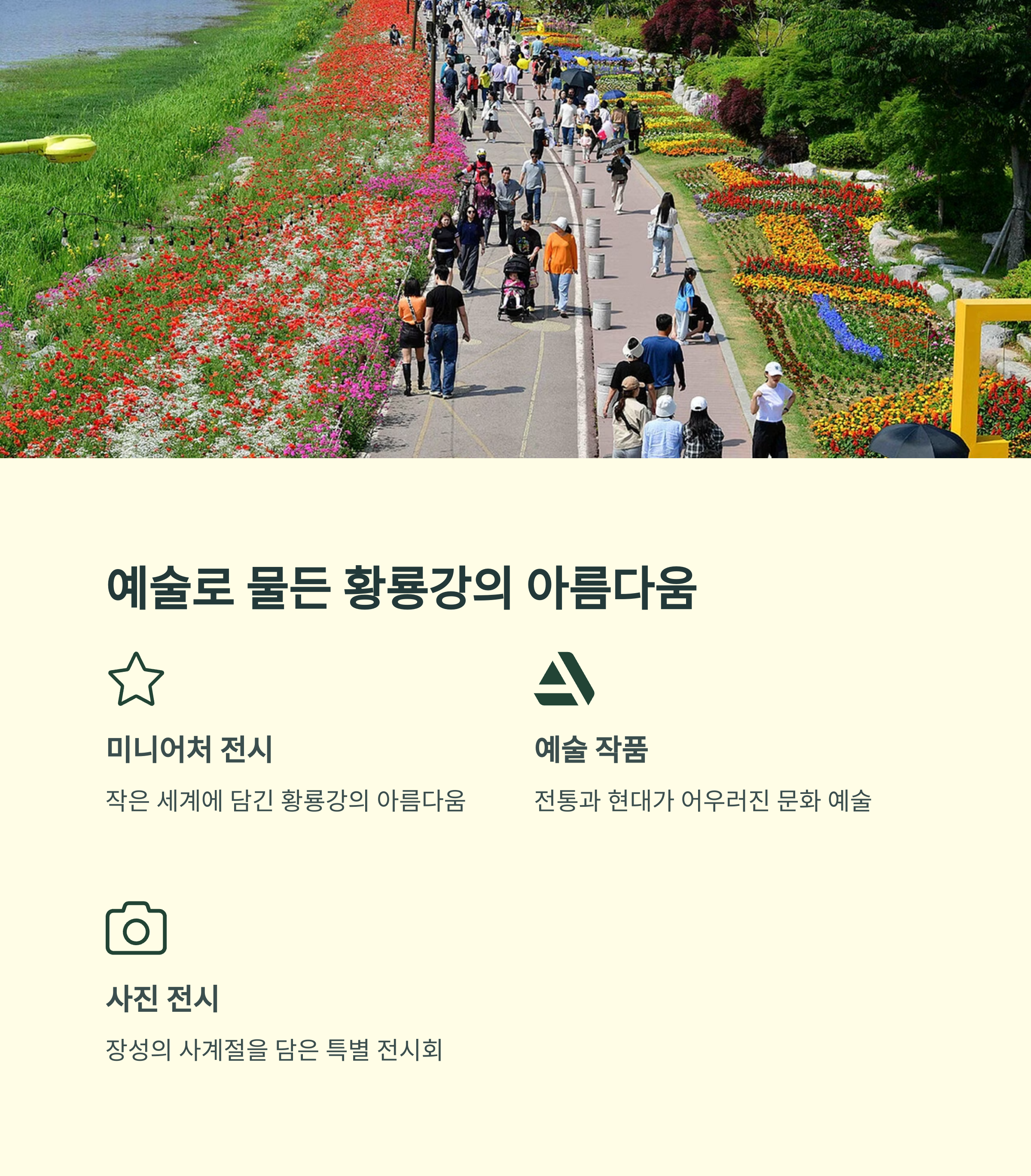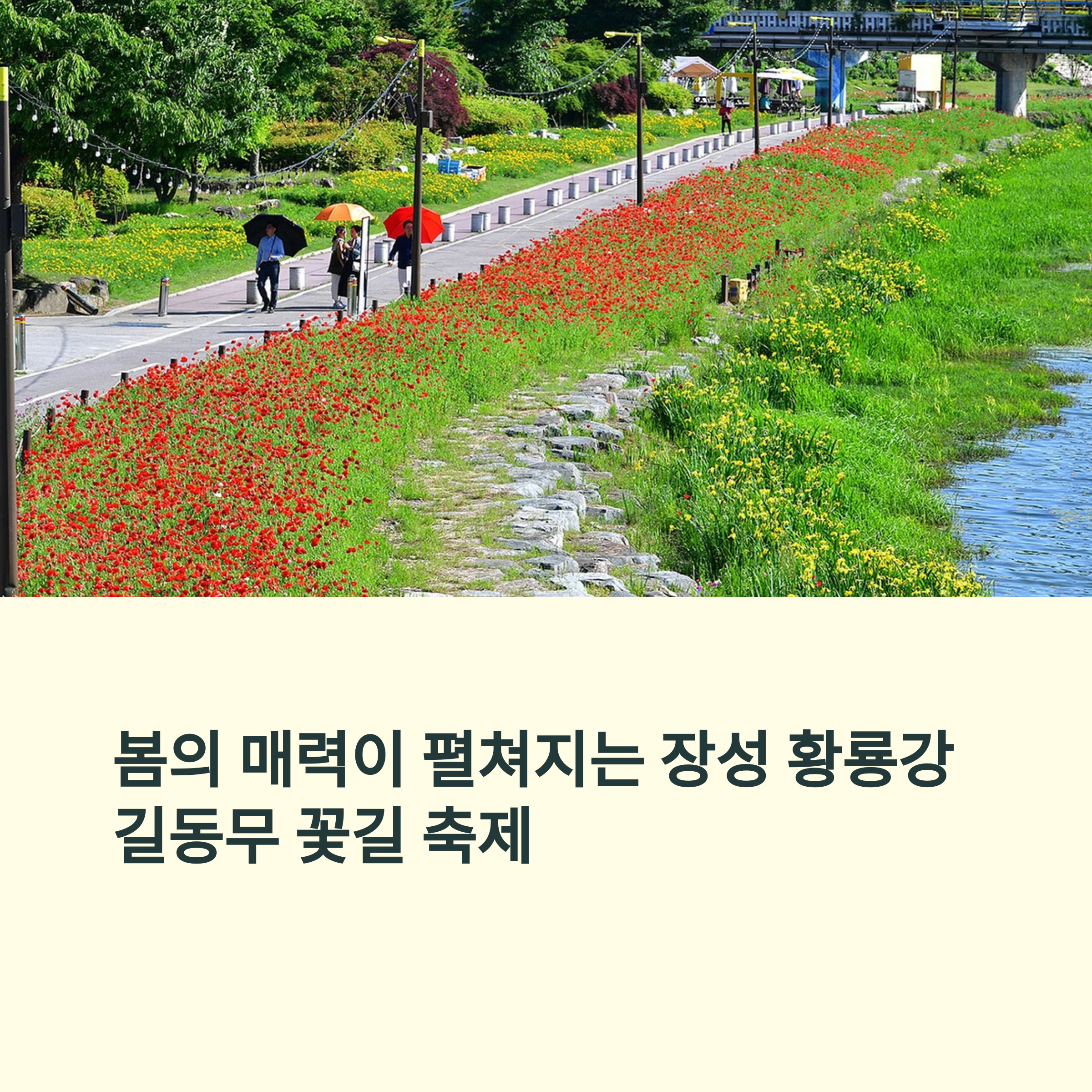 전남 장성의 황룡강 길동무 꽃길은 매년 5월이면 붉은 꽃양귀비, 수레국화, 금영화가 만개하여 황룡강변 전체가 꽃으로 물드는 장관을 연출합니다. 2025년 5월 10일~11일 양일간 펼쳐지는 이 축제는 단순한 꽃구경을 넘어 출사 명소로도 큰 사랑을 받고 있으며, 뮤직페스티벌, 지역 예술 공연, 미니어처 전시 등 다양한 문화행사가 함께 진행돼 모든 세대가 즐길 수 있습니다. 특히 꽃길열차, 어린이 체험, 플로깅 행사 등 참여형 프로그램도 풍성해 가족 단위 방문객에게도 추천됩니다. 강을 따라 걷는 황룡강 꽃길 코스는 자연과 꽃이 어우러진 아름다운 포토존이 많아 연인들의 데이트 장소로도 제격이며, 축제는 무료 입장으로 누구나 자유롭게 참여할 수 있습니다.