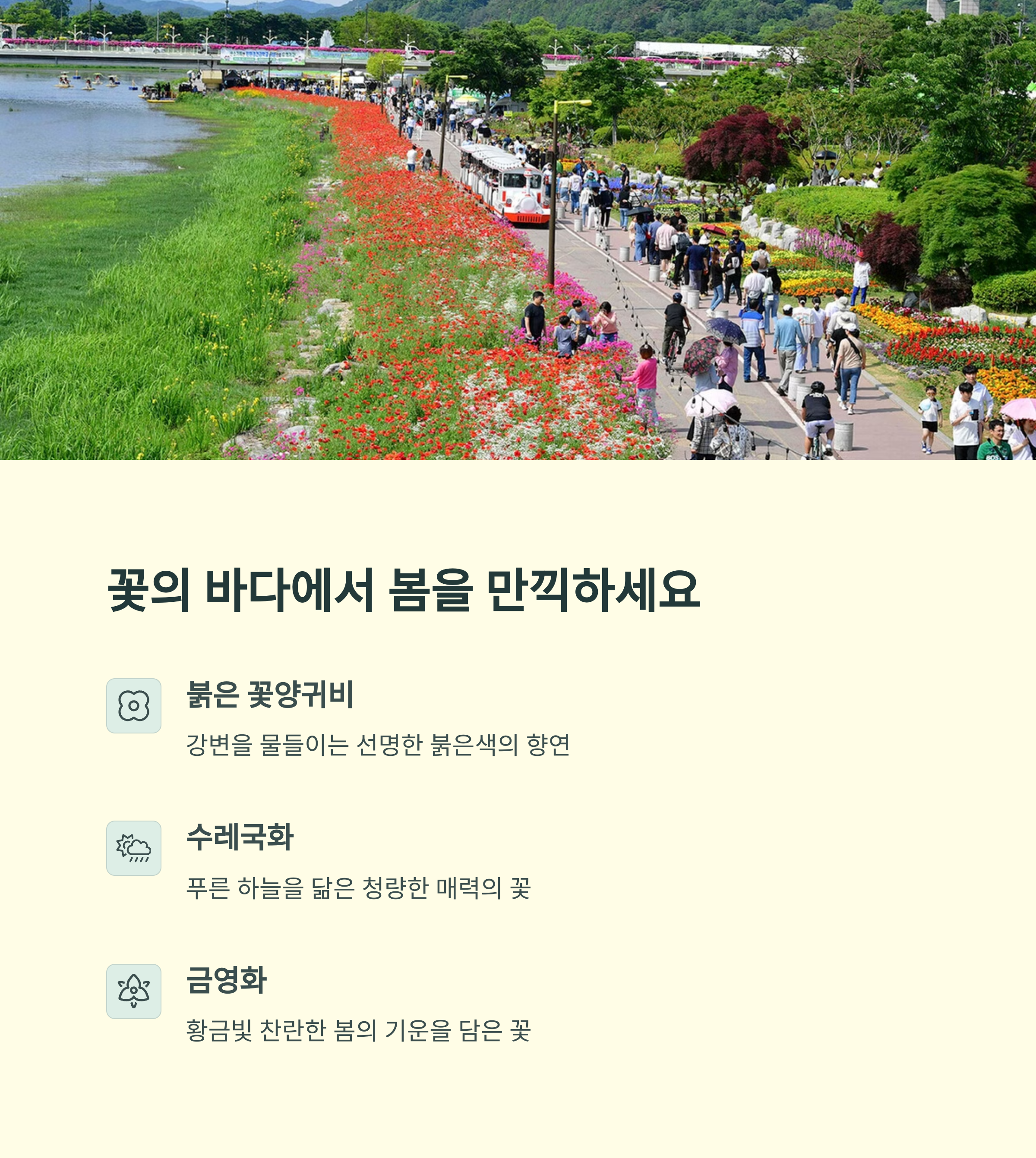 황룡강변을 따라 걷다 보면 포토존이 자연스럽게 이어집니다. 출사 목적의 방문자뿐 아니라 연인과의 데이트, 아이들과의 나들이 장소로도 적합한 코스입니다. 꽃길열차는 아이들에게 큰 인기를 끌며 강 주변의 넓은 공간은 돗자리를 펴고 피크닉을 즐기기에도 최적입니다. 무료 입장이라는 점 또한 큰 장점으로 손꼽히며, 매년 방문하고 싶어지는 매력을 품고 있는 축제입니다.