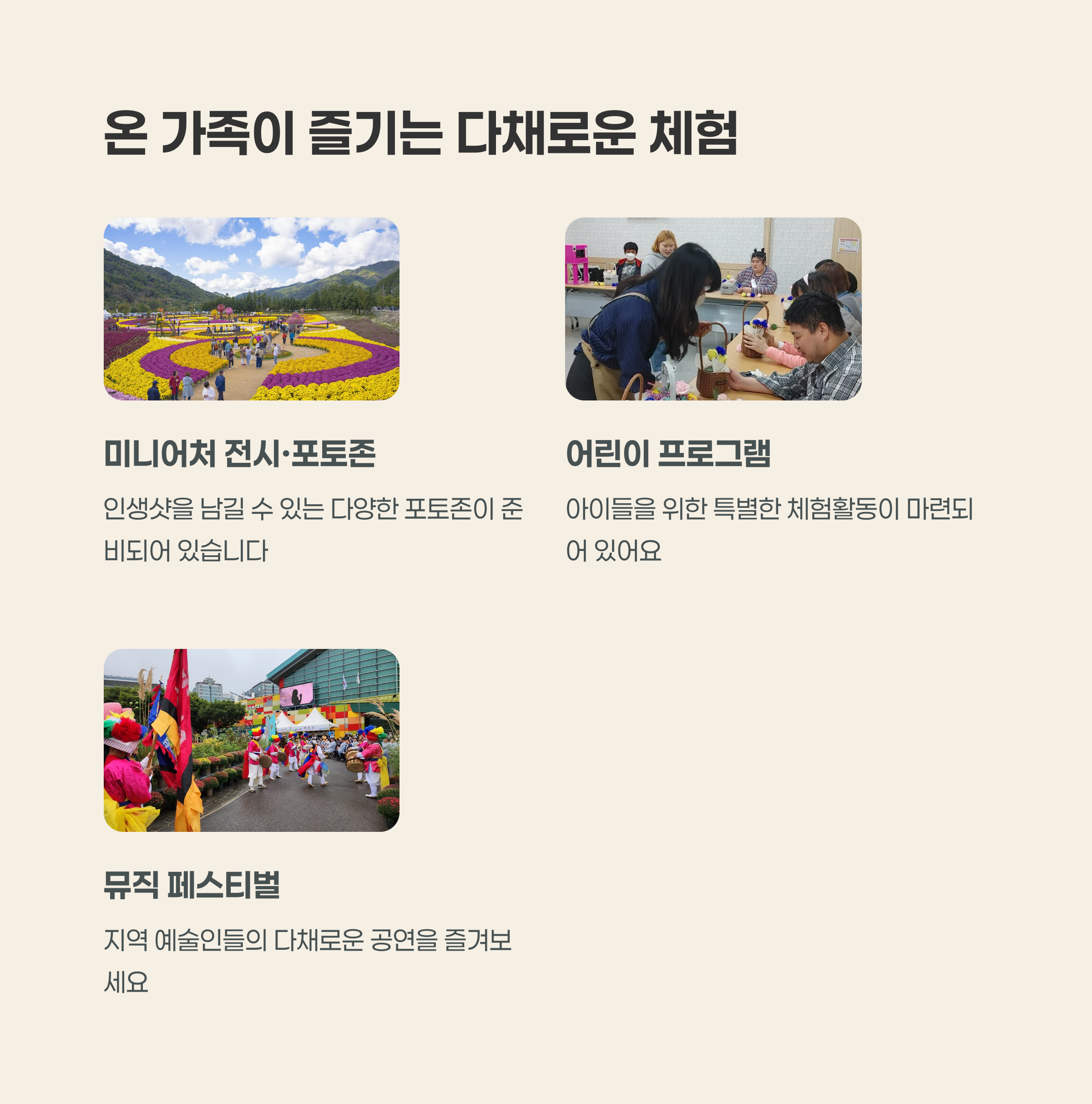 즐길 거리 | 꽃길열차, 미니어처 전시, 음악 공연, 체험 부스, 포토존 등 다양하게 구성 |