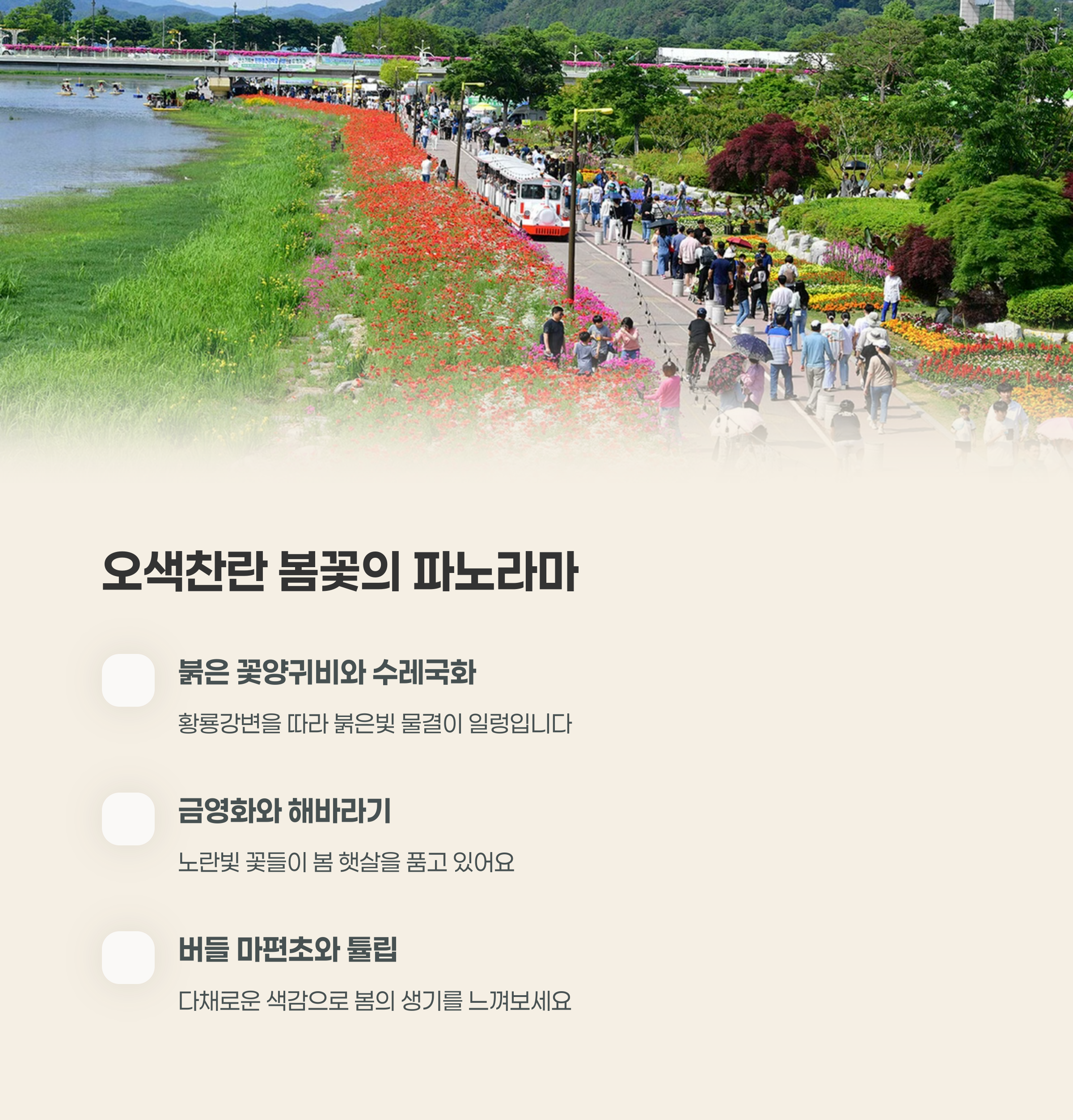 유채꽃, 튤립, 코스모스 등 계절 꽃길 | 5월 중 열리는 장성 황룡강 길동무 축제 | 열차 탑승하며 꽃길 전경 감상 가능 |