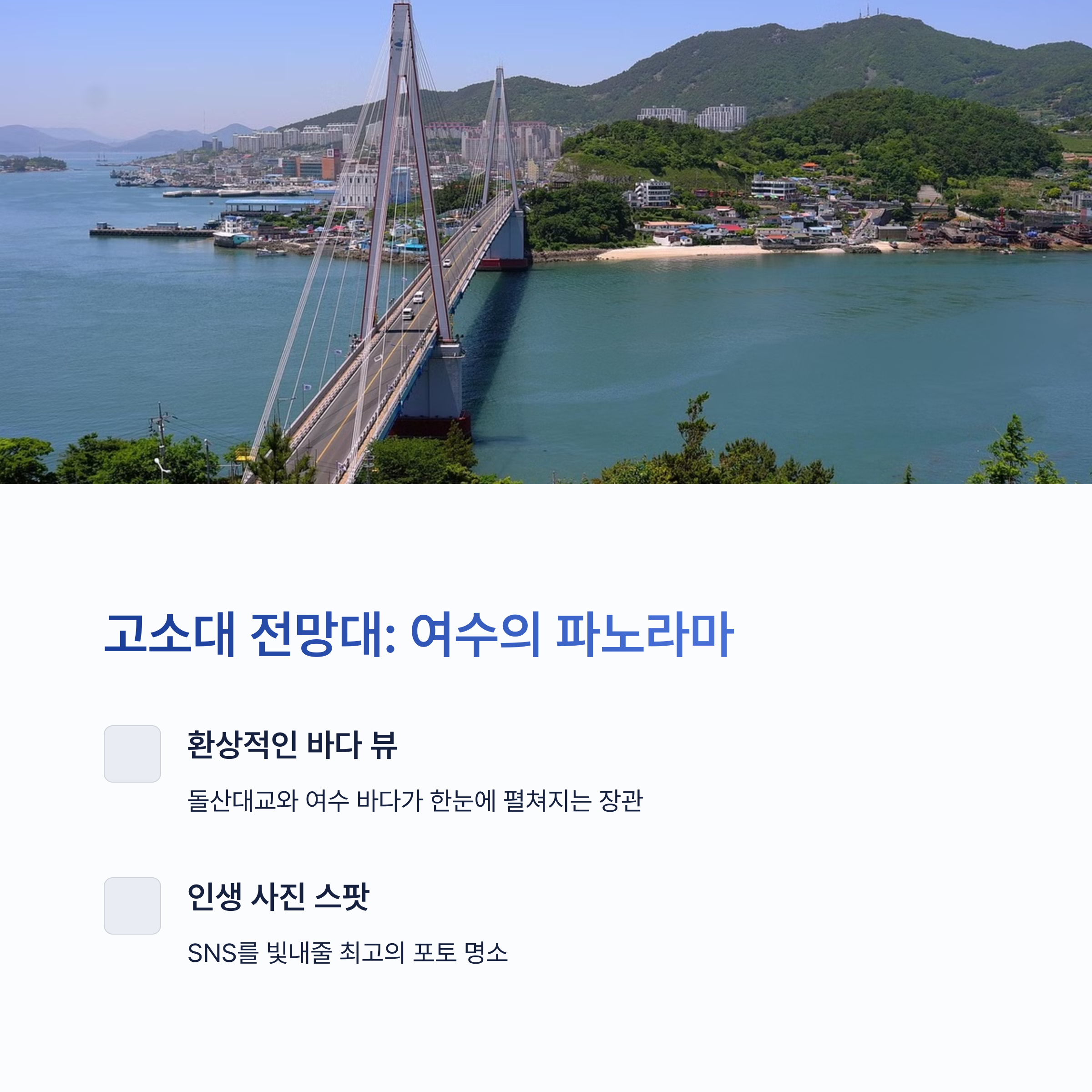 여행 중간에는 카페포와 같은 감성 카페에서 잠시 쉬어가는 여유도 즐길 수 있습니다. 고소동은 언덕과 계단이 많아 편안한 운동화가 필수이며, 고소대 공영주차장을 이용하면 이동이 훨씬 편리합니다. 예술, 전망, 먹거리가 한데 어우러진 이곳은 여수의 감성을 오롯이 담은 완벽한 여행 코스입니다.