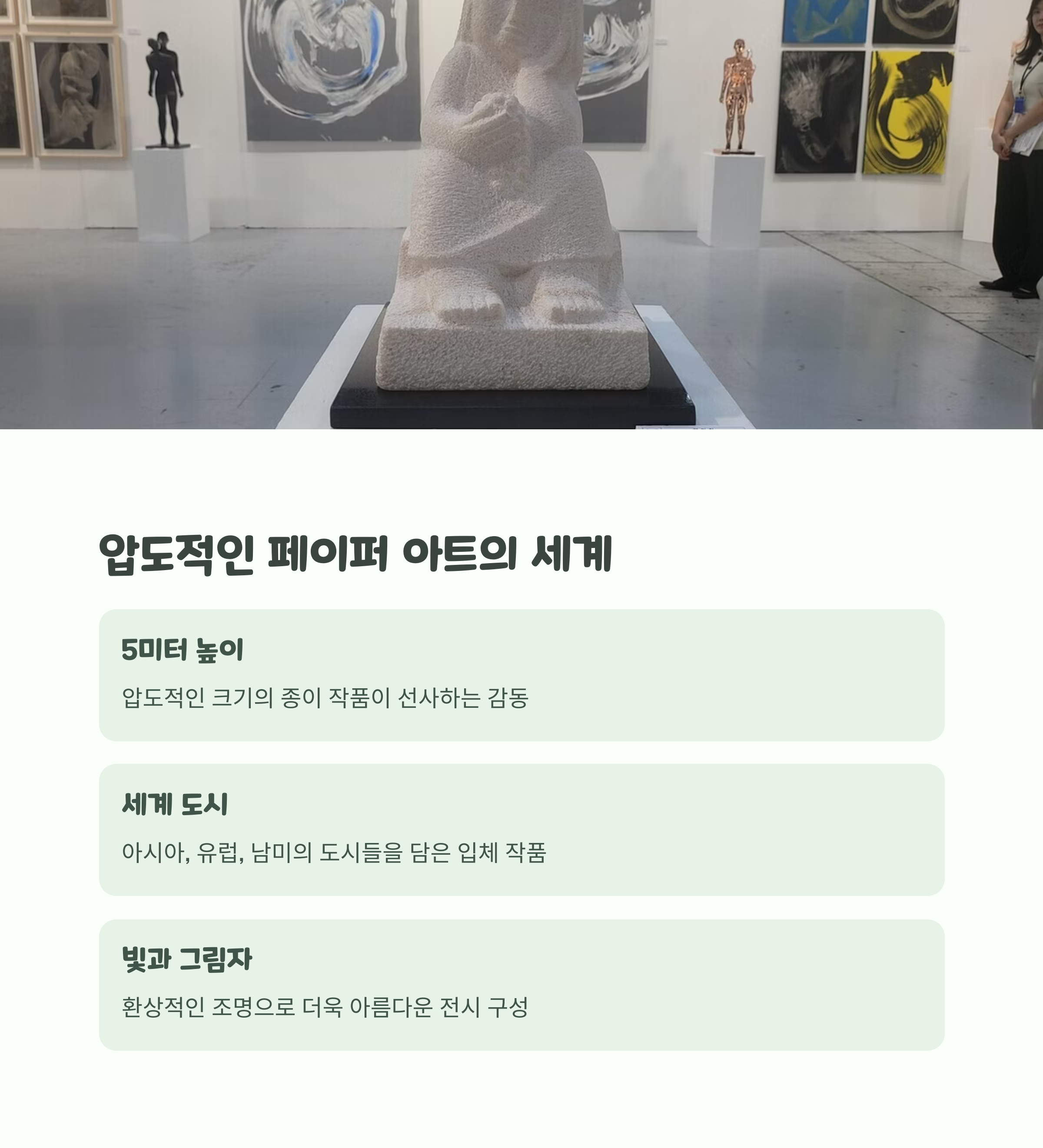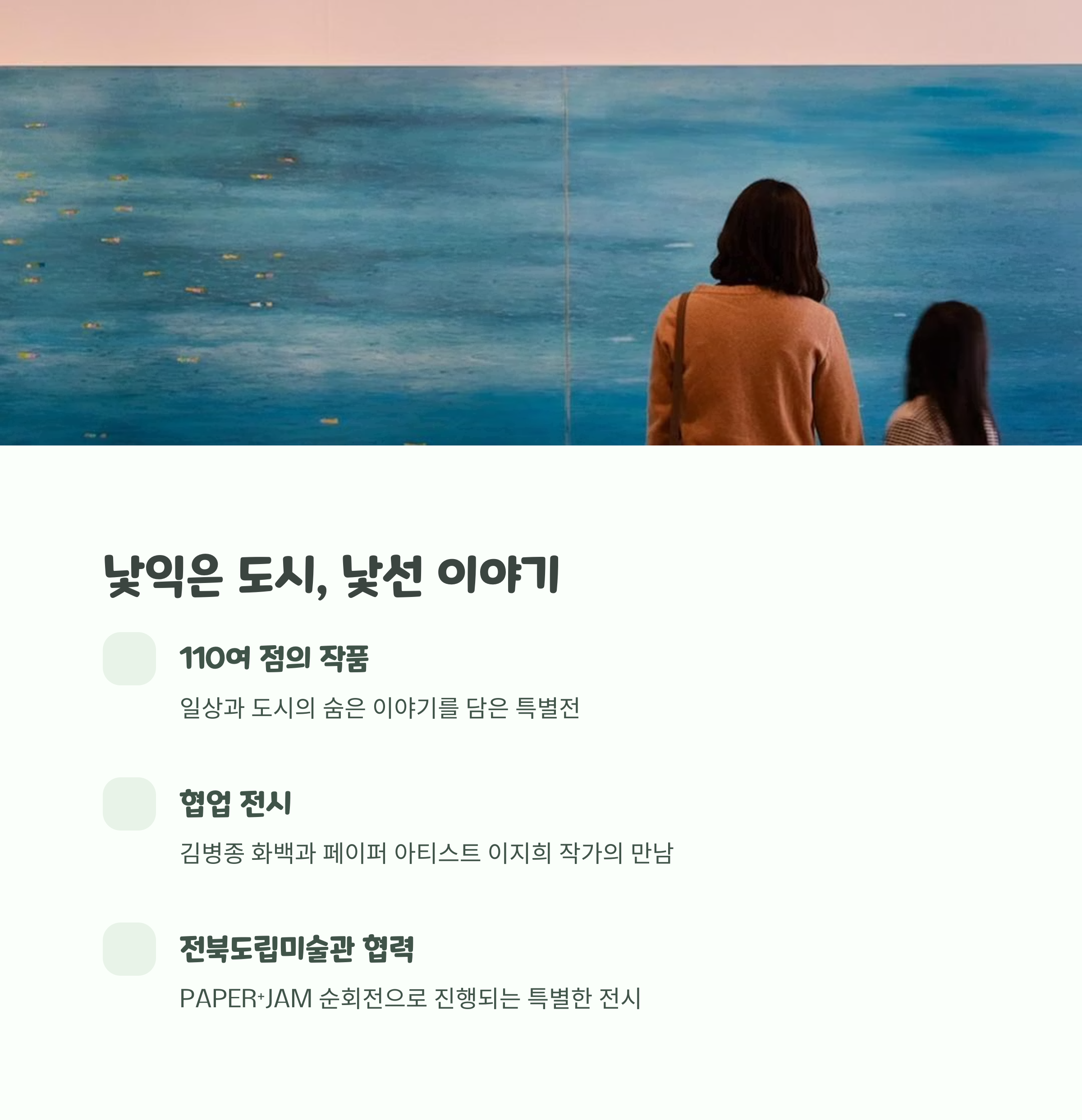 하루 3회 운영, 약 30분간 해설과 소통 가능 | 도시와 일상 이야기 담은 110여 점 전시 | 휴게 공간, 포토존, 무료 주차 등 쾌적한 환경 |