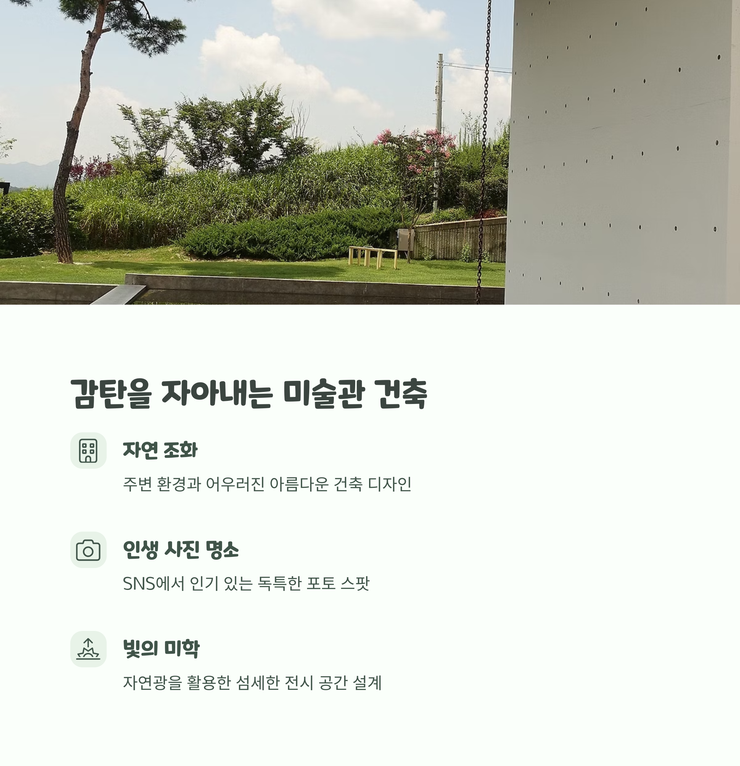 미술관 외관은 남원 자연과 조화를 이루는 세련되고 현대적인 디자인이 인상적이며 내부 또한 채광과 동선이 뛰어나 감상하기 좋습니다. 사진 촬영이 가능한 포토존도 곳곳에 마련되어 있었고, 중정과 테라스에는 편안히 쉴 수 있는 공간도 충분했습니다. 입장료와 주차 모두 무료인 점 또한 나들이 장소로서 큰 장점이며, 연인, 가족, 어르신 모두 만족할 만한 전시관입니다.