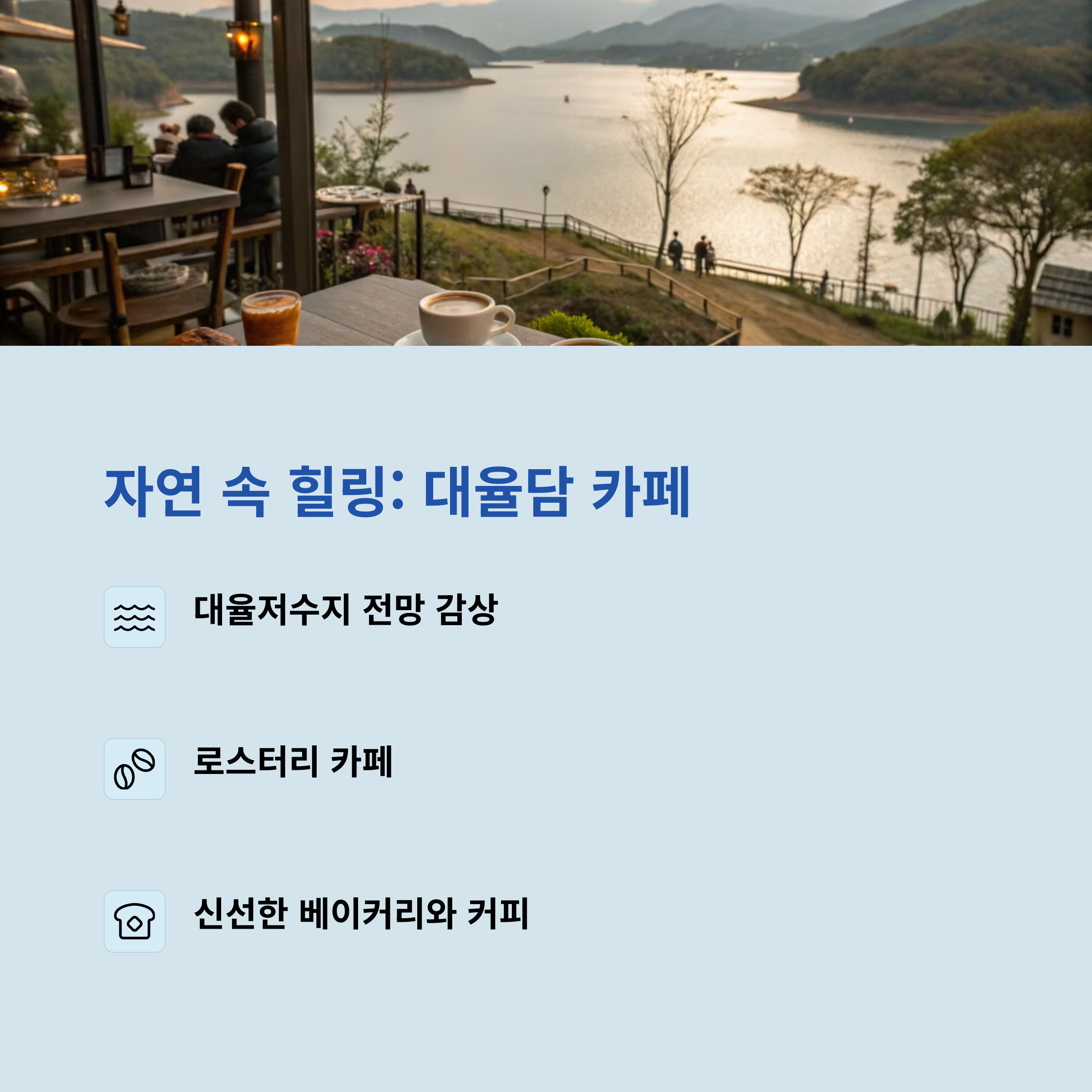 A: 대율담 카페에서는 직접 로스팅한 스페셜티 커피가 유명하며, 수제 베이커리와 함께 즐기기에 좋습니다. 특히, 저수지 뷰가 있는 테라스에서 마시는 커피는 더욱 특별한 경험을 선사합니다.