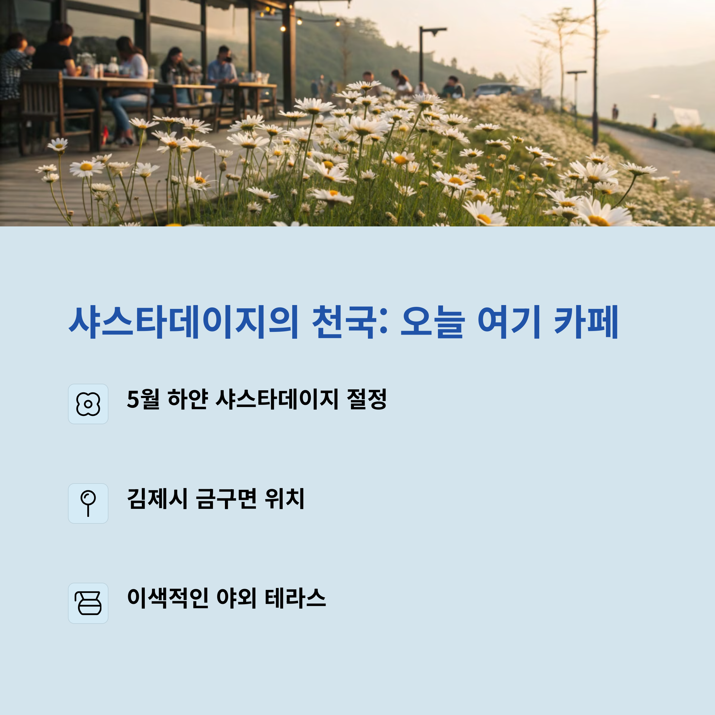 샤스타데이지를 감상할 수 있는 곳을 찾고 계신다면, 김제 금구면에 위치한 '오늘 여기' 카페를 추천합니다. 이곳은 넓은 야외 테라스와 함께, 하얀 샤스타데이지가 가득한 정원이 있어 많은 여행객들의 사랑을 받고 있습니다. 탁 트인 자연 속에서 커피 한 잔을 마시며 여유로운 시간을 보내보세요.