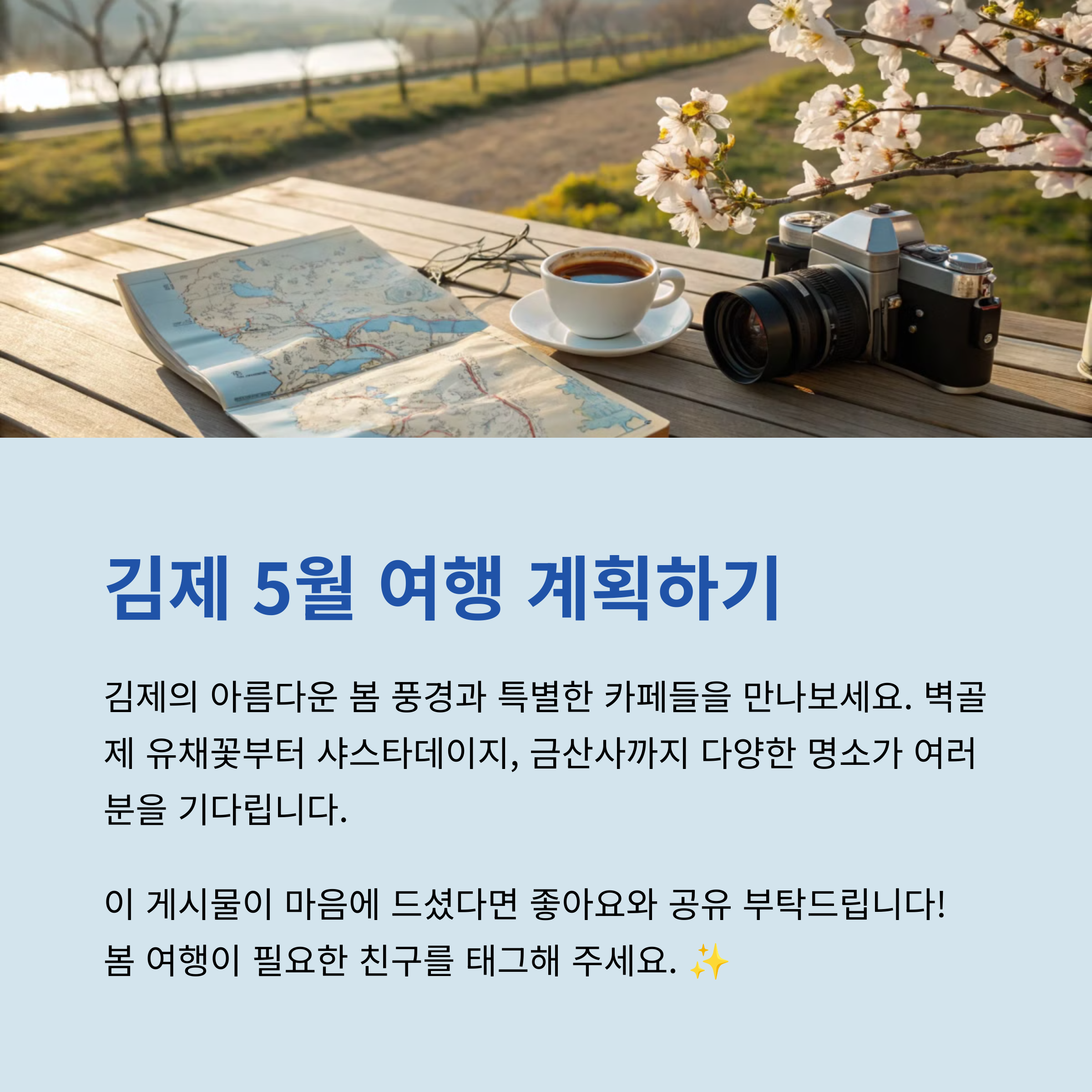5월의 김제는 다양한 자연경관과 멋진 카페들로 여행객을 맞이합니다. 벽골제 유채꽃의 황금빛 들판, 오늘 여기 카페의 샤스타데이지 가득한 정원, 대율담 카페의 여유로운 힐링 공간까지! 자연과 함께하는 감성 여행을 떠나보세요.