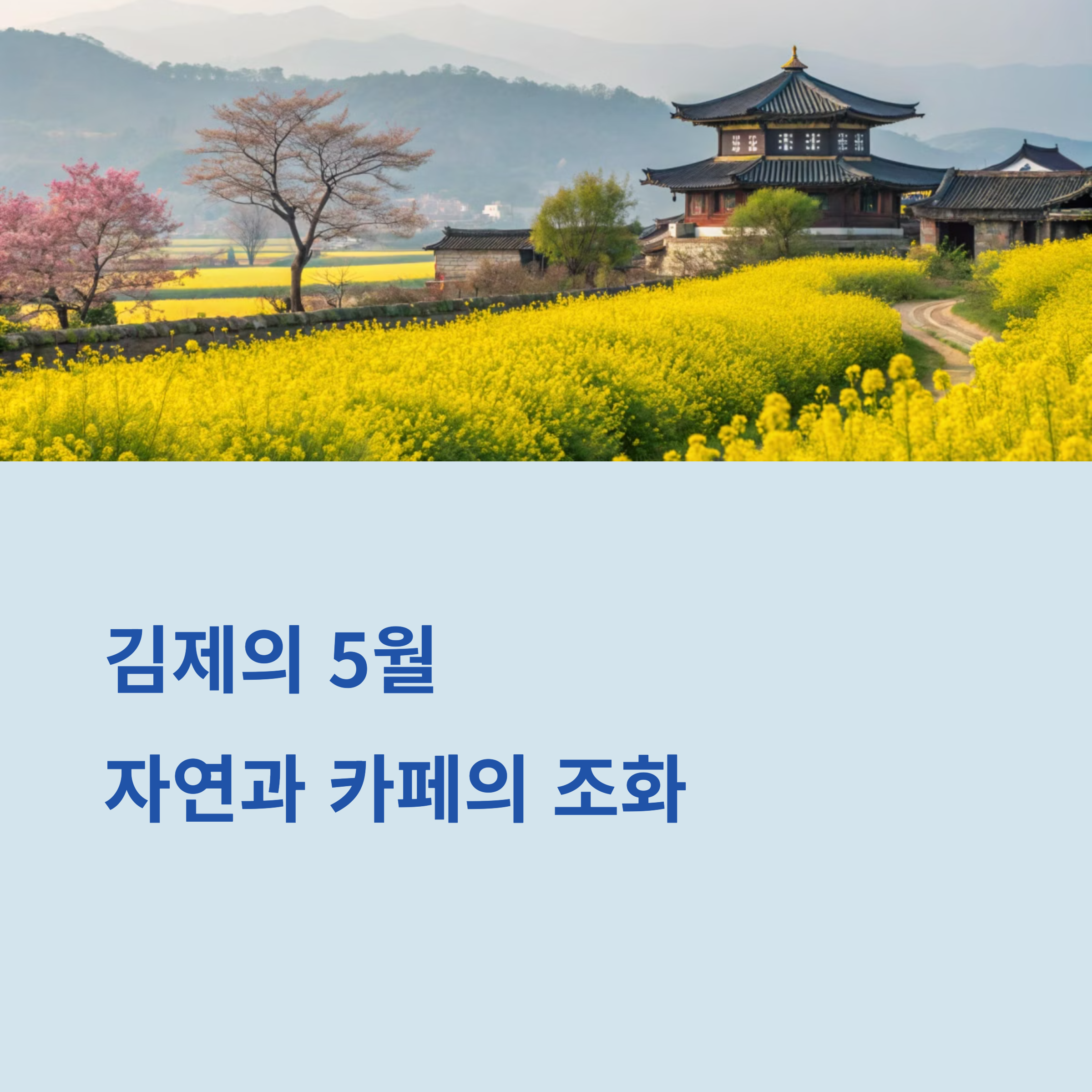 5월의 김제는 다양한 자연경관과 멋진 카페들로 여행객을 맞이합니다. 벽골제 유채꽃의 황금빛 들판, 오늘 여기 카페의 샤스타데이지 가득한 정원, 대율담 카페의 여유로운 힐링 공간까지! 자연과 함께하는 감성 여행을 떠나보세요.