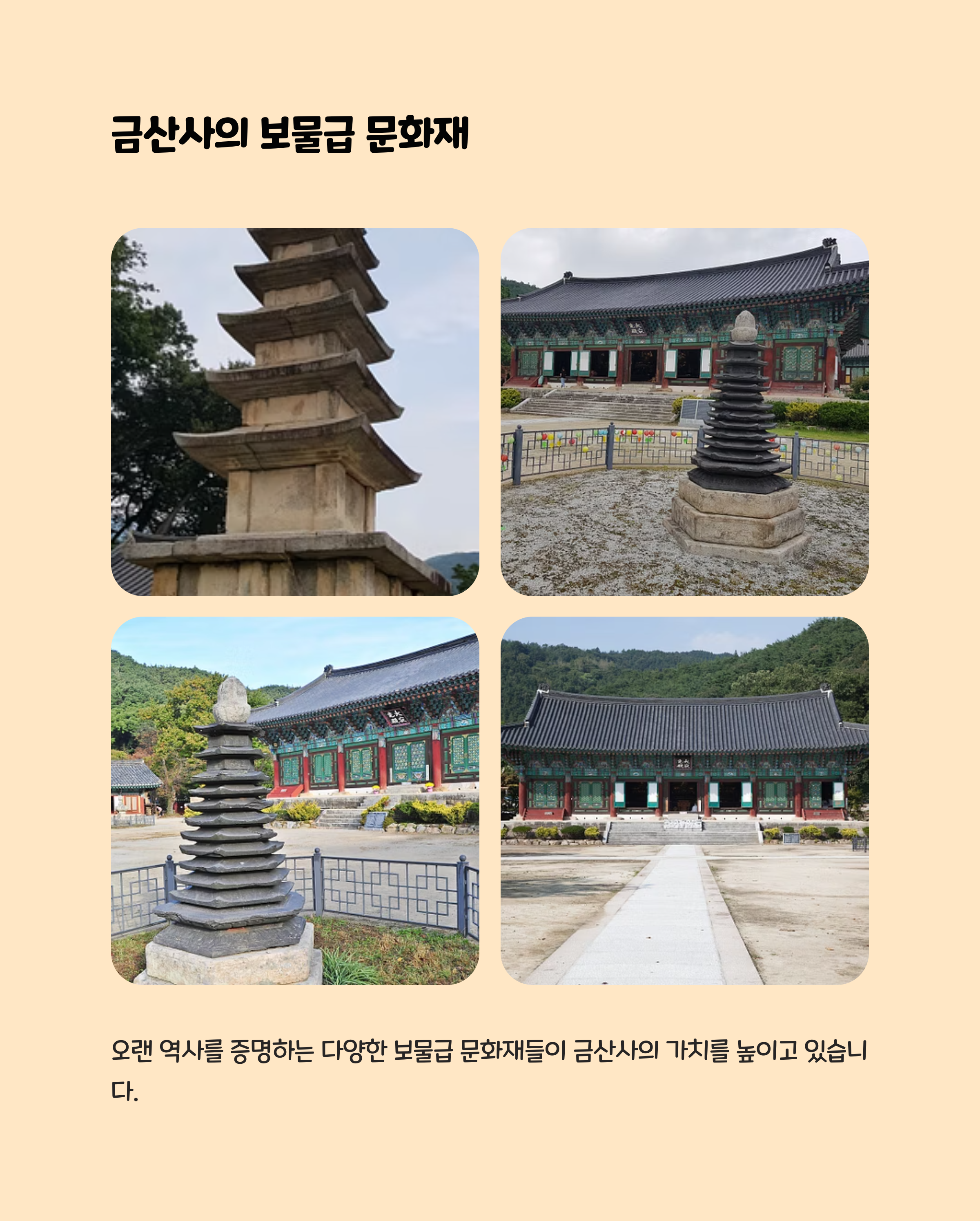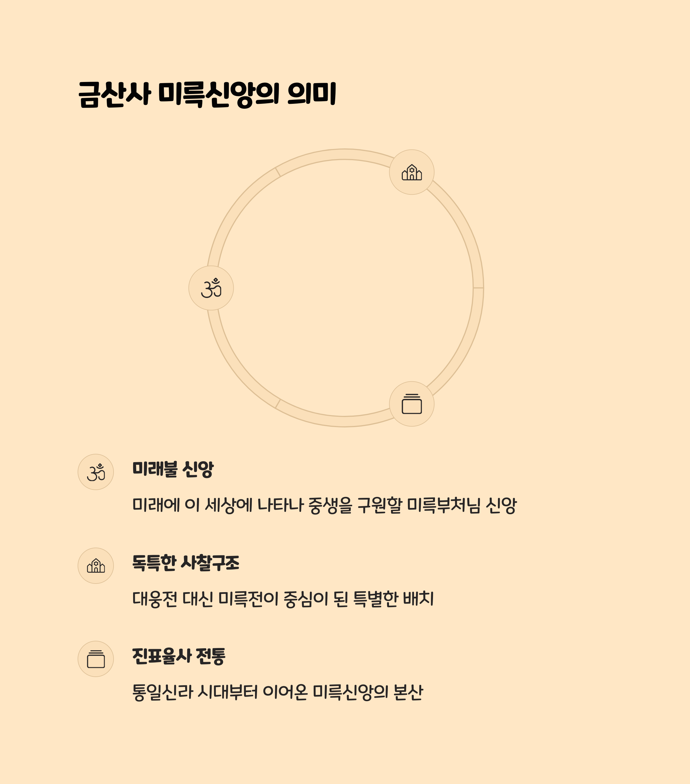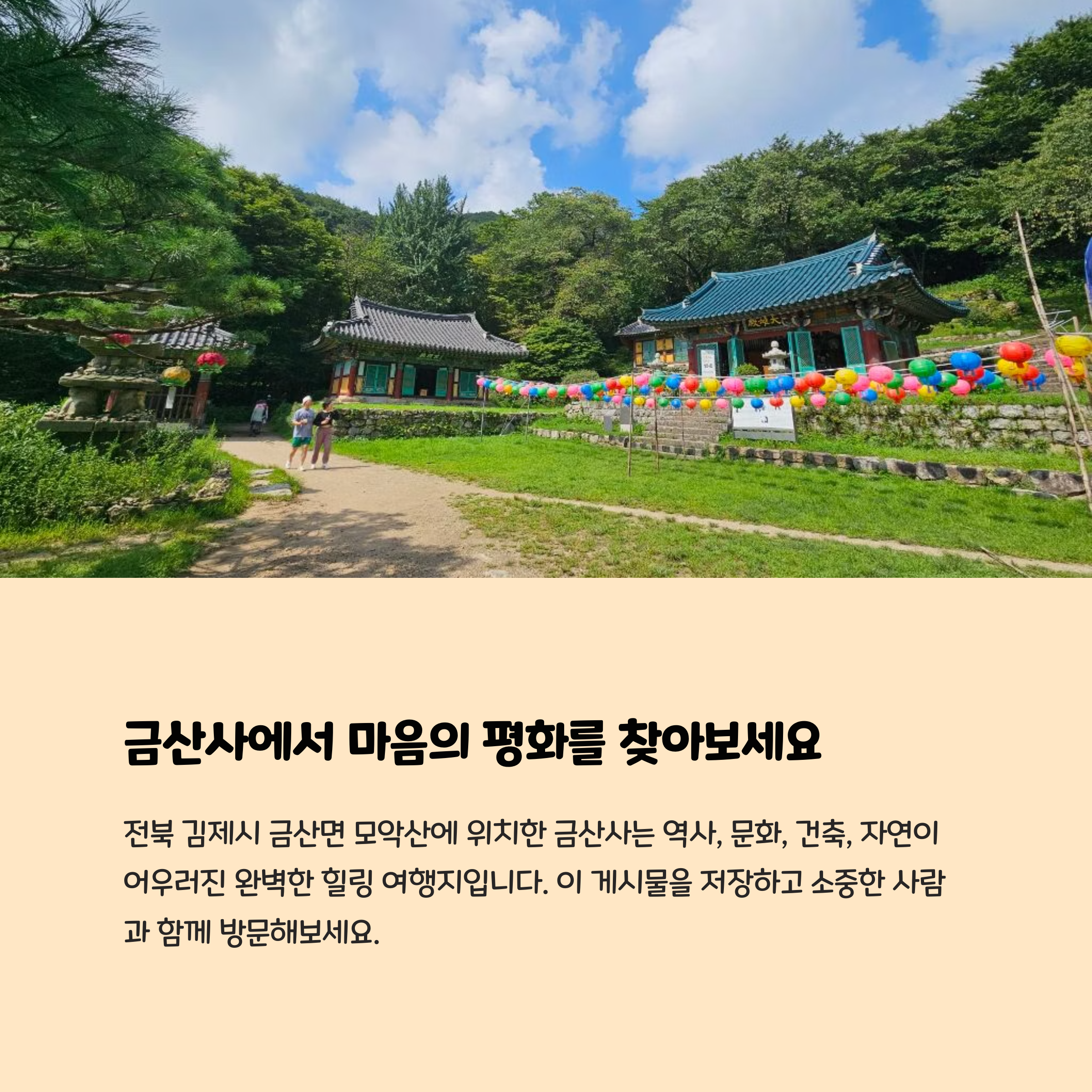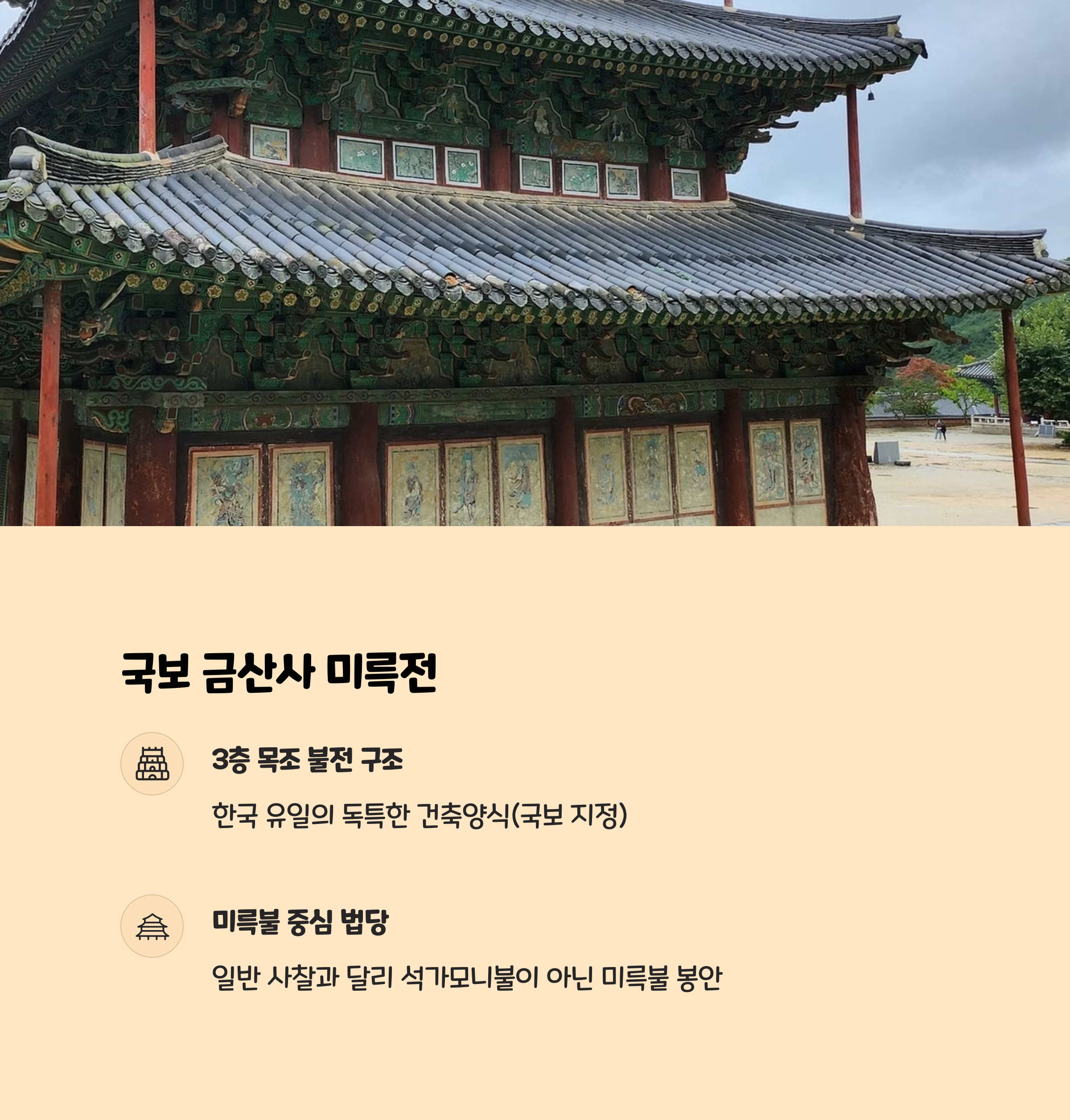 | 백제 창건, 신라 중창, 후백제 견훤 유폐지로 유명 | 3층 불전, 대적광전, 미륵전 등 전각에서 불교문화를 접할 수 있음 | 모악산 자락과 어우러진 조용한 사찰 산책로 |
