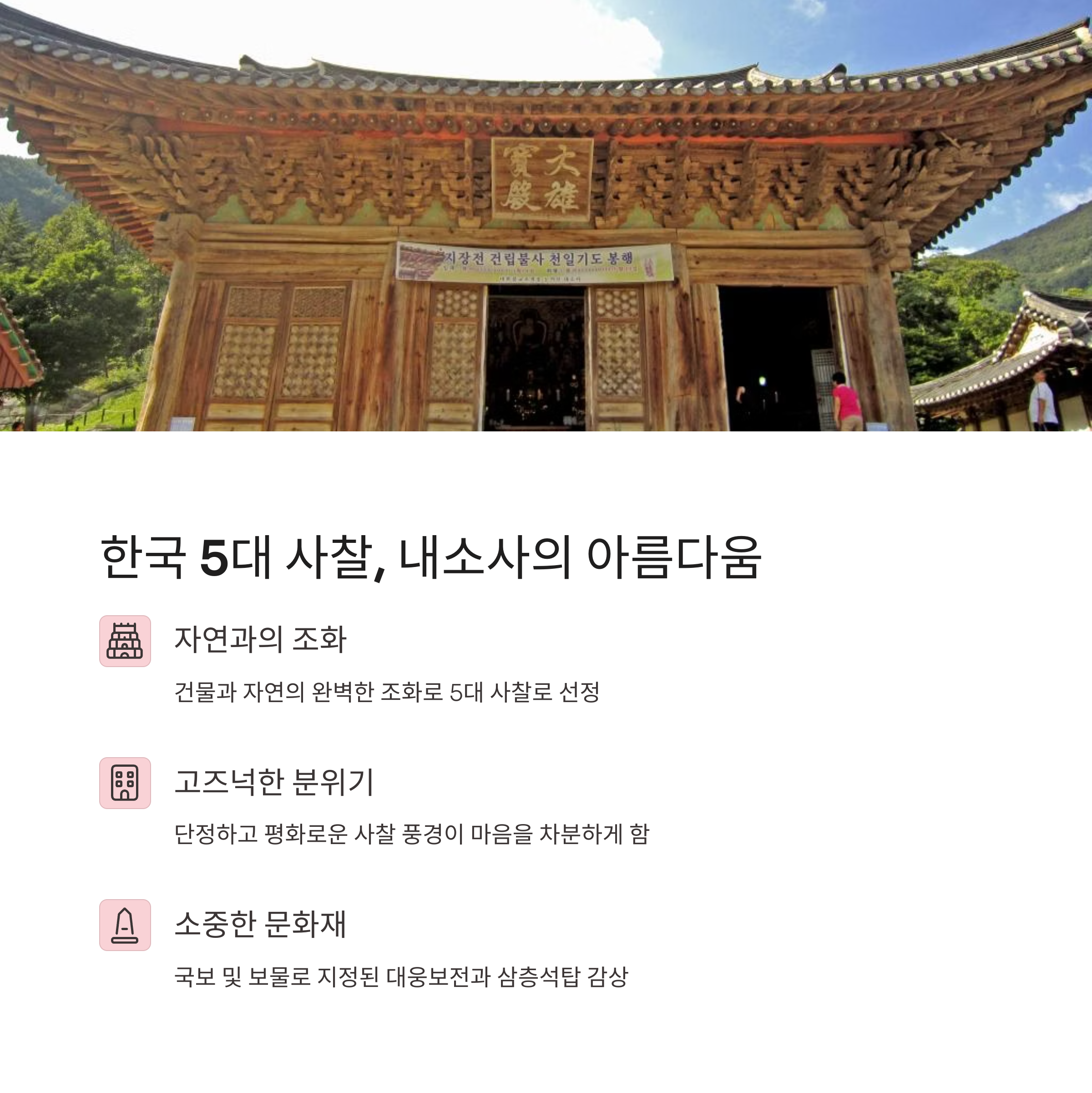 700여 그루의 전나무가 만든 초록빛 산책 코스 대웅보전, 삼층석탑이 조화를 이루는 전통 사찰 직소폭포·해수욕장과 함께하는 당일치기 명소