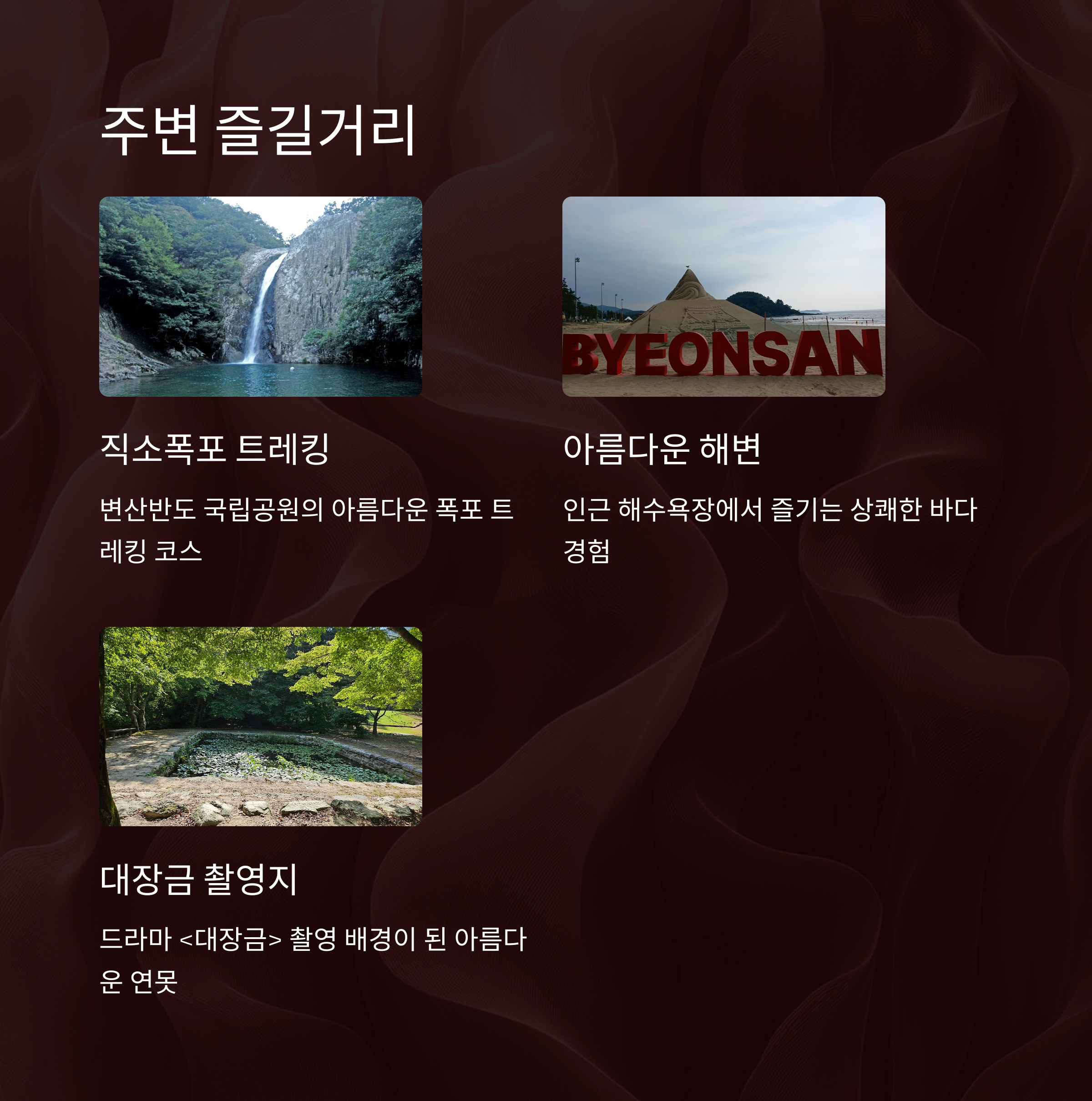 내소사 트레킹 후에는 직소폭포, 격포해수욕장, 채석강 등 변산반도 국립공원의 명소를 함께 둘러보는 코스를 추천합니다. 당일치기 여행은 물론, 힐링 1박 여행으로도 훌륭하며, 계절마다 풍경이 달라 재방문 가치가 높은 곳입니다. 자연과 문화유산이 조화를 이루는 내소사 산책길은 몸과 마음을 위로해주는 전라북도 최고의 힐링 트레킹 코스입니다.