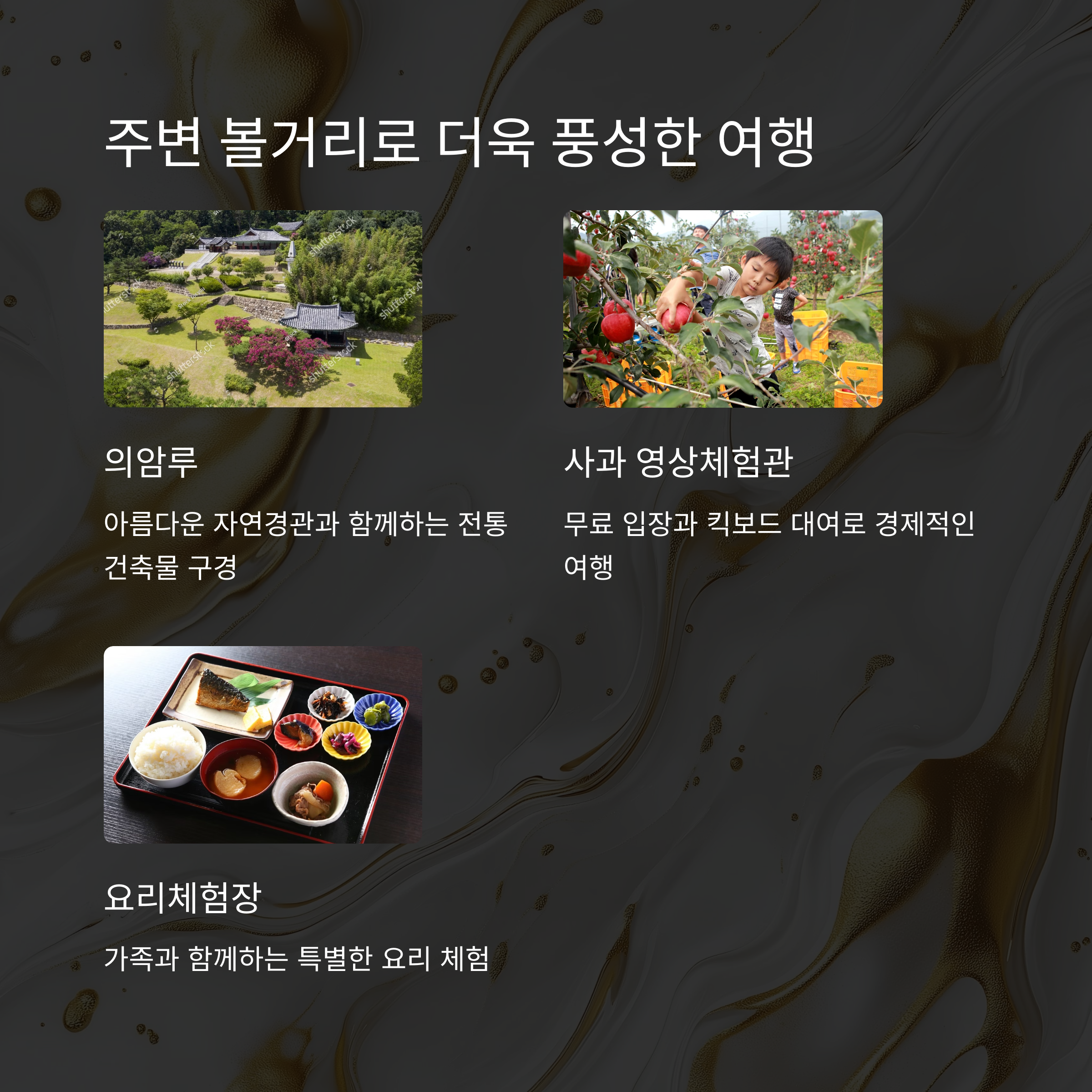 | 인근 관광지와 연계 가능한 가족 여행 코스 | 초보 캠퍼도 걱정 없는 깨끗한 편의시설 | 실내외 놀이부터 보드게임, 도서관까지 체험 가능 |