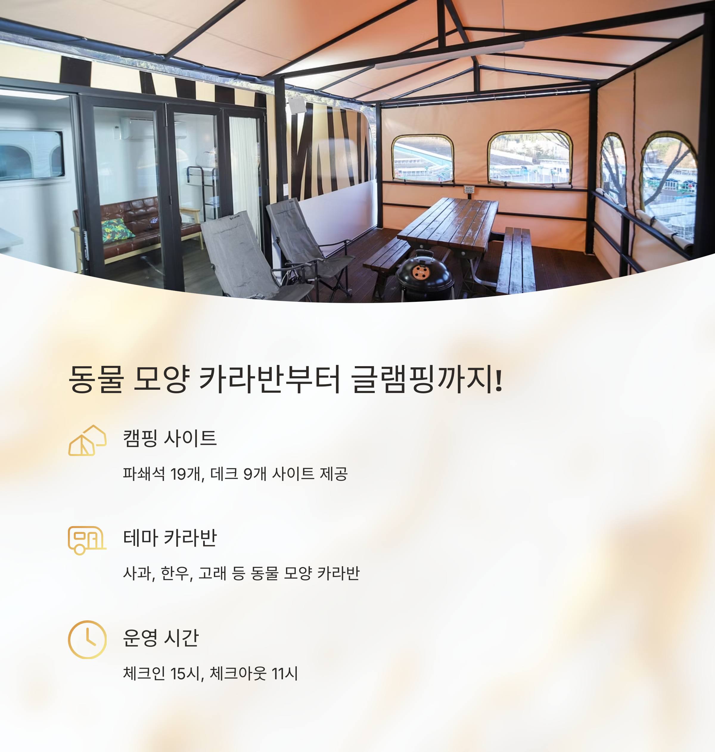 | 인근 관광지와 연계 가능한 가족 여행 코스 | 초보 캠퍼도 걱정 없는 깨끗한 편의시설 | 실내외 놀이부터 보드게임, 도서관까지 체험 가능 |