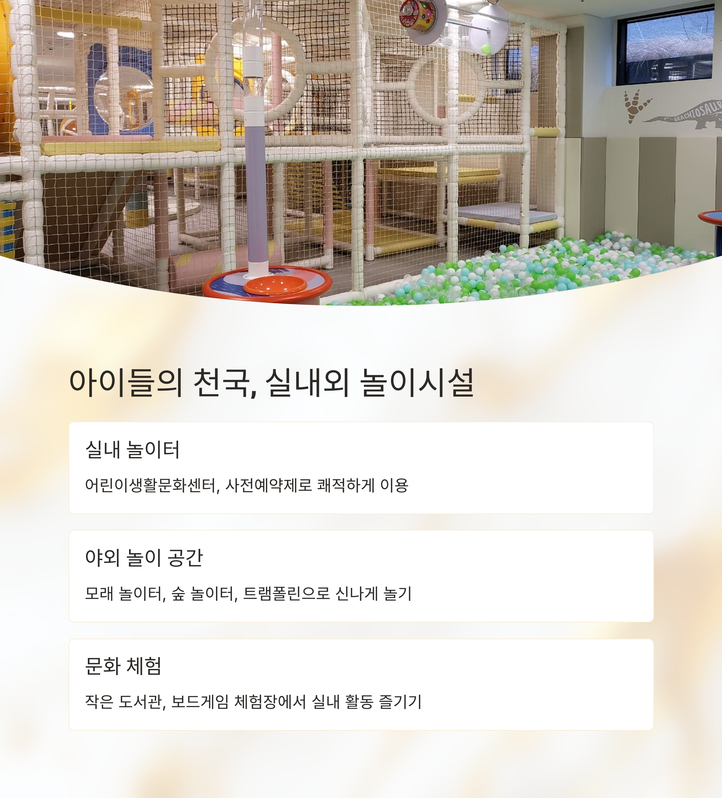 | 어린이 놀이터 | 실내외 놀이와 여름철 물놀이까지 즐길 수 있는 공간 |