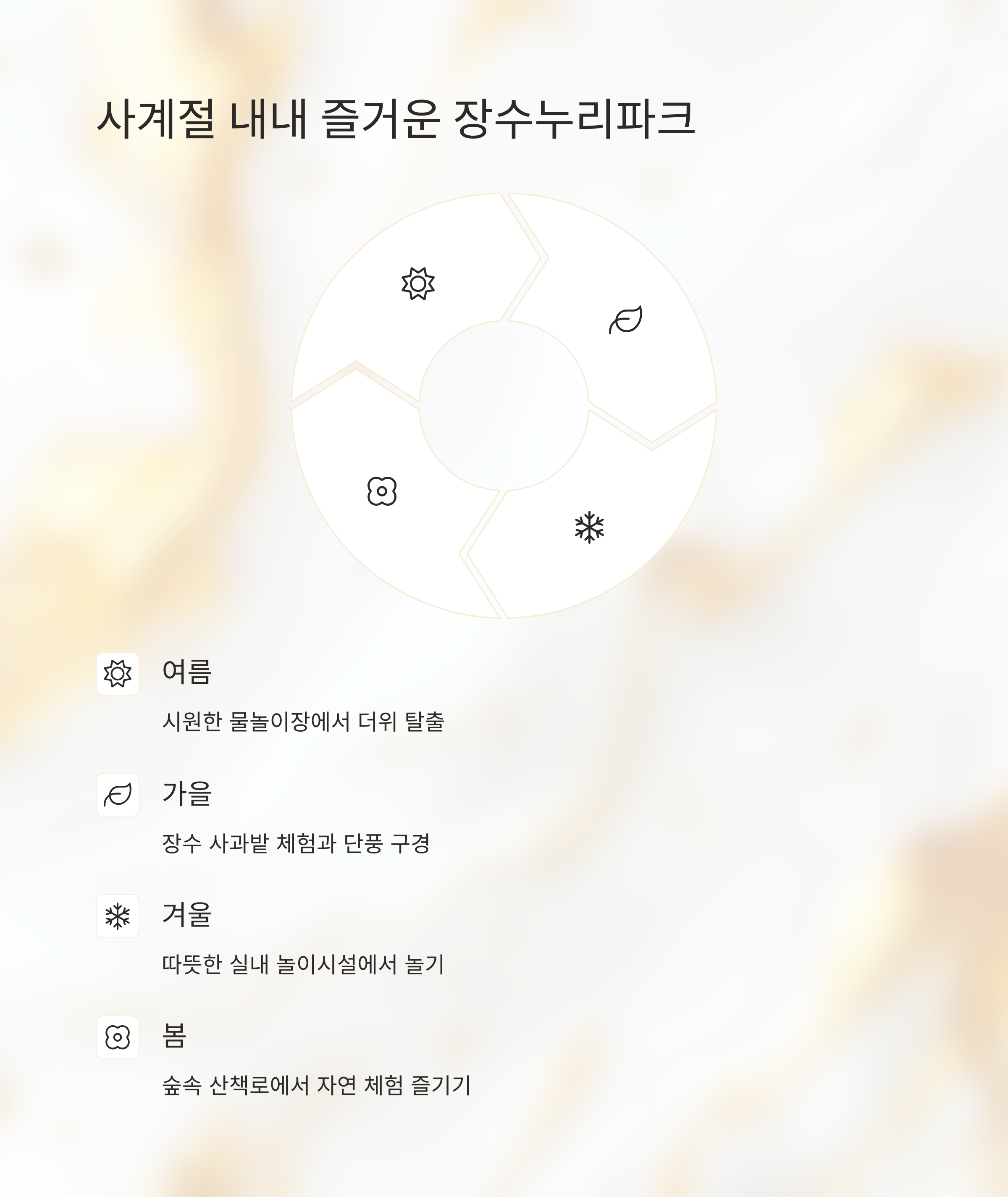 아이들을 위한 실내외 놀이터는 장수누리파크의 핵심 자랑거리입니다. 넓은 숲속놀이터는 계절마다 테마가 바뀌며, 여름철에는 워터슬라이드와 워터풀로 바뀌어 신나는 물놀이장이 됩니다. 실내놀이터는 쾌적한 시설을 유지하기 위해 사전예약제로 운영되며, 다양한 놀이기구와 체험시설로 아이들의 만족도가 매우 높습니다. 여기에 더해 보드게임 체험장, 작은 도서관 등 조용한 활동을 위한 공간도 마련되어 있어 하루 종일 알차게 시간을 보낼 수 있습니다.