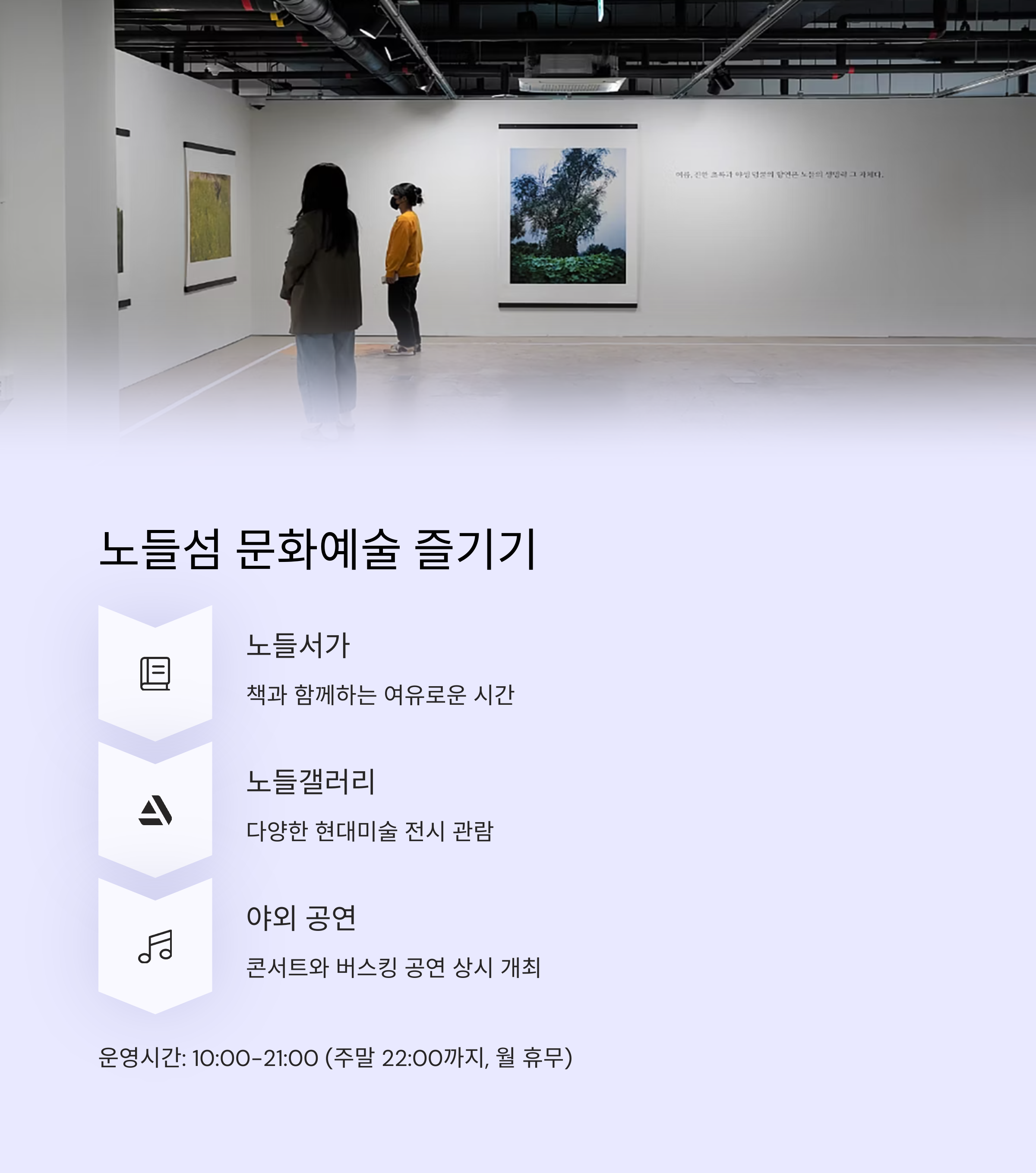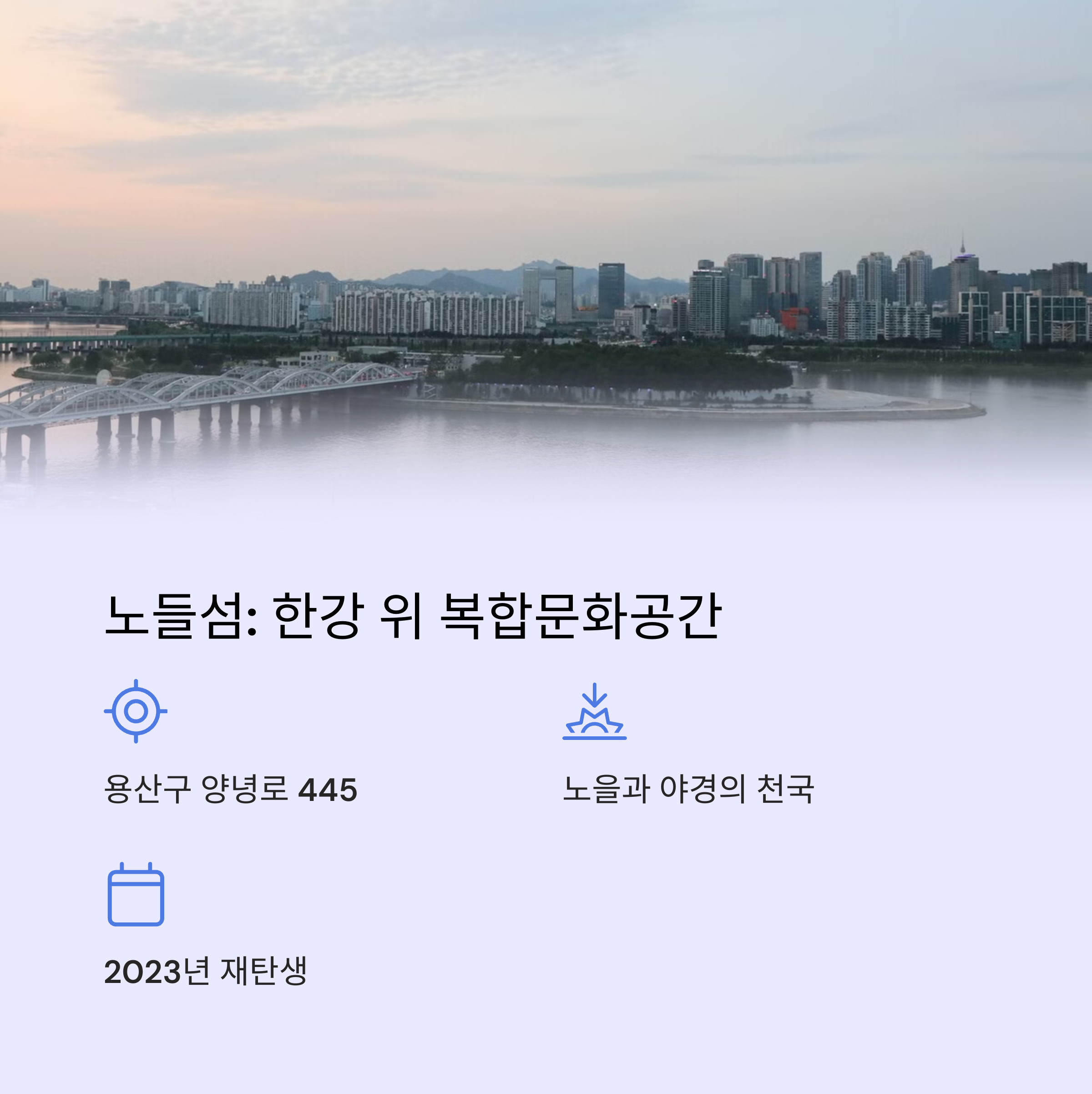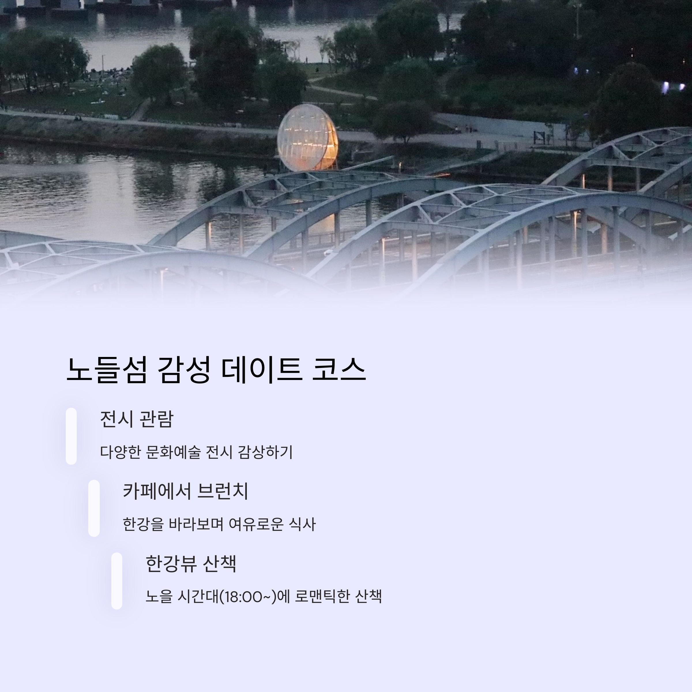 노들섬한강변 복합문화공간으로, 전시, 공연, 북카페, 브런치 카페, 산책로가 모두 어우러진 데이트 핫플입니다. 전시관에서는 소규모 미술 전시부터 대중문화 전시까지 감각적인 콘텐츠가 펼쳐지며, 감성적인 한강 전망 카페에서는 여유로운 브런치를 즐길 수 있어요. 날씨 좋은 날에는 피크닉 매트 대여와 잔디 광장 이용도 가능해 도심 속 자연과 문화가 만나는 특별한 하루를 만들어 줍니다.