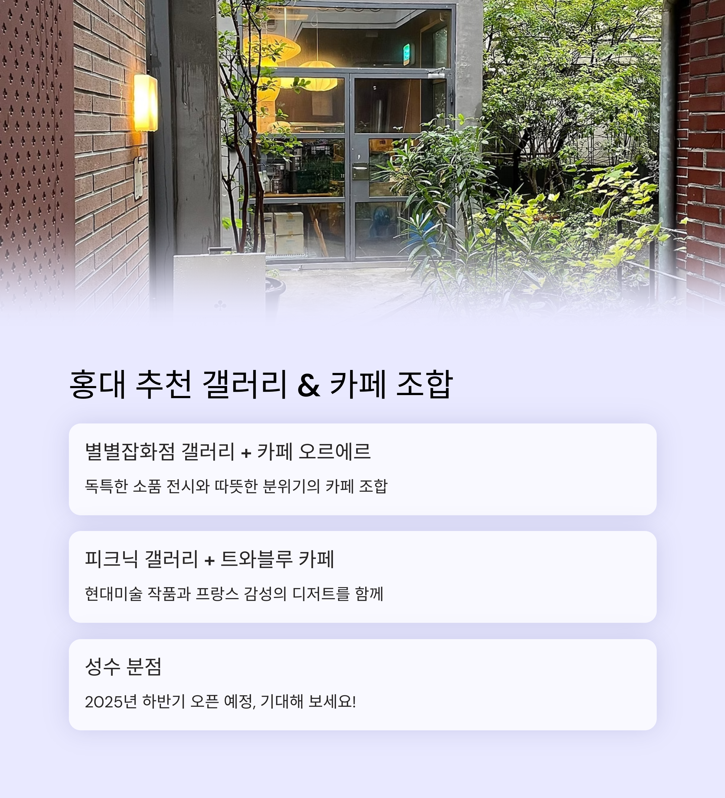 전시와 카페가 결합된 데이트 장소의 장점은 날씨에 크게 영향받지 않고, 문화적 감성 + 사진 + 휴식이 모두 가능한 점이에요. 전시를 보고 나면 자연스럽게 대화 주제가 생기고, 카페에서는 분위기 있는 대화와 인증샷으로 추억을 쌓을 수 있답니다. 주말에는 사람이 많을 수 있으니 평일 오후나 이른 오전 방문을 추천드려요.