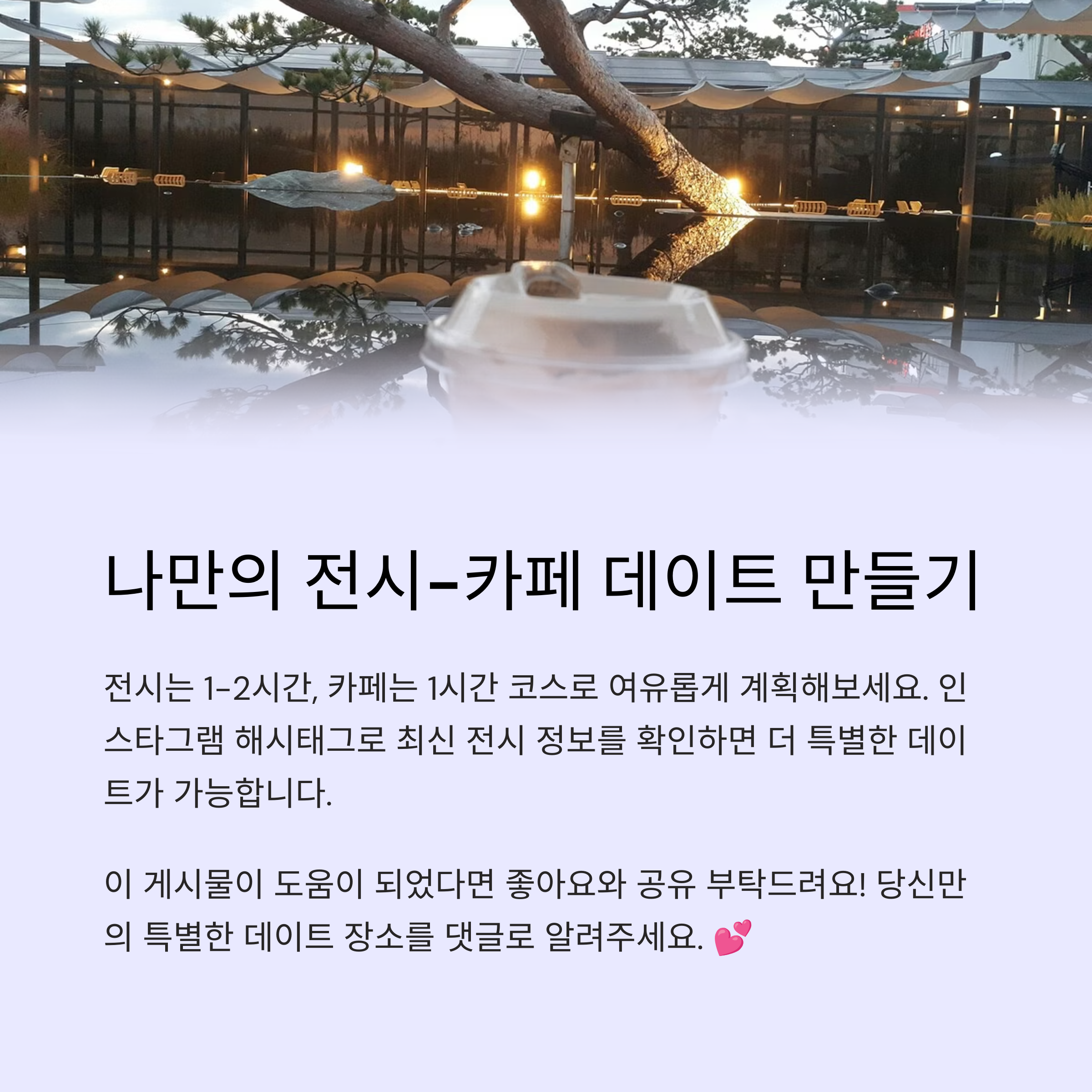 전시와 카페, 포토존이 어우러진 데이트 장소를 추천하고 싶다면 댓글로 함께 공유해주세요! 다음 데이트를 준비 중인 분들에게 큰 도움이 됩니다.