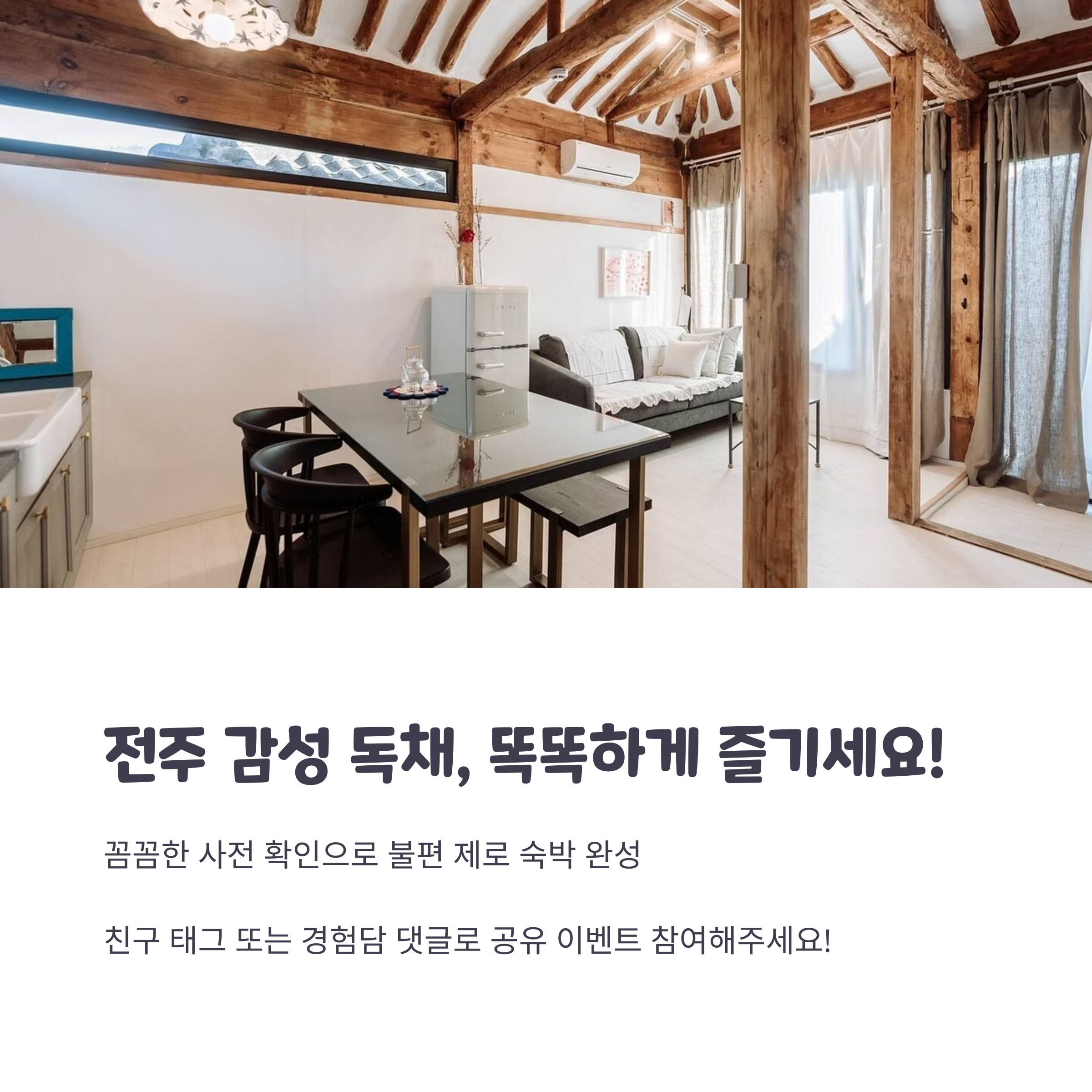 혹시 전주에서 추천하고 싶은 독채 숙소가 있으신가요? 직접 다녀온 숙소 중 감성적인 인테리어나 만족스러운 서비스를 경험하셨다면 댓글로 함께 공유해주세요. 여러분의 경험이 또 다른 여행자에게 큰 도움이 됩니다!