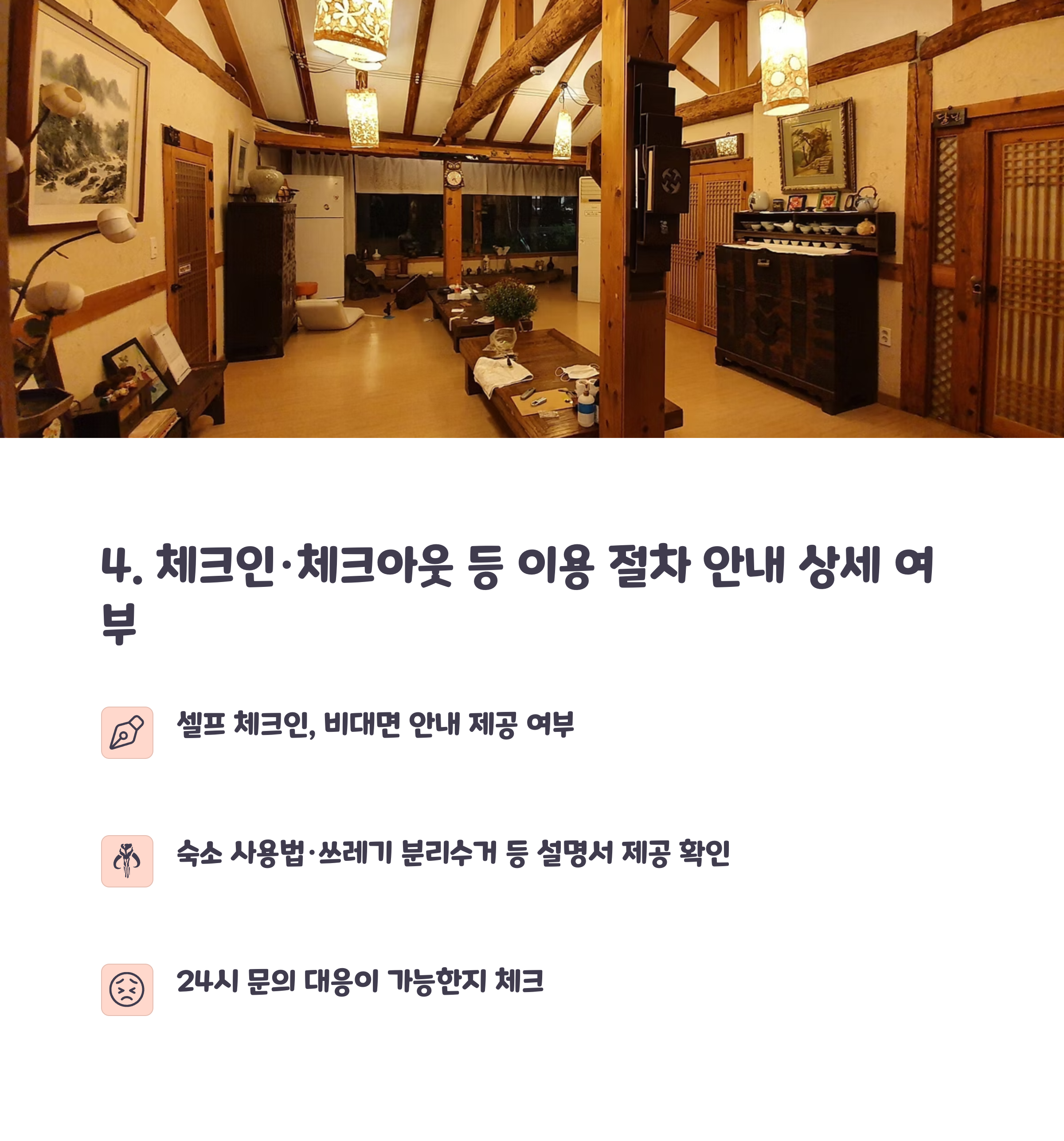 관광지와의 거리, 주차장 유무 확인 | 다른 팀과의 공유 여부, 독립 입구 | 체크인 방법, 환불 규정, 부가시설 |