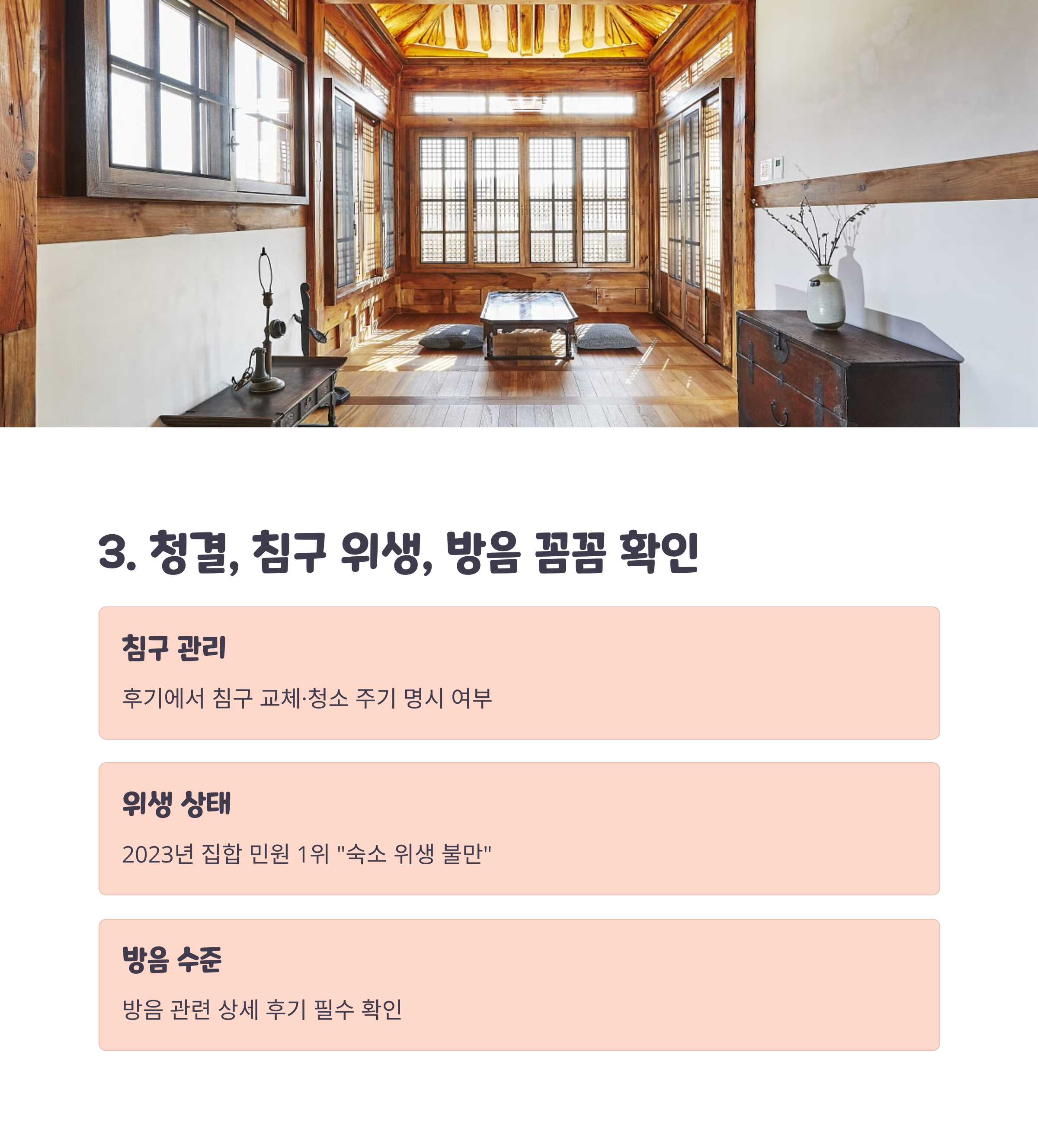 마지막으로 청결도, 체크인 안내, 환불 규정까지 꼼꼼히 봐야 합니다. 후기에서 침구의 청결 상태나 냄새, 바닥 위생 등 실제 이용 후기가 큰 도움이 됩니다. 또한 무인 체크인을 운영하는 경우, 안내 문구가 명확하고 절차가 쉬운지도 중요합니다. 숙소 정책도 놓치지 말아야 할 부분입니다. 반려동물 동반 가능 여부, 바비큐 시설 이용 가능 여부, 자쿠지 유무, 인원 제한, 환불 규정 등을 미리 확인하지 않으면 입실 시 문제가 될 수 있습니다.