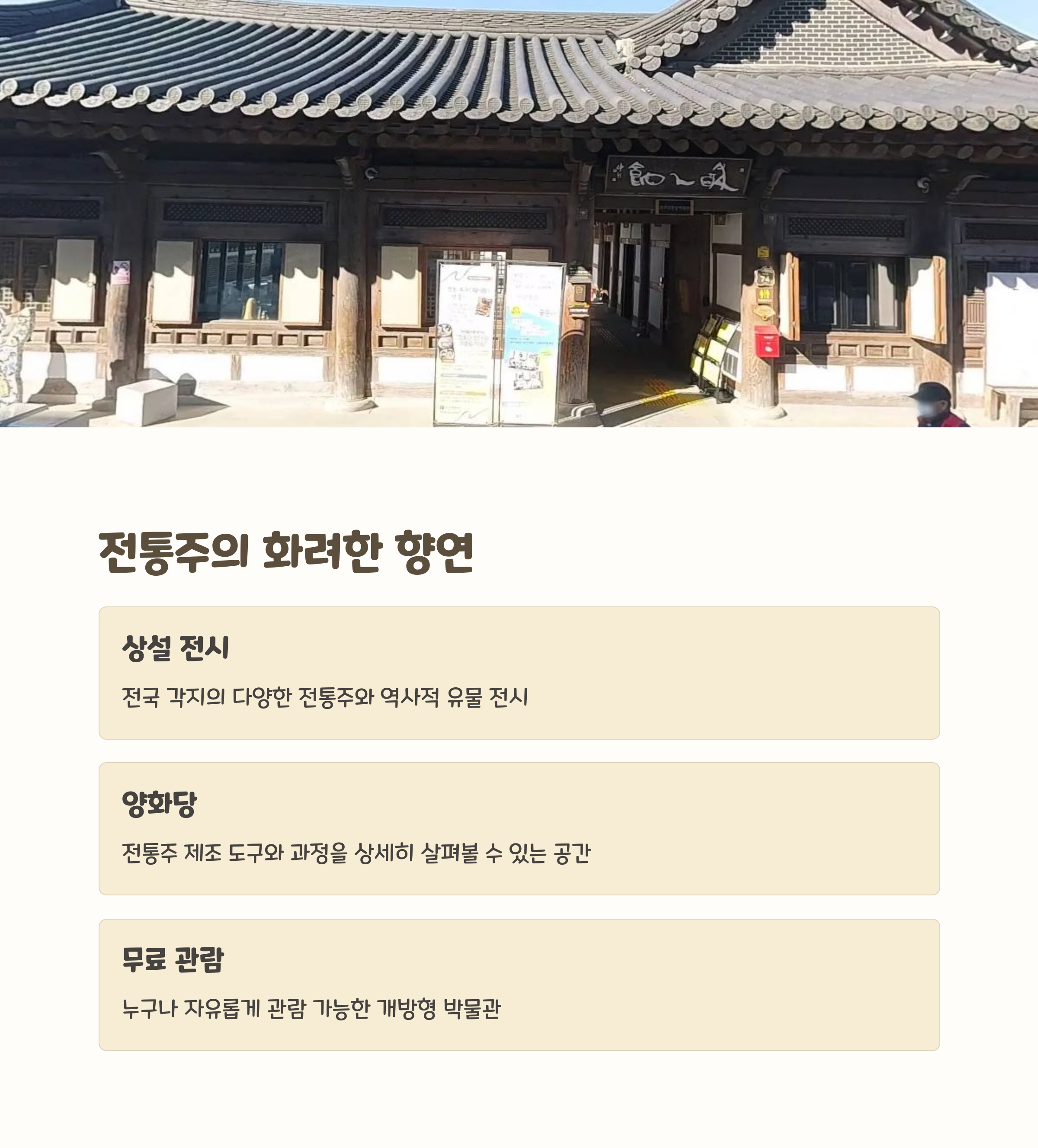 전주 전통술박물관은 전면 무료로 운영되고 있어 누구나 부담 없이 관람할 수 있습니다.