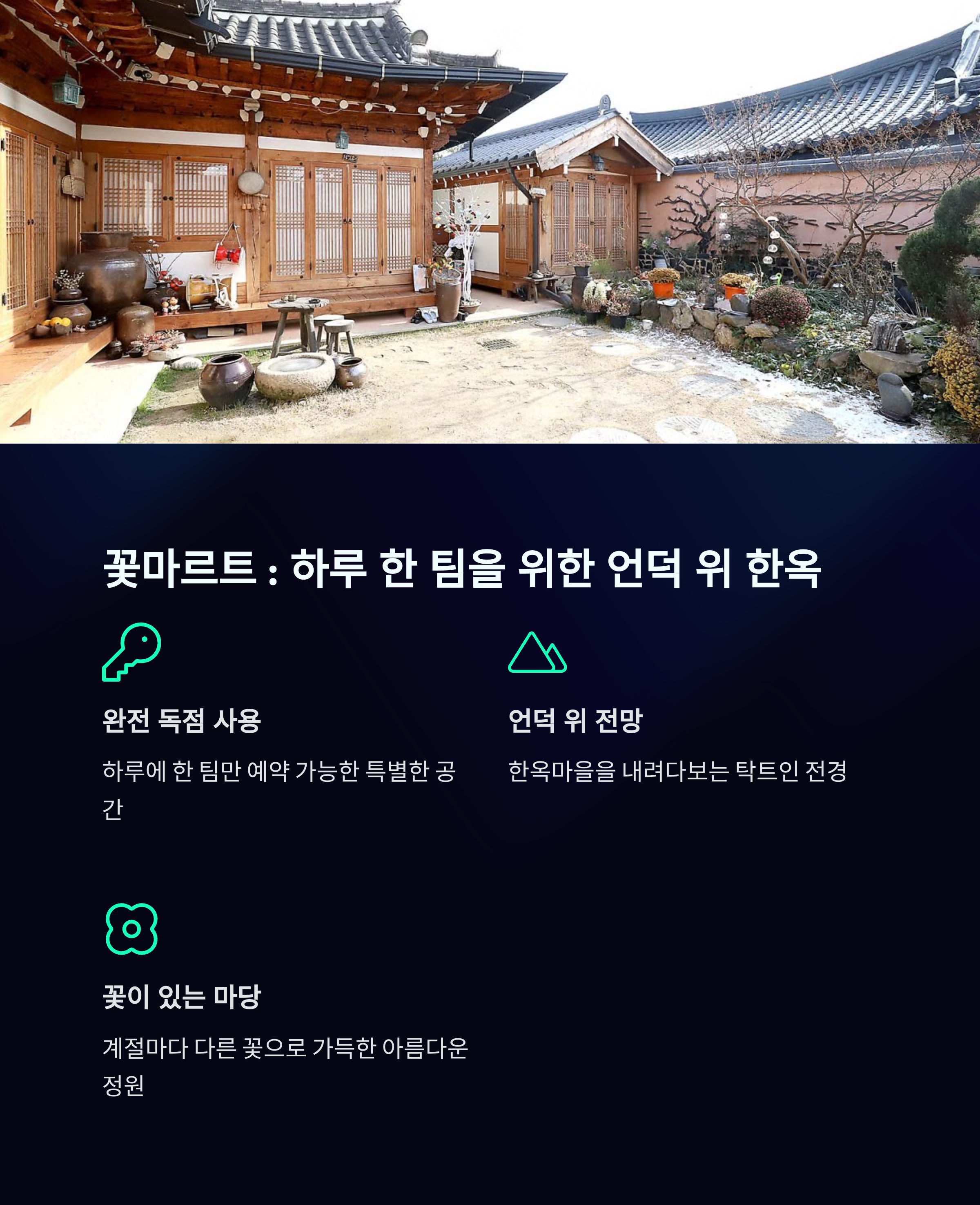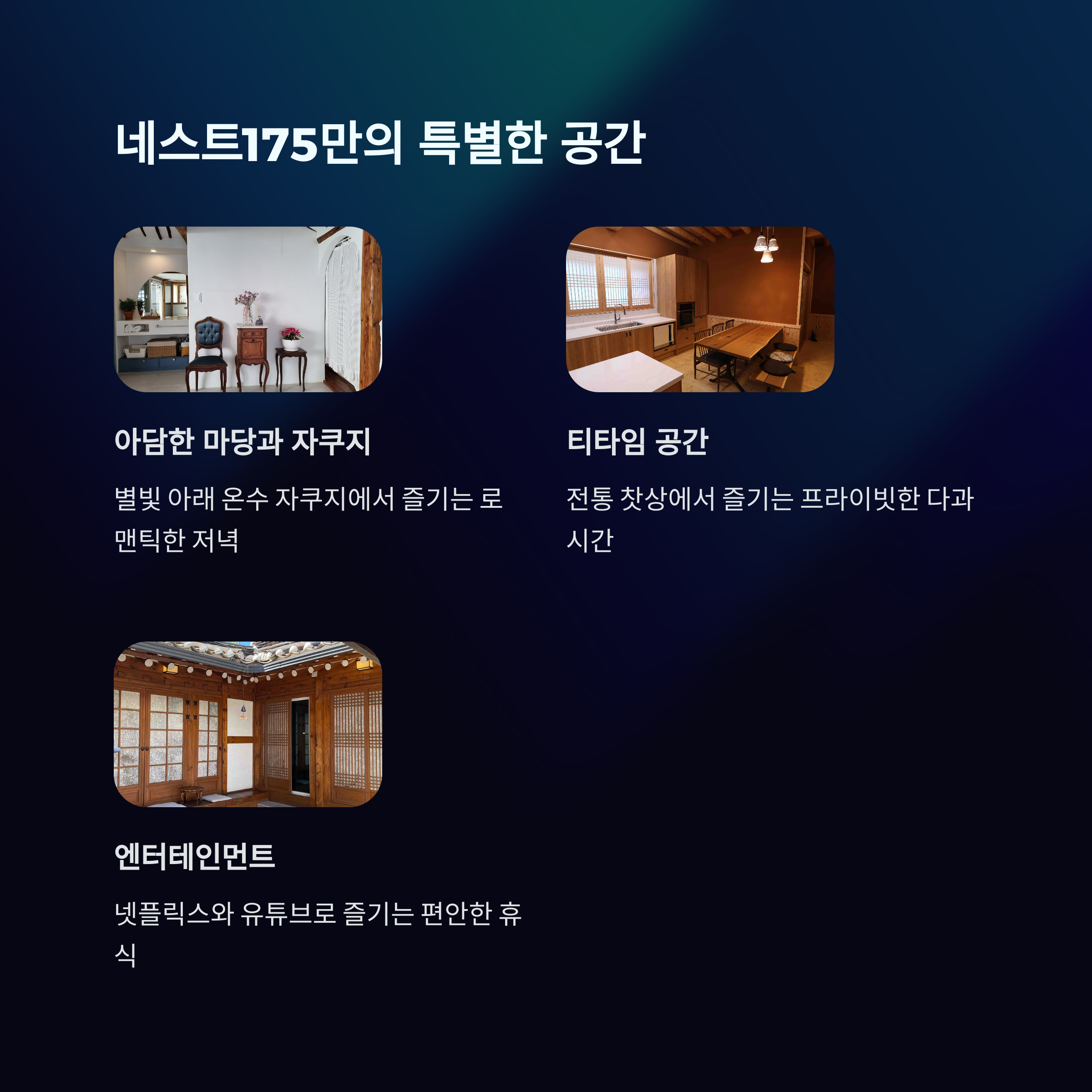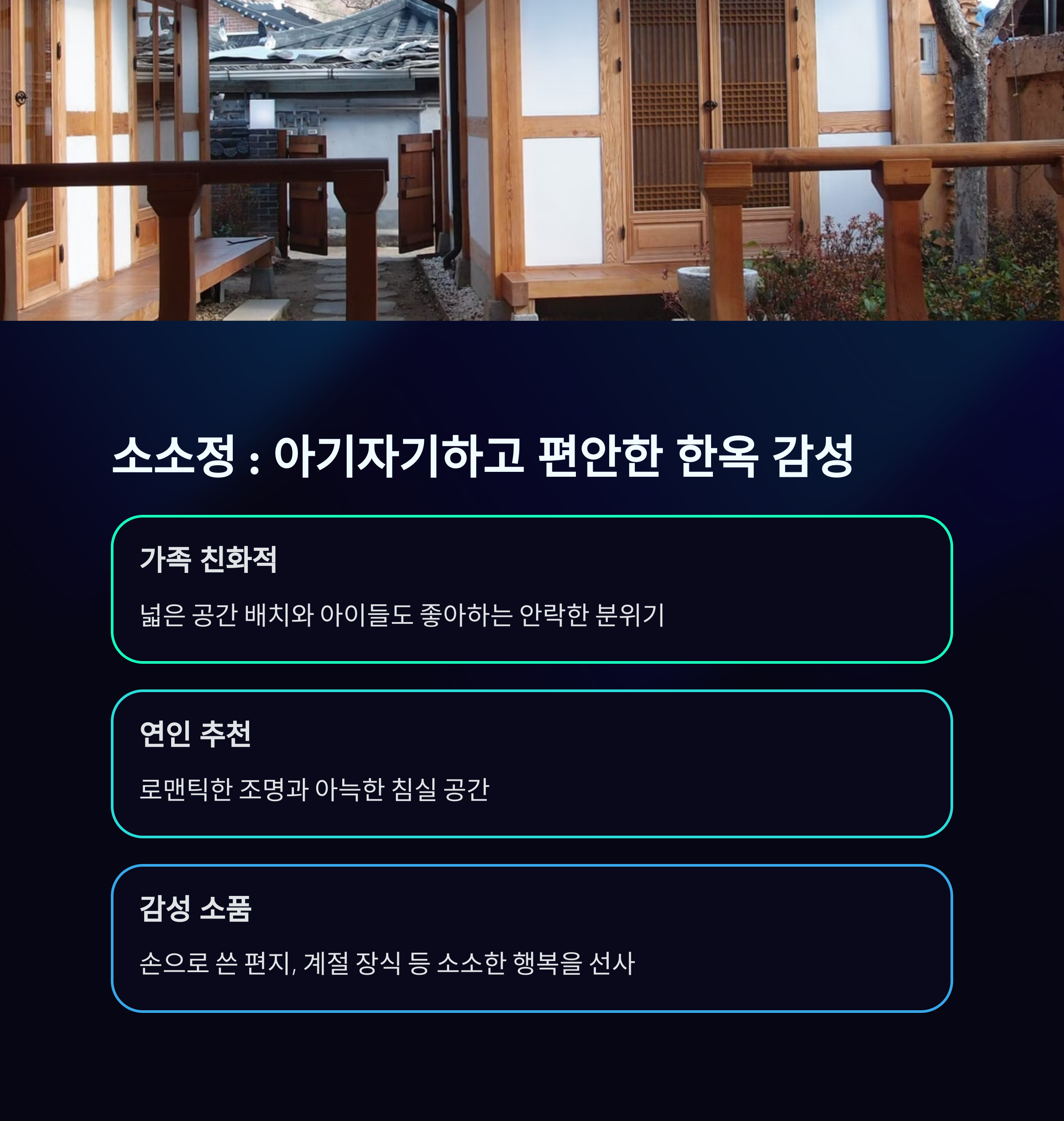 | 숙소 특징 | 전통미 + 모던 인테리어, 프라이빗한 마당, 자쿠지, 감성 티타임 공간 등 |