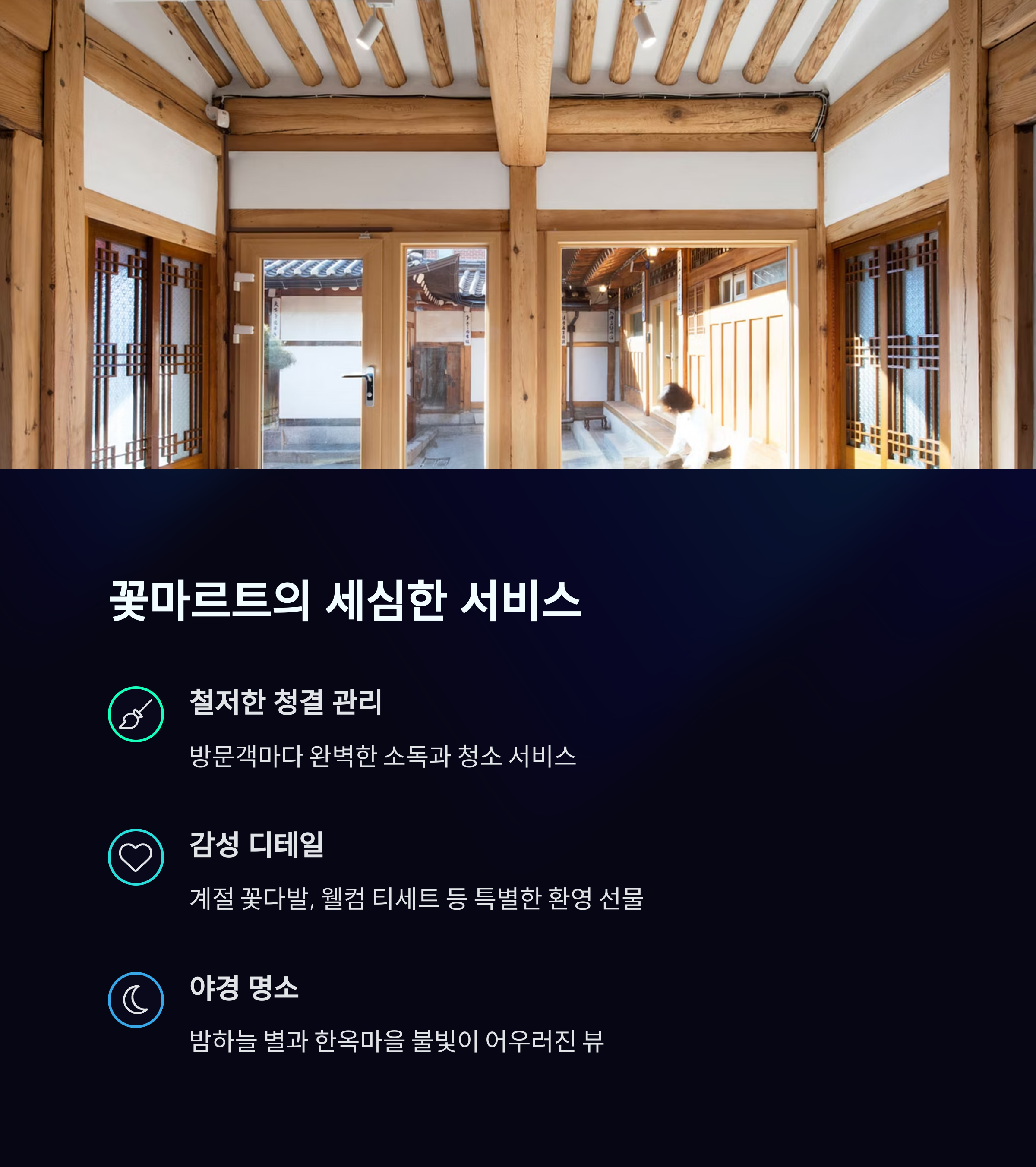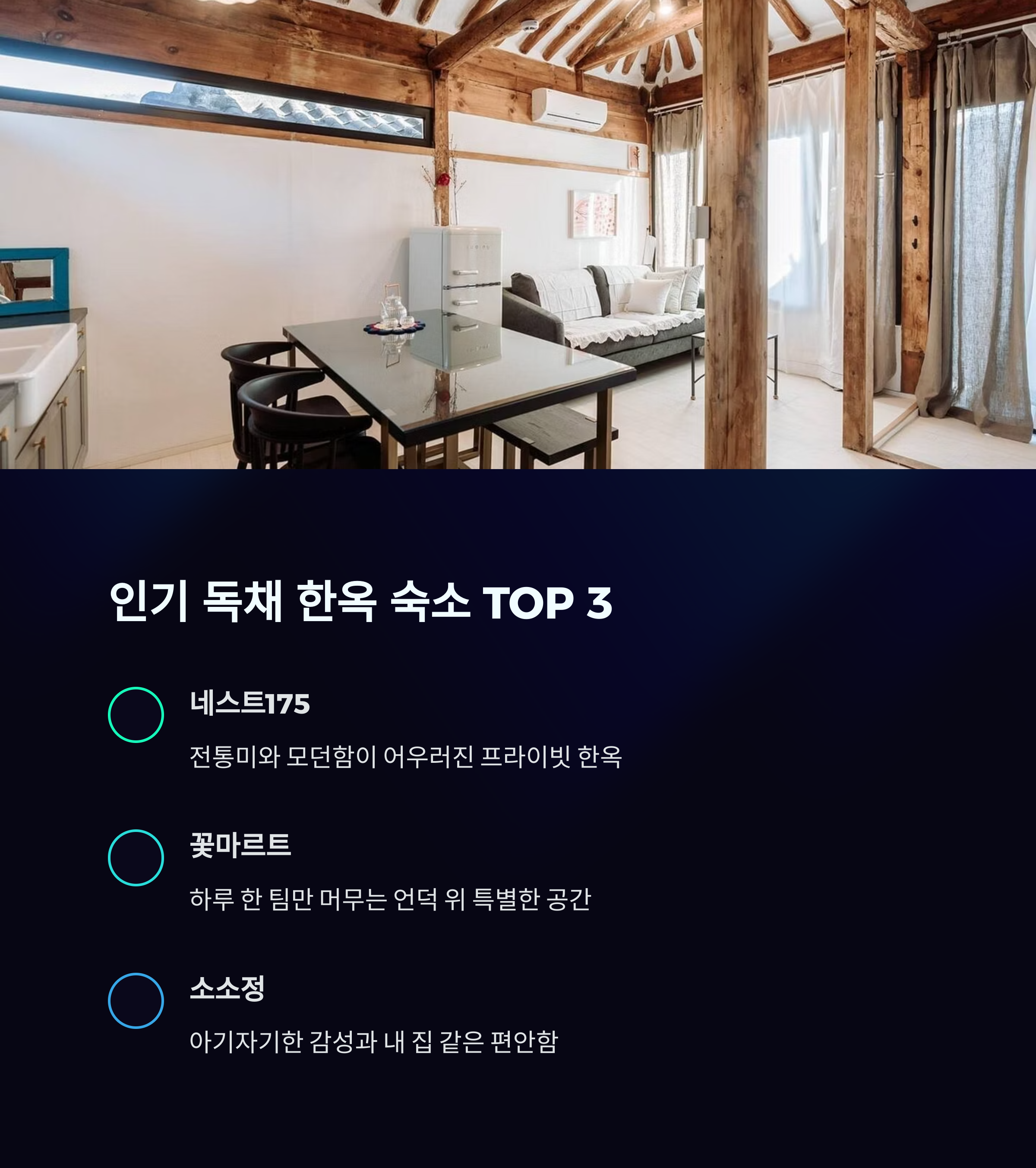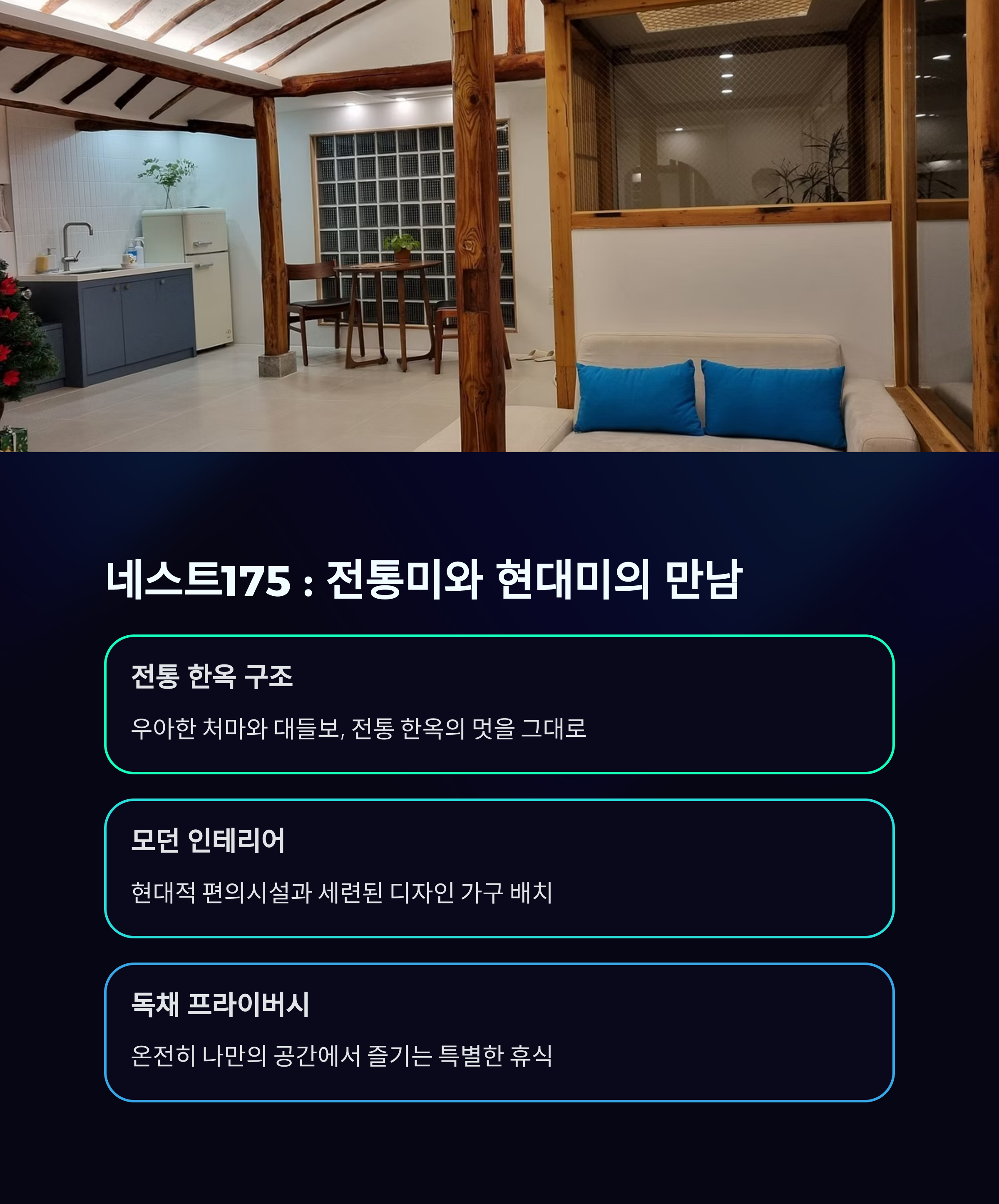 | 네스트175 - 자쿠지, 마당, 넷플릭스 | 꽃마르트 - 하루 한 팀, 감성마당 | 소소정 - 조용하고 따뜻한 한옥 |