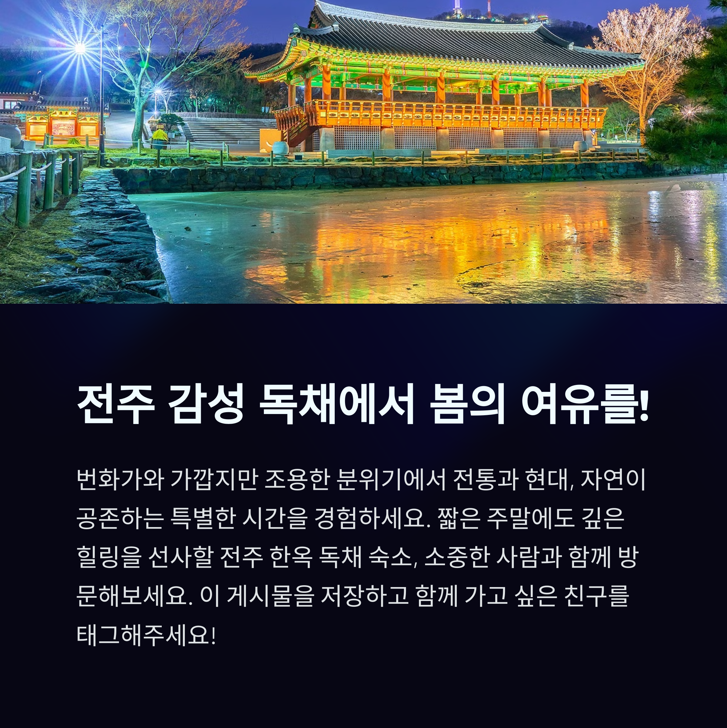 전주 한옥마을에서 머무는 하루는 고즈넉한 분위기와 감성적인 힐링이 공존하는 특별한 시간이 됩니다. 전통미를 살린 감성 독채 숙소는 특히 봄의 햇살과 어우러져 더 큰 여유를 선사합니다. 추천 숙소로는 네스트175, 꽃마르트, 소소정 등이 있으며, 각각의 매력을 지닌 독립형 한옥 공간에서 프라이빗한 휴식을 즐길 수 있어 연인, 가족 여행에 모두 잘 어울립니다. 한옥의 고즈넉함과 현대적인 편안함을 동시에 누릴 수 있는 이들 숙소는 한옥마을 주요 거리와도 가까워 전주 여행의 거점으로도 훌륭한 선택입니다.