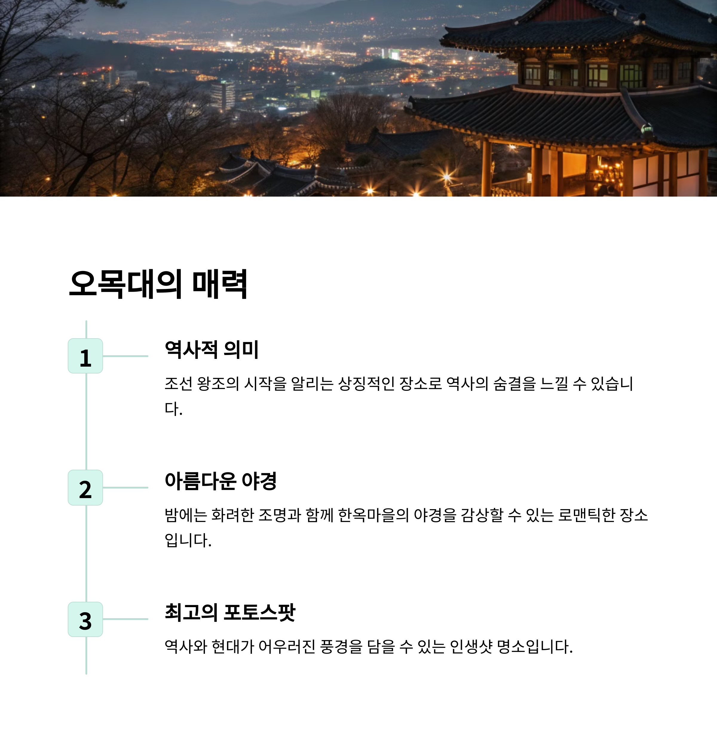 오목대는 낮에는 전주 한옥마을의 멋진 풍경을 감상할 수 있으며, 밤에는 야경이 아름다운 곳으로 유명합니다. 한옥마을과 함께 여유롭게 여행을 즐기려면 오후 늦은 시간에 방문한 후 밤이 되기 전에 조명이 켜지는 모습을 보는 것도 추천합니다.