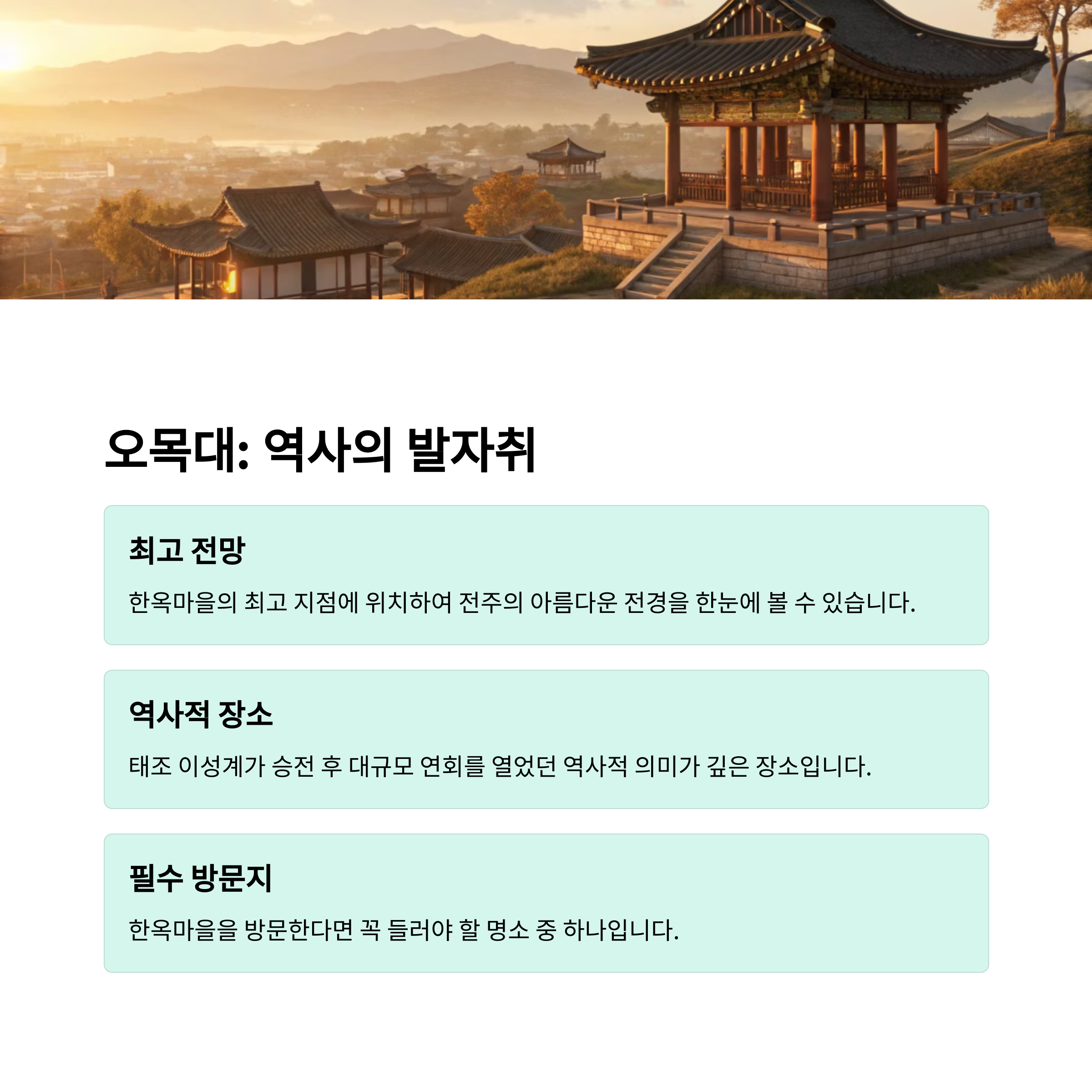 전주 한옥마을을 방문하셨다면, 오목대, 자만벽화마을, 한벽당까지 함께 둘러보며 더욱 풍성한 여행을 즐겨보세요! 전주의 역사와 예술, 자연이 조화롭게 어우러진 이들 명소에서 특별한 추억을 남기시길 바랍니다.