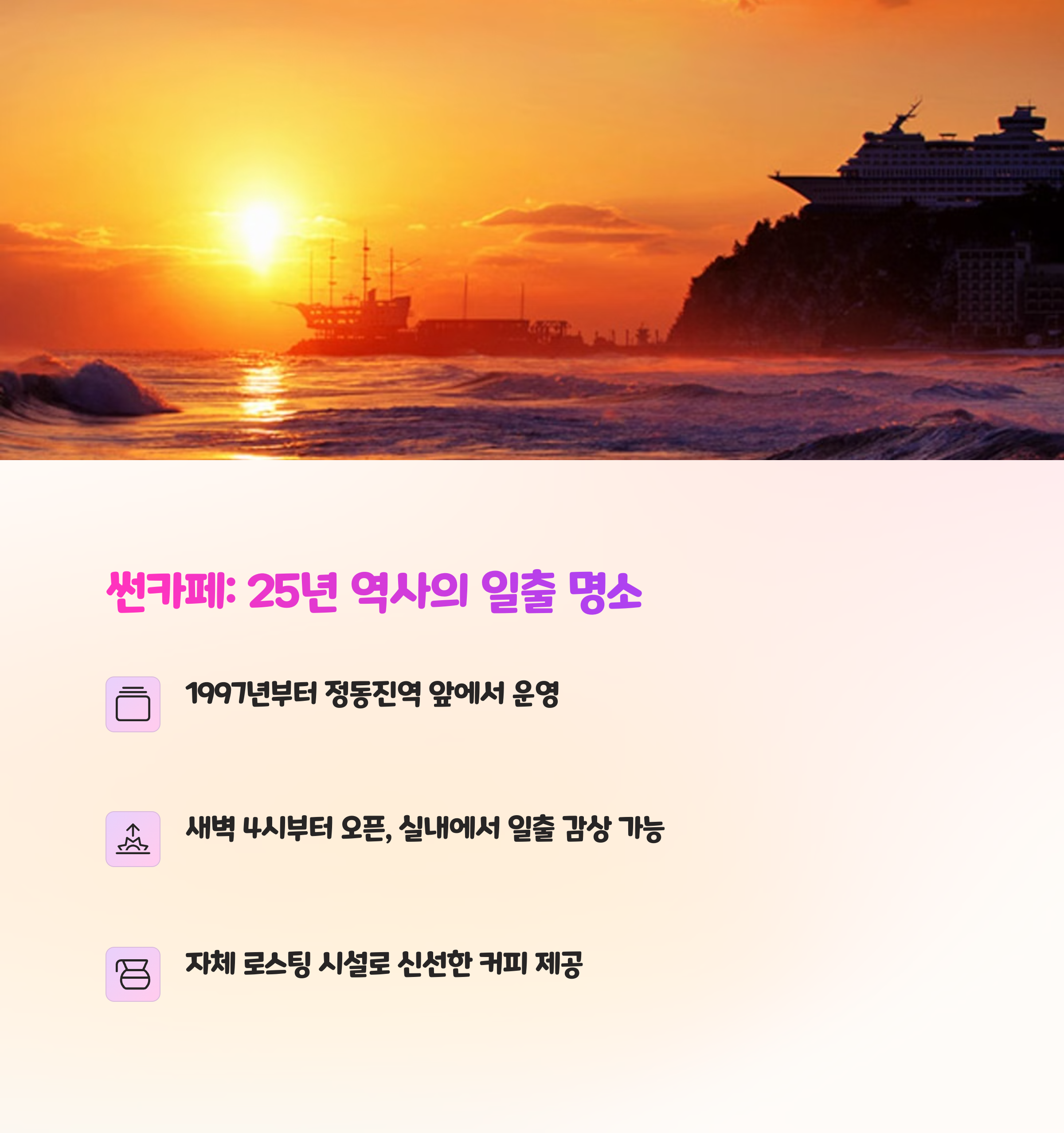 | 썬카페 | 정동진역 앞, 새벽 4시 오픈, 일출 감상 대표 카페 |