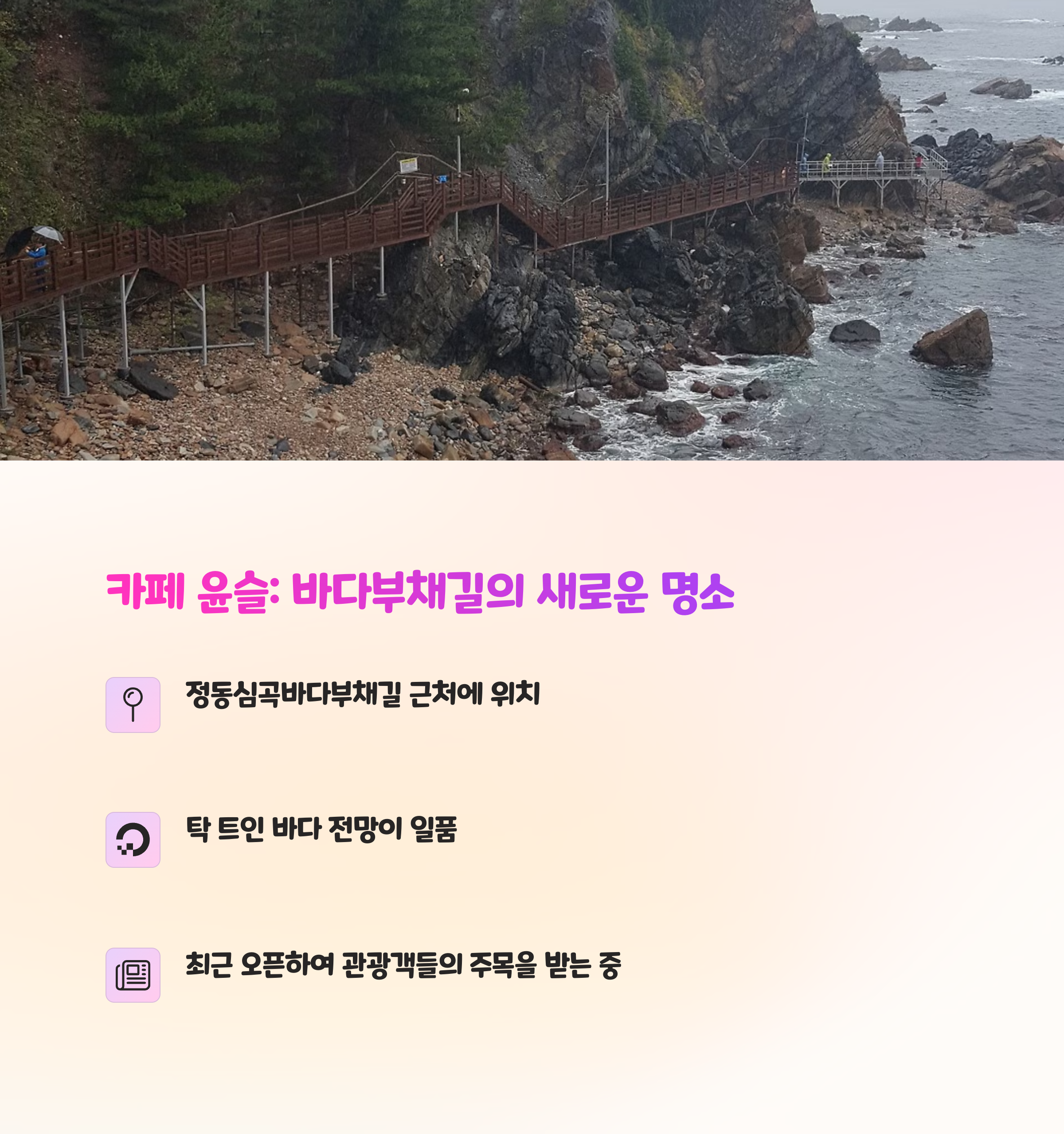 최근 주목받고 있는 '카페 윤슬'은 정동진 바다부채길 초입에 위치해 있어, 걷기 전후로 들르기 좋은 위치입니다. 넓은 유리창을 통해 탁 트인 동해의 풍경이 펼쳐지며, 일출뿐만 아니라 맑은 낮바다, 노을 지는 하늘까지 다양한 분위기를 담아낼 수 있습니다. 깔끔하고 세련된 인테리어와 함께 디저트와 커피 메뉴도 만족도가 높아 감성적인 여행을 원하는 분들에게 특히 추천됩니다.