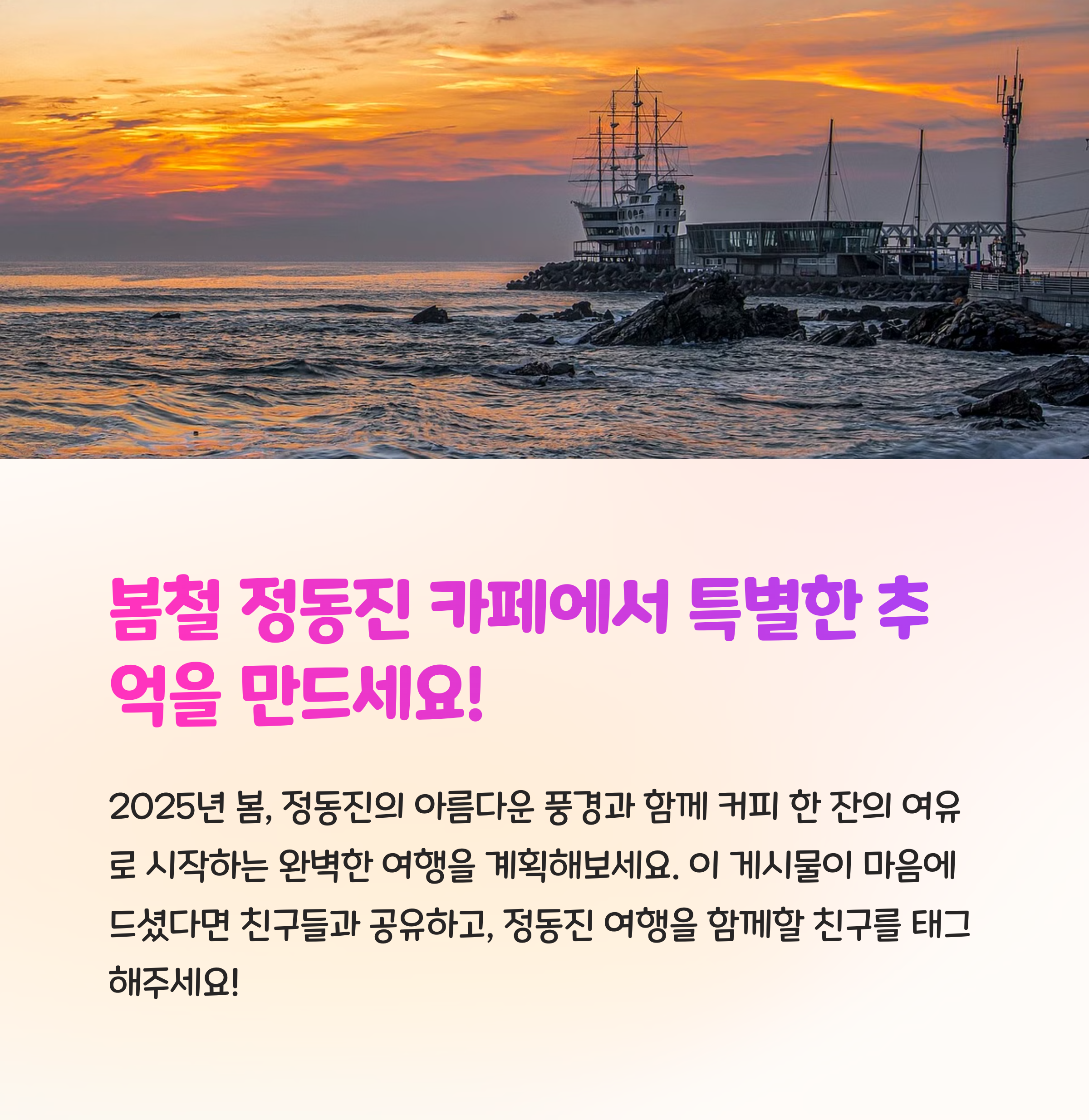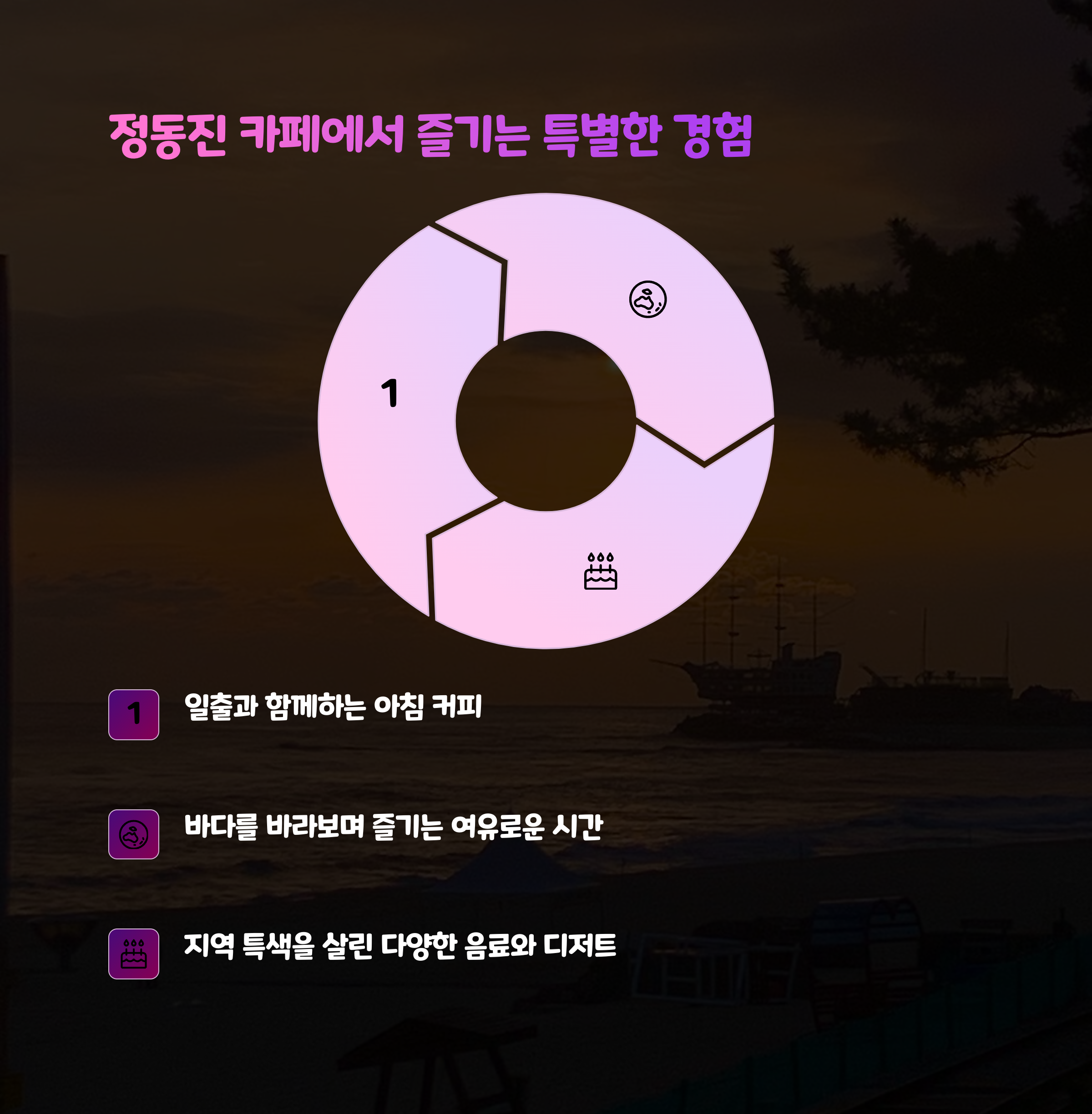 해가 떠오르는 순간, 따뜻한 커피 한 잔과 함께 바라보는 정동진의 바다는 여행 중 만날 수 있는 가장 특별한 선물입니다. 강릉의 대표 해돋이 명소인 정동진은 매년 수많은 여행객이 찾는 곳으로, 일출을 감상하기 좋은 카페들이 속속 등장하면서 더욱 주목받고 있습니다. 특히 1997년부터 자리를 지켜온 '썬카페'는 정동진역 바로 앞에 위치해 있어, 새벽 4시부터 문을 열고 실내에서 따뜻하게 일출을 감상할 수 있는 곳으로 사랑받고 있습니다. 직접 로스팅한 원두의 풍미는 아침 바다와 함께 깊은 인상을 남겨줍니다. 이번 글에서는 일출의 감동과 향긋한 커피를 동시에 즐길 수 있는 정동진의 대표 카페들을 소개해드립니다. 여행의 시작을 따뜻하게 열어줄 공간을 만나보세요.