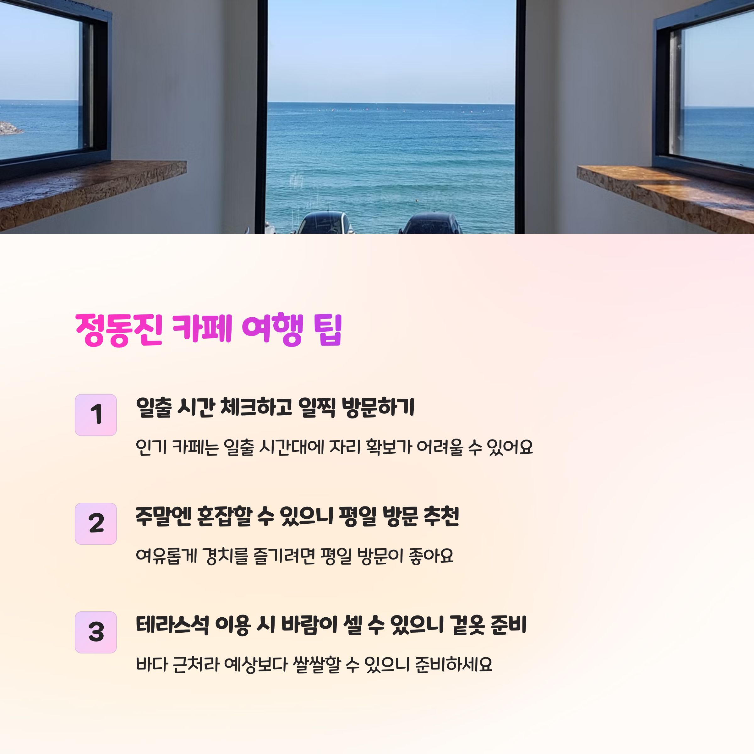 | 썬카페, 윤슬, 커피인터뷰 등 바다뷰 카페 소개 | 정동진역 앞에서 새벽에 즐기는 동해 일출 명소 | 정동진 바다부채길, 하슬라아트월드 인근 카페 탐방 |