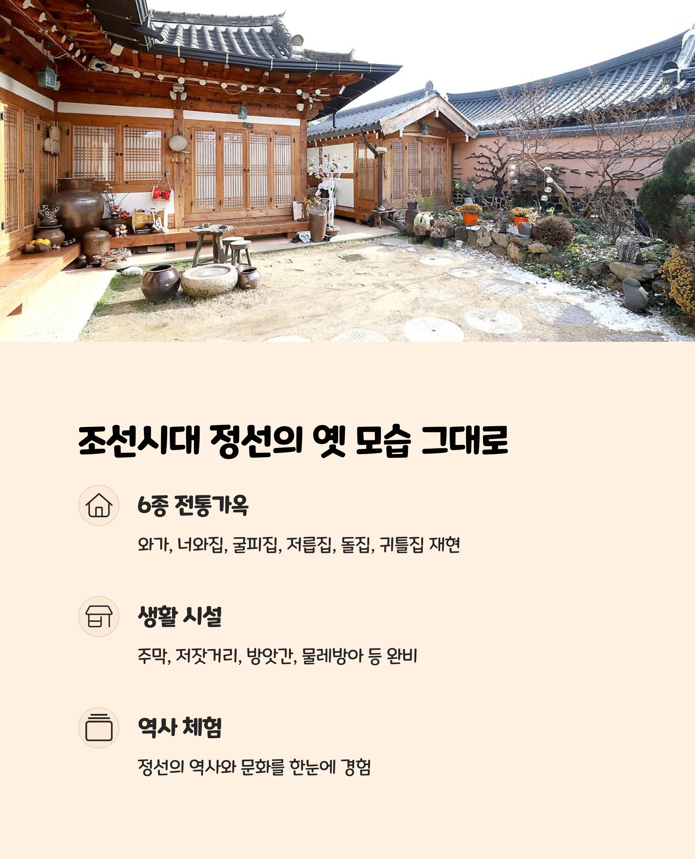 | 와가, 귀틀집 등 조선 주거 양식 실물 전시 | 민속놀이, 양반증서, 정선아리랑 체험 운영 | 누구나 자유롭게 방문 가능한 열린 공간 |