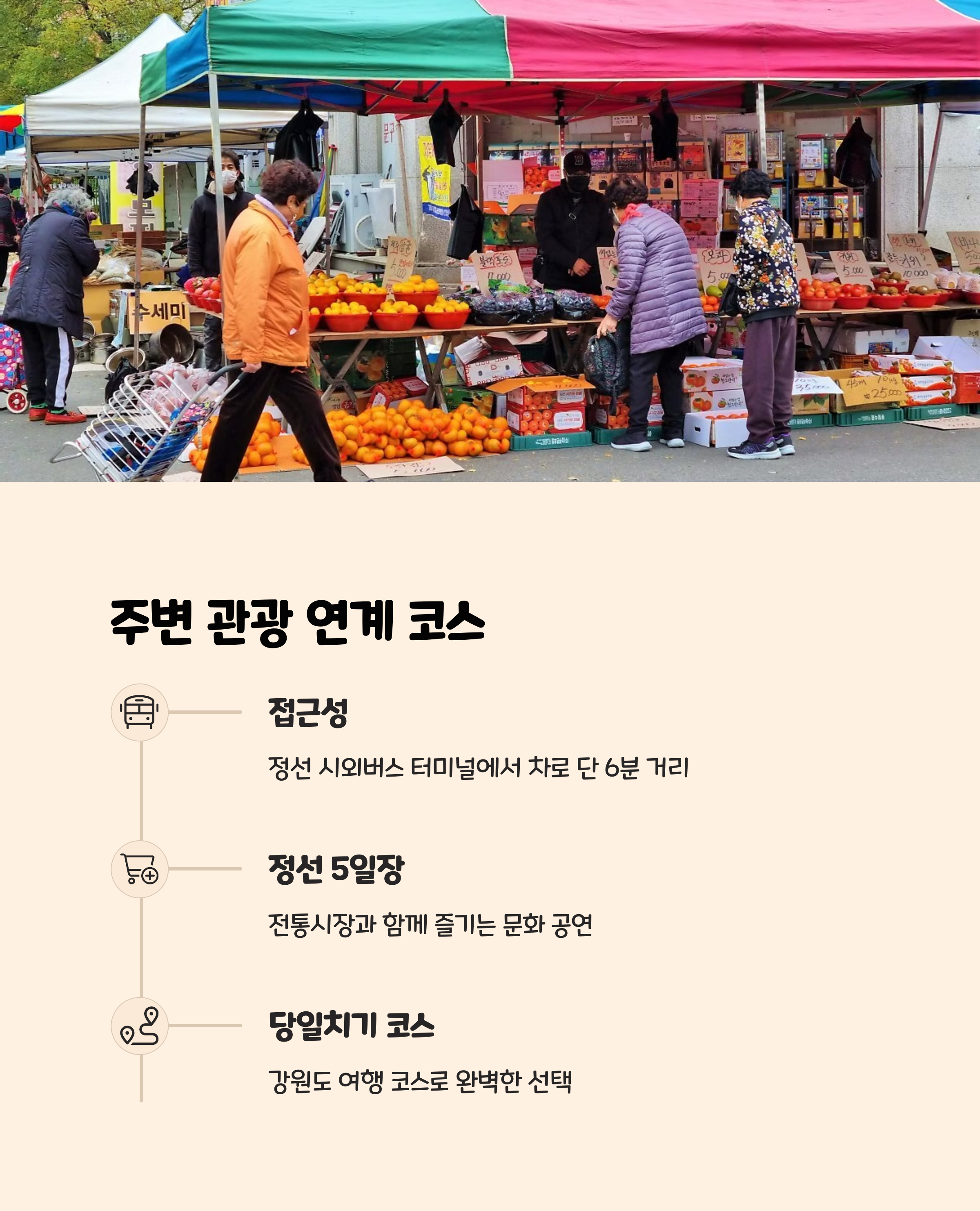 정선 5일장, 아우라지, 정암사 등이 인근에 위치해 있어 당일치기 또는 1박 2일 코스로 함께 여행하기에 매우 좋습니다.