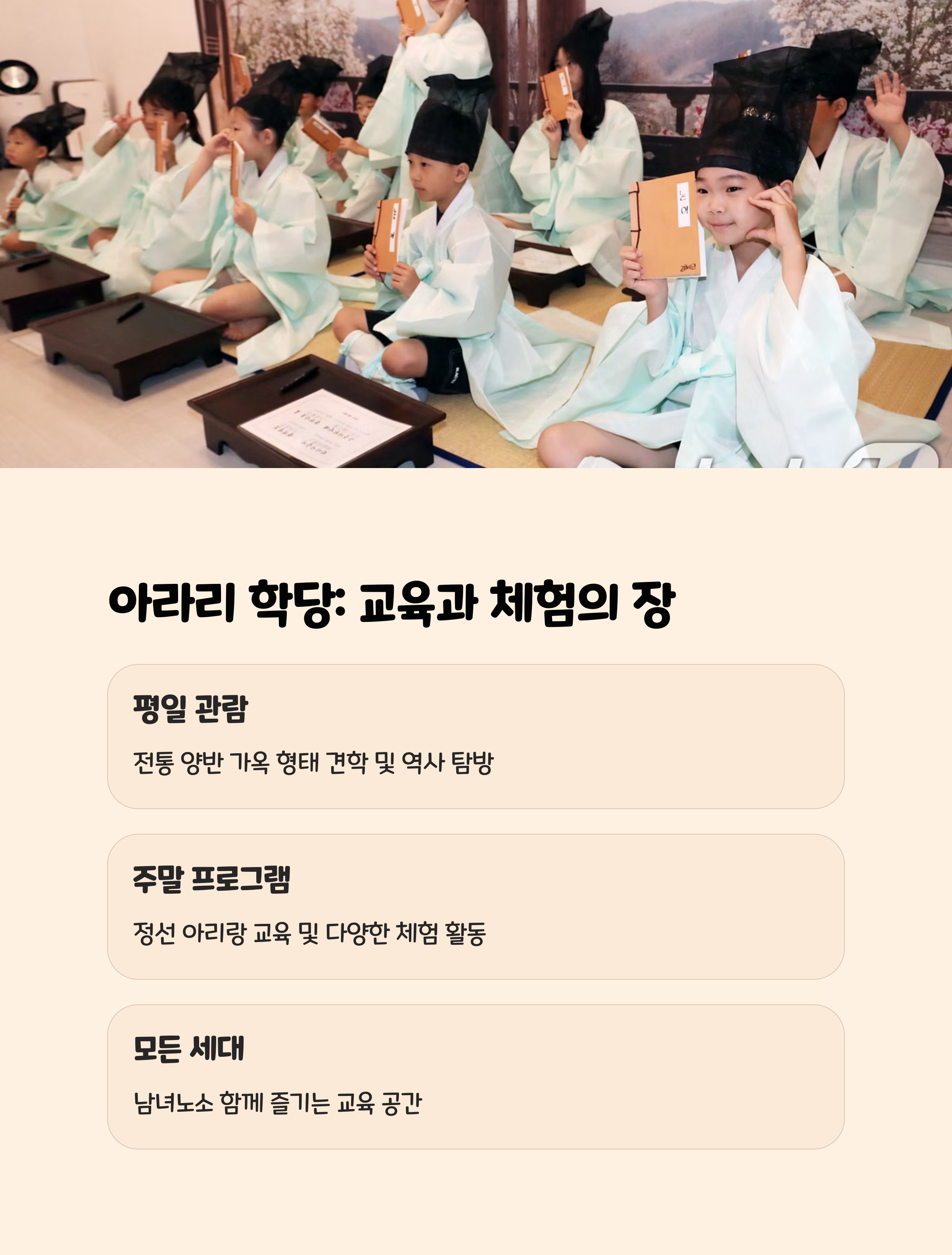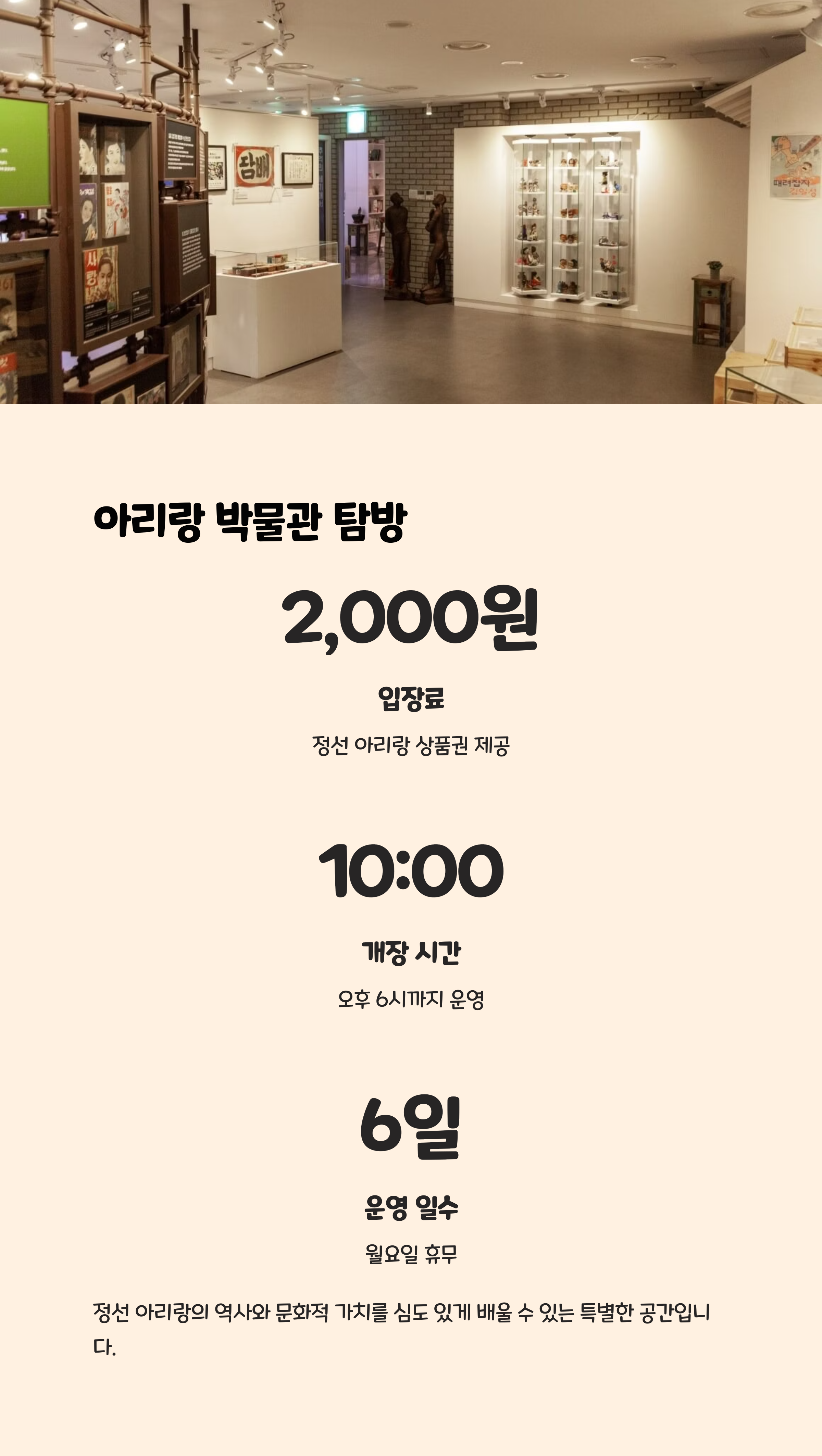 전통과 자연을 함께 느끼고 싶은 여행자라면 정선 아라리촌은 꼭 한번 방문해볼 만한 가치가 있는 명소입니다. 입장료와 주차 모두 무료로 부담 없으며, 다양한 전통 체험과 교육적 요소를 고루 갖춘 이 마을은 아이들과 함께하는 가족 여행지로도 매우 적합합니다. 계절마다 다른 풍경을 간직하고 있어, 봄·가을의 단풍 산책이나 겨울 설경 탐방에도 안성맞춤입니다. 조선의 삶을 현대에 재현한 정선 아라리촌에서 여유롭고 깊이 있는 하루를 보내보시기 바랍니다.