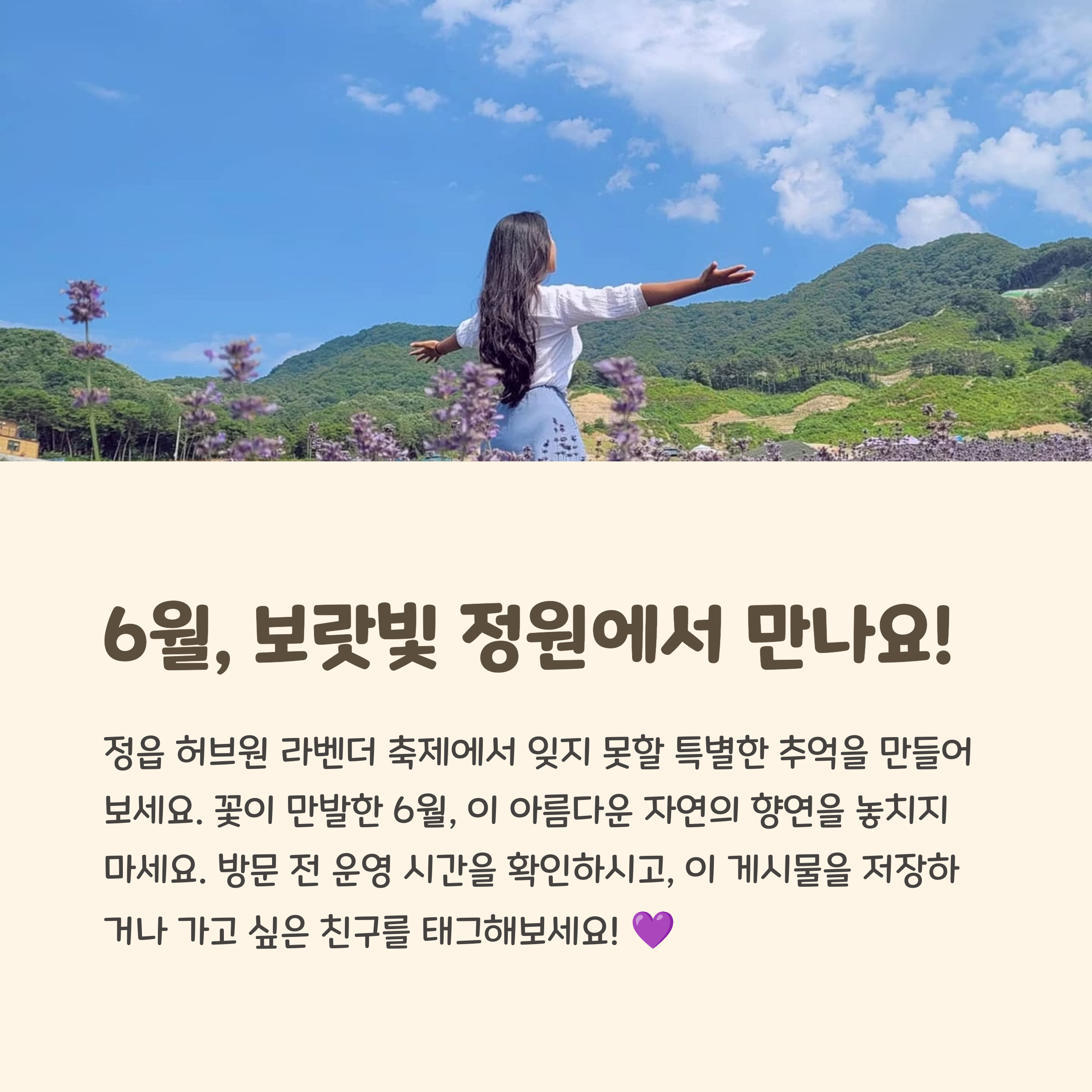 정읍 허브원 라벤더축제는 보랏빛 라벤더와 초록 산책로, 인생샷 명소, 편의시설까지 완벽하게 갖춘 6월 최고의 힐링 명소입니다. 꽃향기 가득한 정원에서 여유롭게 걷고, 아름다운 순간을 담아보는 주말 어떠세요?