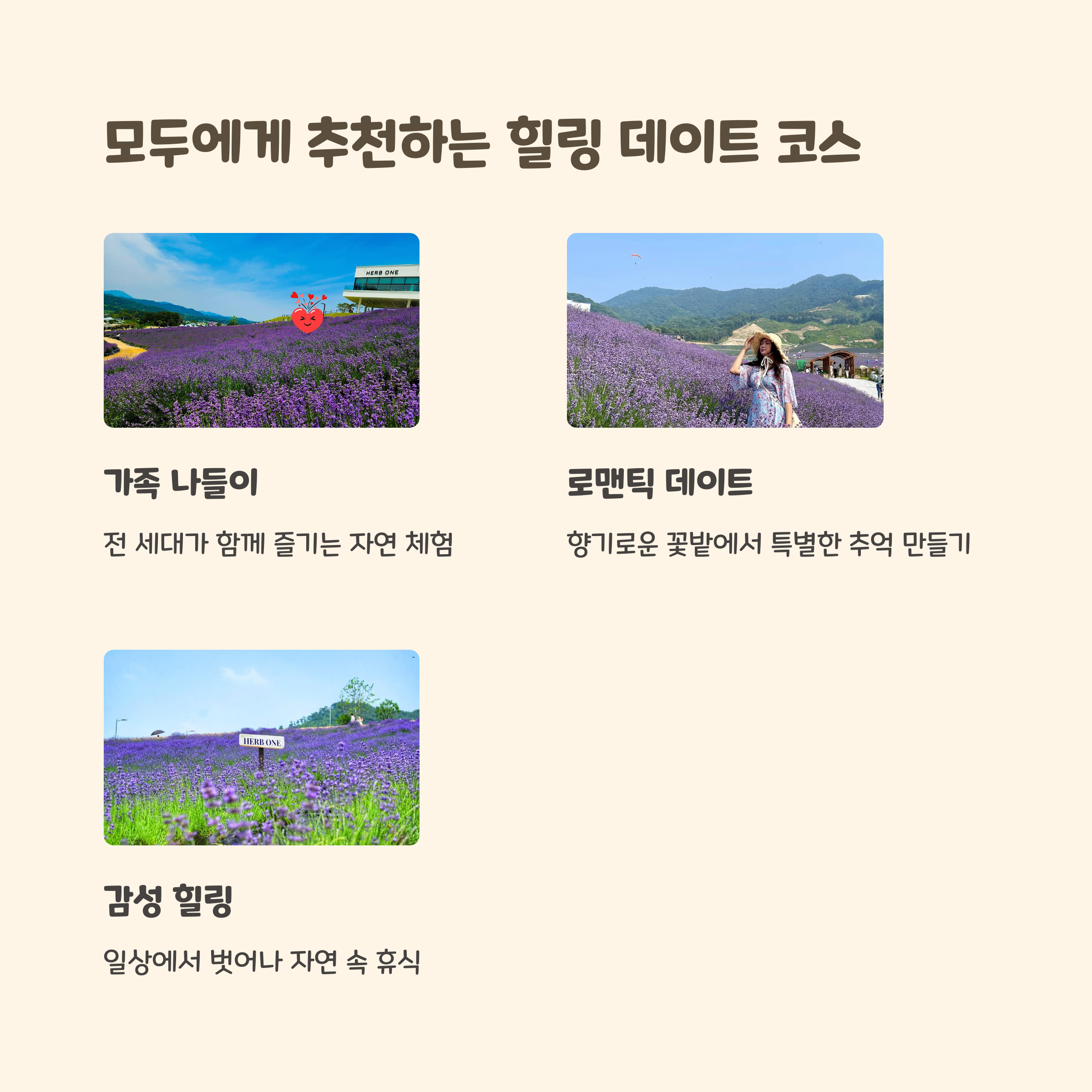 | 주요 포인트 | 라벤더밭, 루프탑 전망대, 코스모스밭, 고인돌 조형물, 허브카페, 정원 산책로 |