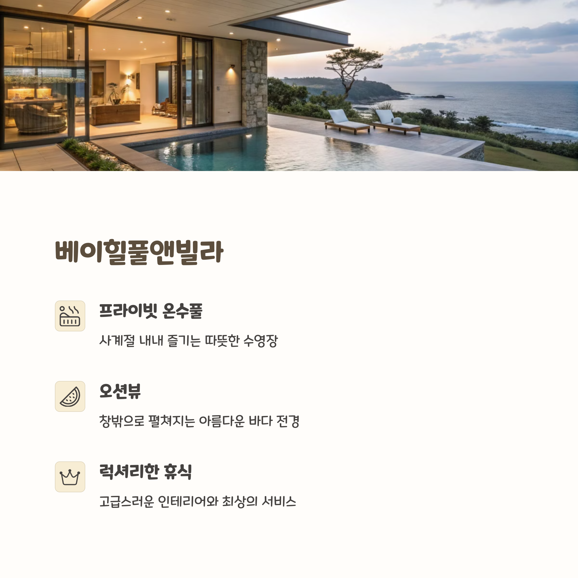 특별히 소개하고 싶은 숙소는 제주 리버풀앤스파 펜션입니다. 협재 해수욕장에서 가까운 위치로 바다 산책 후 온수풀에서 휴식을 즐길 수 있어 사계절 내내 매력적인 공간입니다. 성산읍에 위치한 마이올제주는 오션뷰가 보이는 현대적인 풀빌라로 인테리어와 시설 모두 고급스러운 감성을 담고 있으며, 조용하고 여유로운 휴식을 원하는 분들에게 특히 추천할 만한 숙소입니다.