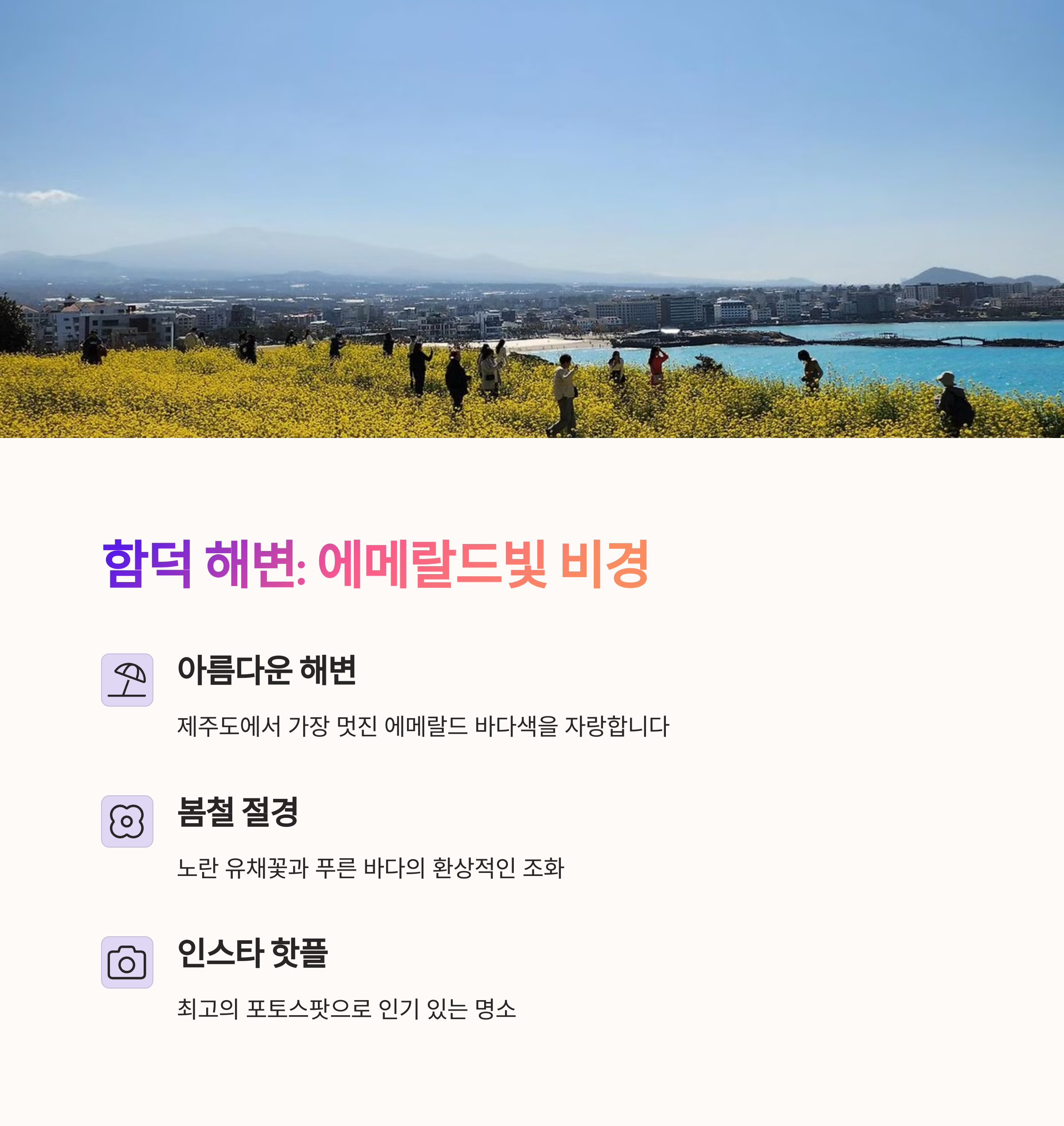 제주도 동쪽에 위치한 함덕 해변은 바다 색깔이 유독 아름답기로 유명합니다. 바다 위로 펼쳐진 옥빛 수평선과 잔잔한 파도, 그리고 해변 주변의 유채꽃밭은 봄철 사진 명소로도 손색이 없습니다. 가족, 연인, 혼자 여행하는 이들에게도 편안한 분위기를 선사하며, 간단한 산책이나 카페 투어를 하기에도 좋은 곳입니다.