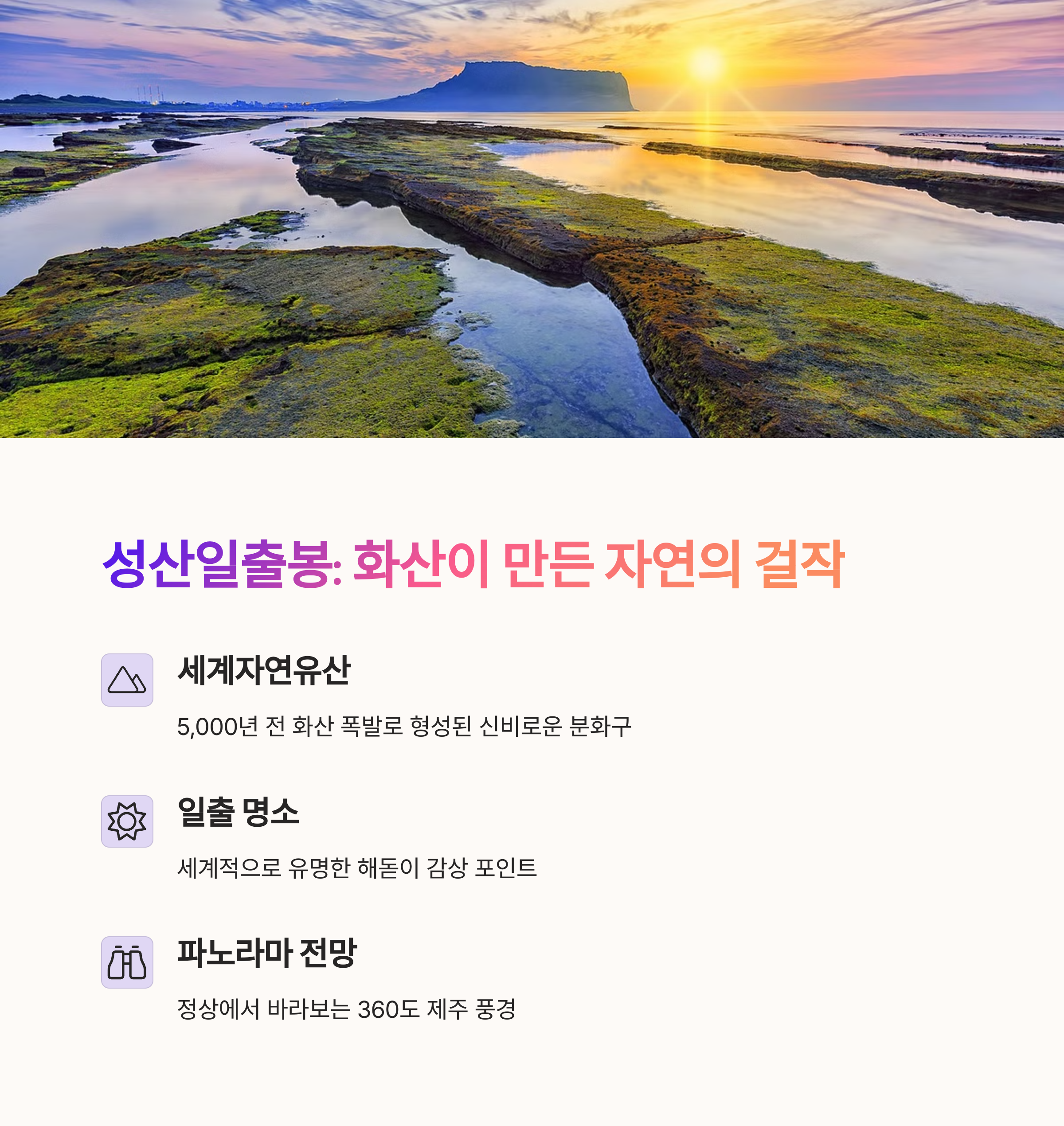 성산일출봉은 제주 동쪽 여행에서 빼놓을 수 없는 명소입니다. 유네스코 세계자연유산으로 등재된 이곳은 약 5,000년 전 해저 화산 활동으로 형성된 분화구로, 일출이 아름답기로 소문나 많은 사람들이 이른 아침부터 정상으로 오릅니다. 비교적 완만한 경사로 구성되어 있어 남녀노소 누구나 오를 수 있으며, 정상에서 내려다보는 바다 풍경은 말 그대로 장관입니다.