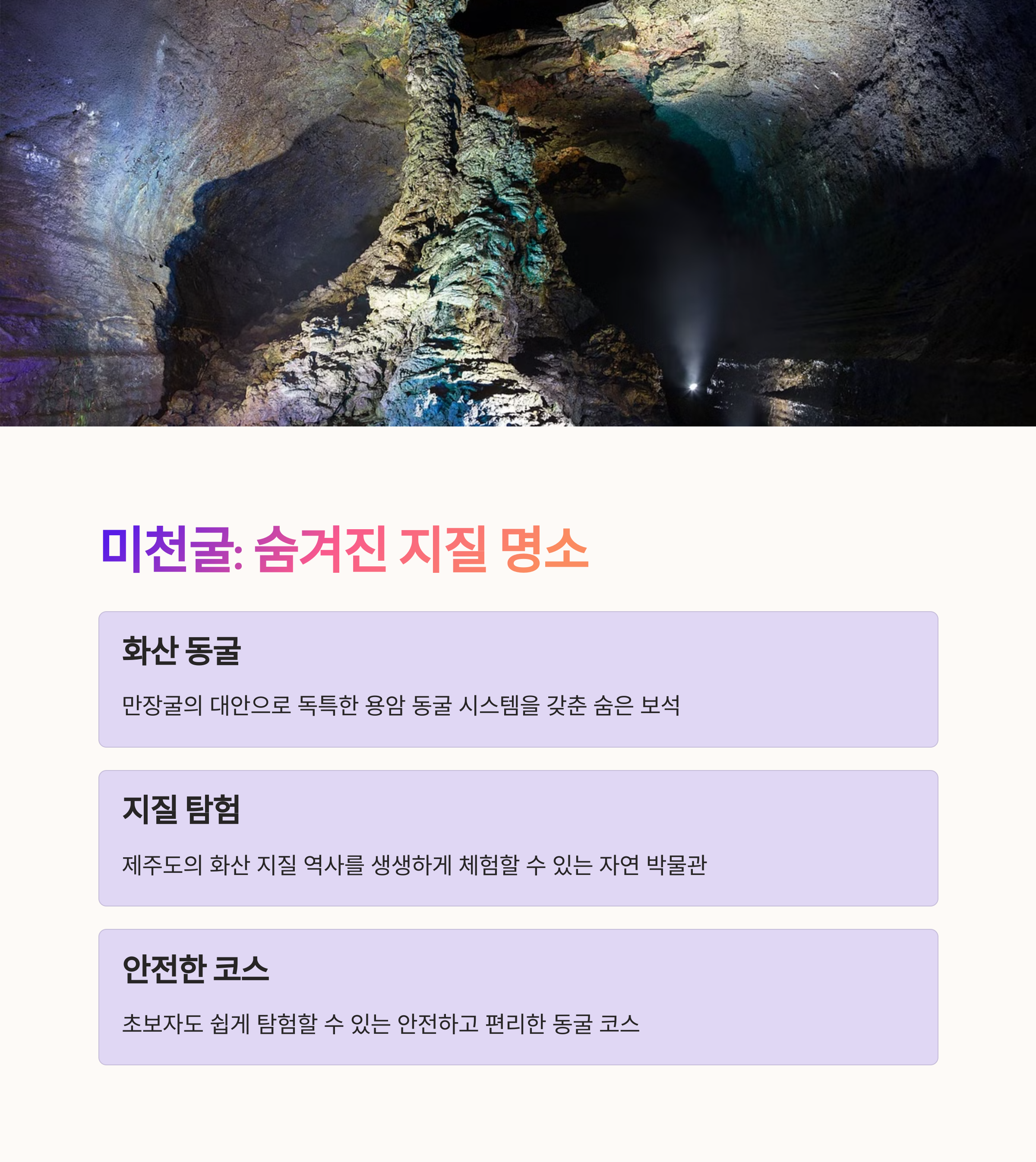 | 함덕 해변, 성산일출봉, 유채꽃 풍경 | 성읍민속마을, 제주 옛 가옥, 전통 체험 | 미천굴, 용암동굴 지질 탐방, 라바 튜브 |